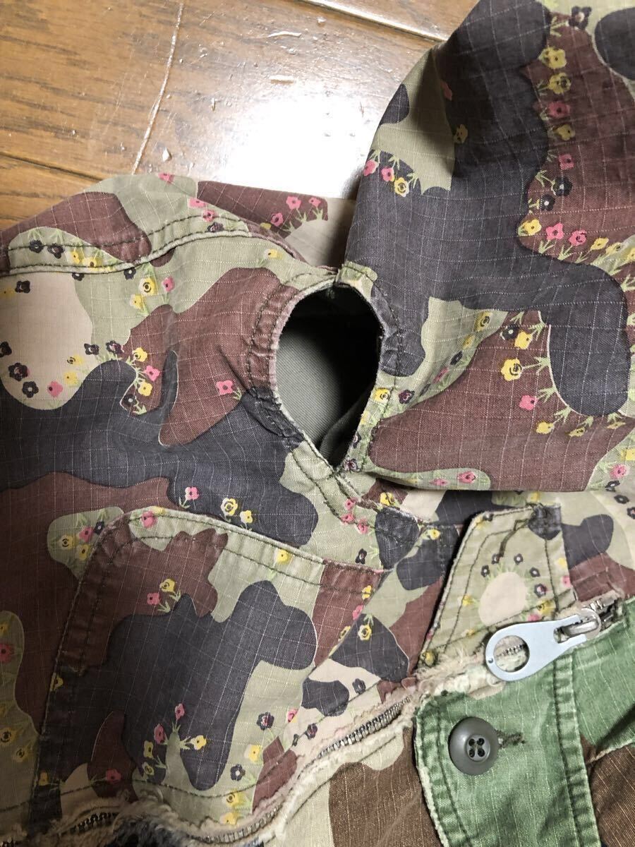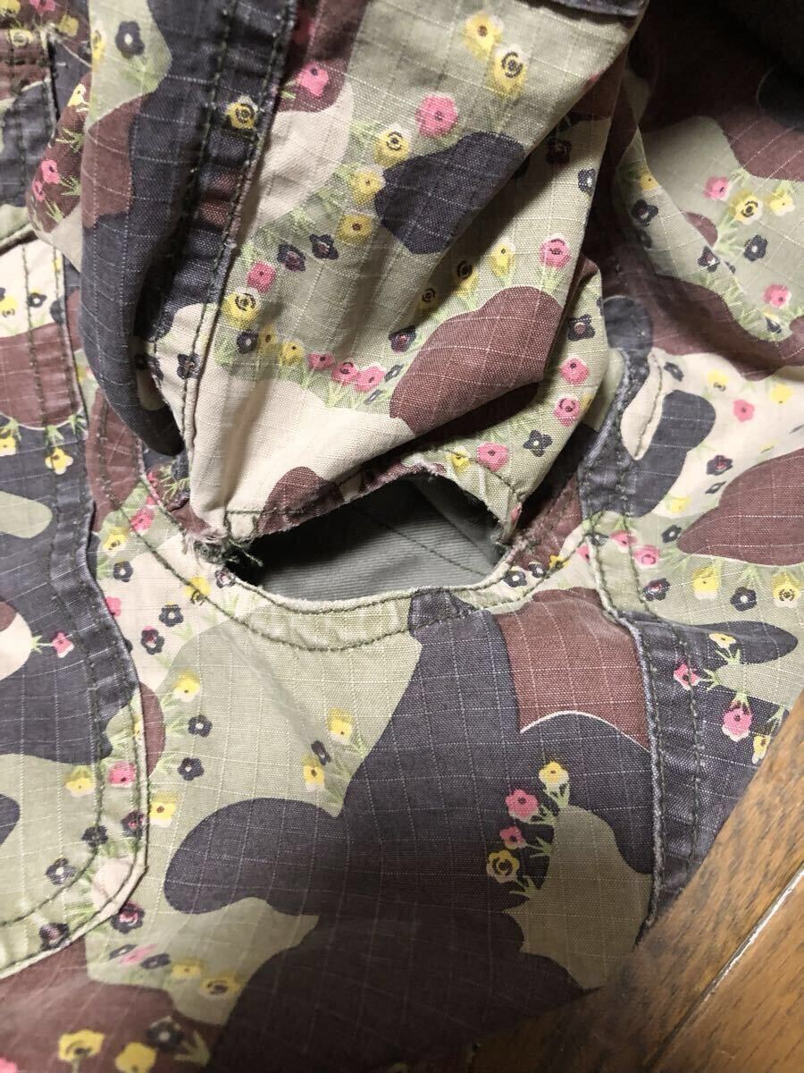 元々ユーズド加工されており、所々に切りっぱなしの箇所があります。脇は元々空いているデザインですが、若干ほつれがあります(写真参照)。