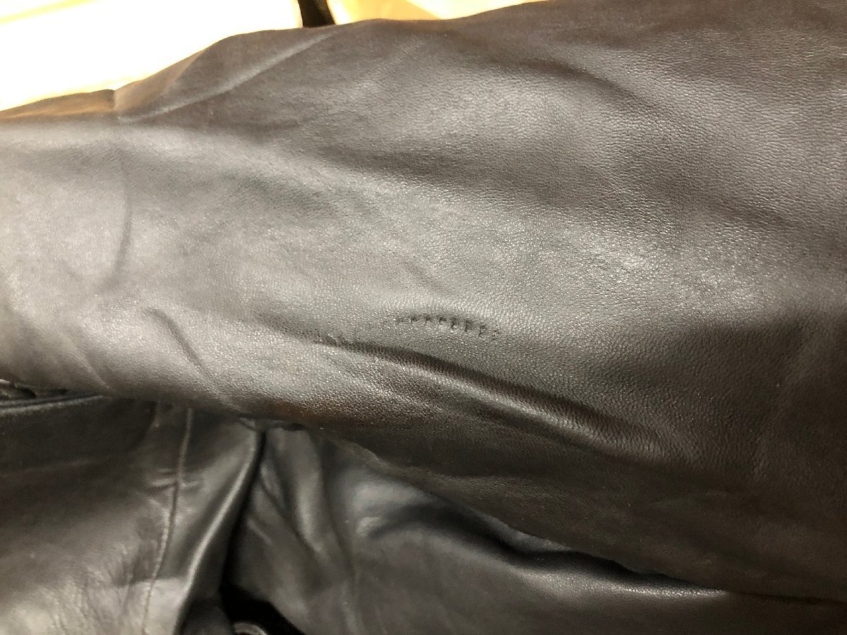 中古品です。使用感があります。全体の所々に経年によるレザー特有の擦れとアタリと小さなキズ、袖に凹み跡がありますが、他に大きなダメージはありません。