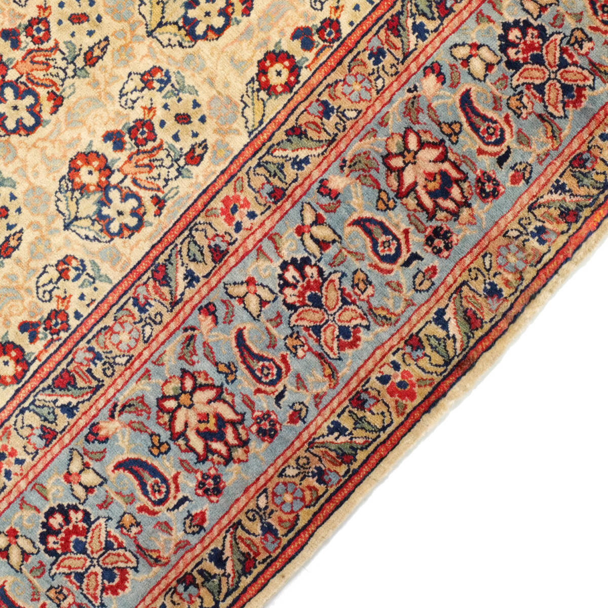 生成りのベースに赤や黒、青緑、えんじなどのアクセントが映え、全体として上品でクラシカルな印象に。高密度に織り込まれたしっかりとした厚みと、滑らかなパイルは、実用性と美しさを兼ね備えています。