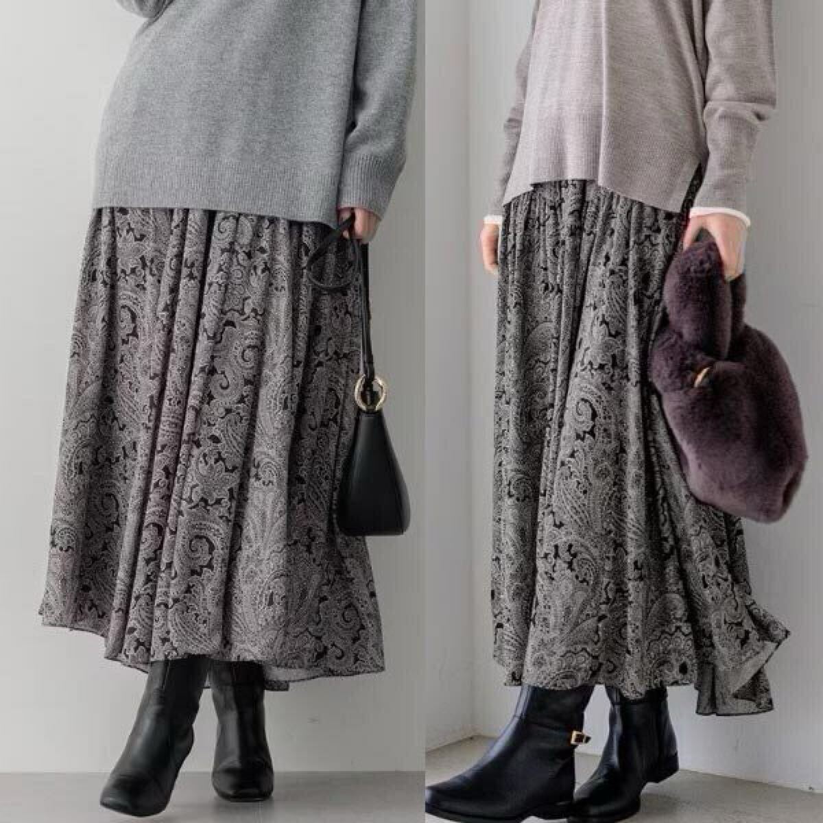 ペイズリー柄が冬のスタイリングに華やぎを与える、プリントスカート