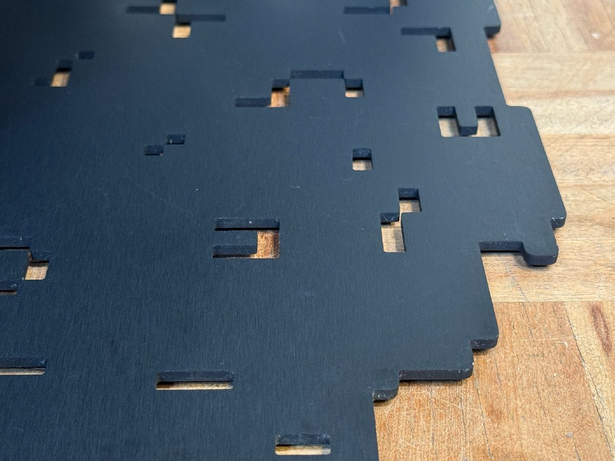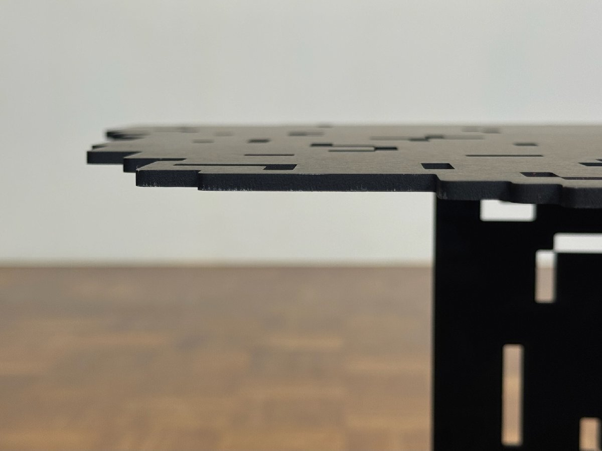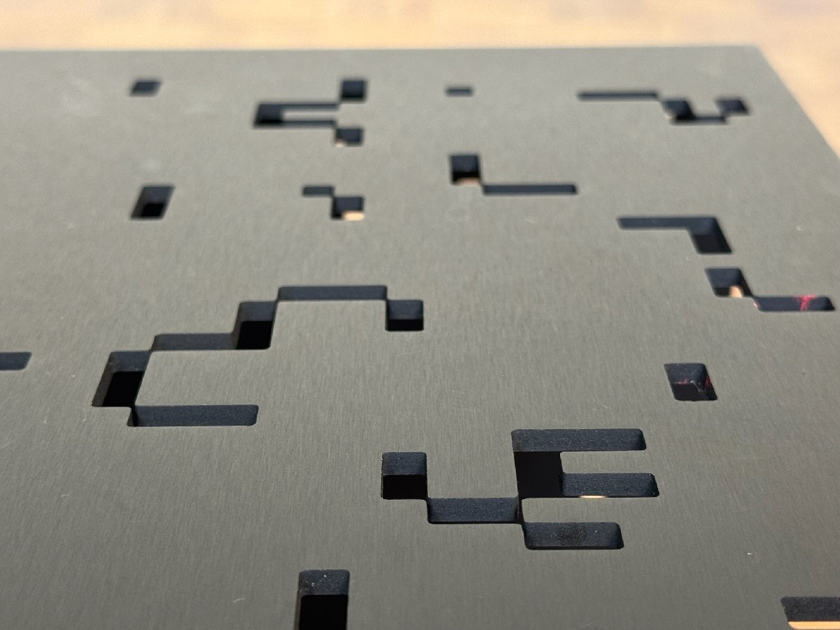 バリ等生まず美しい仕上がりでメタル材に穴を開けていく水力ドリル工法で、デジタルにも古代にも読み取れるアイキャッチな紋様を描き出すことで、ライティングや陽光を受けて、床やウォールに光が透過して描き出すシルエットの美しさは、細やかなデザインに惜しみなくエンジニアリングをつぎ込むことをクリエイティブの主眼に据え置いたウルキオラらしい達観の生み出すデザイン要素。