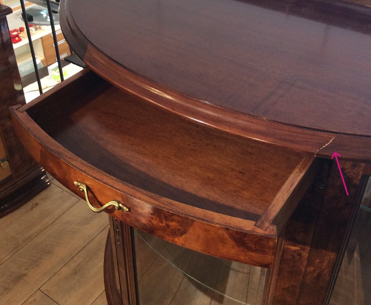 ◇イタリア製、半月型のキャビネット入荷いたしました。 エレガントな印象のクラシカルなキャビネットは、光沢のある重厚な色使いでお部屋をエレガントに演出してくれます。 上部には小さな引き出しも付いており、小物等も収納できます。 <商品について> ■イタリア製 ■サイズ:W117×D50×H101㎝ ■鍵:有 ※天板にキズがあります。画像にてご確認ください。 ※天板側面中央あたりに数センチの傷があります。 ※照明不良です。 <コンディション> こちらの商品は、中古品のため傷等ございますが、まだまだお使いいただける商品になります。 |