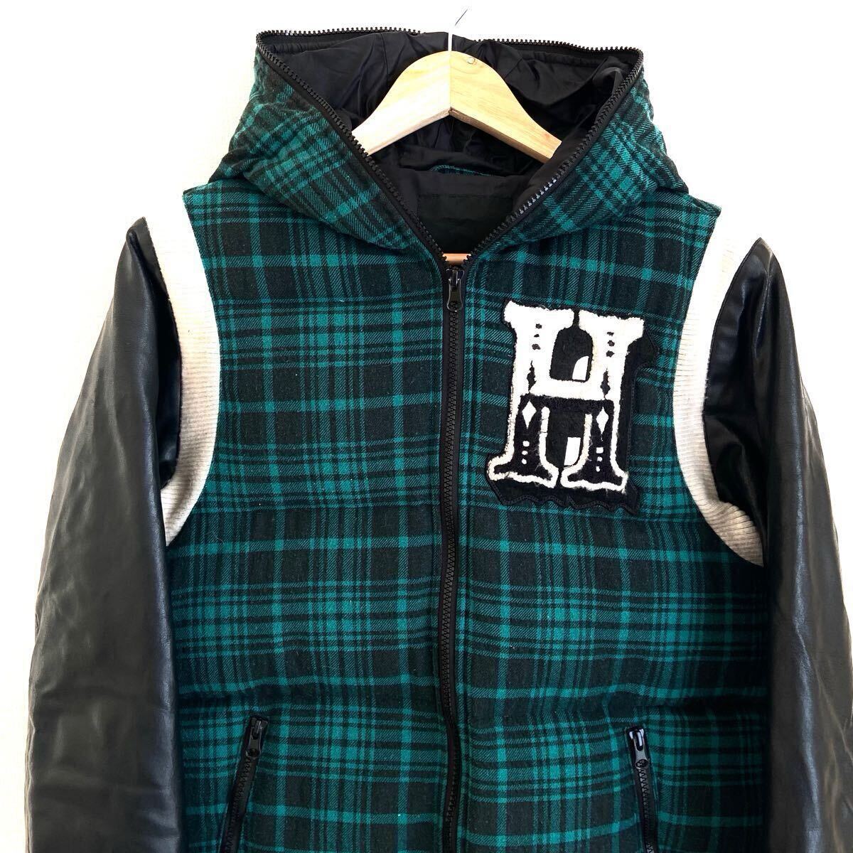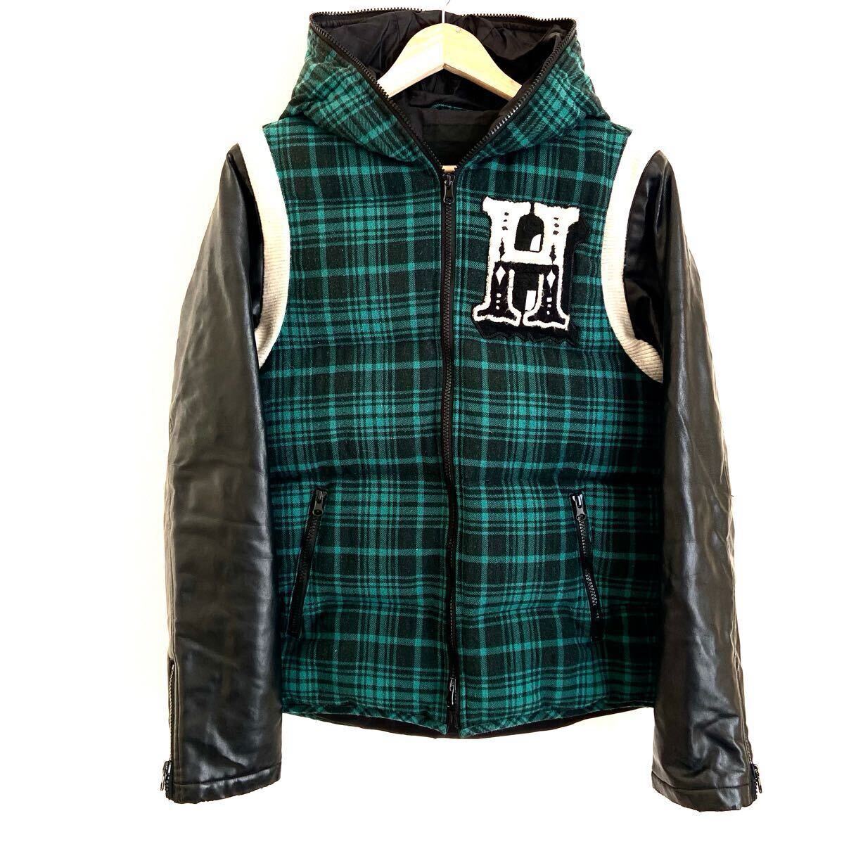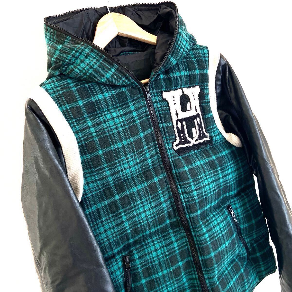 チェック柄のフリースとレザーの組み合わせと個性的な刺繍がインパクト大のダウンジャケットです!多少のよごれや、袖革には若干のはがれが見られますが、 まだまだご着用頂けます!ストリートスタイルにおすすめ!