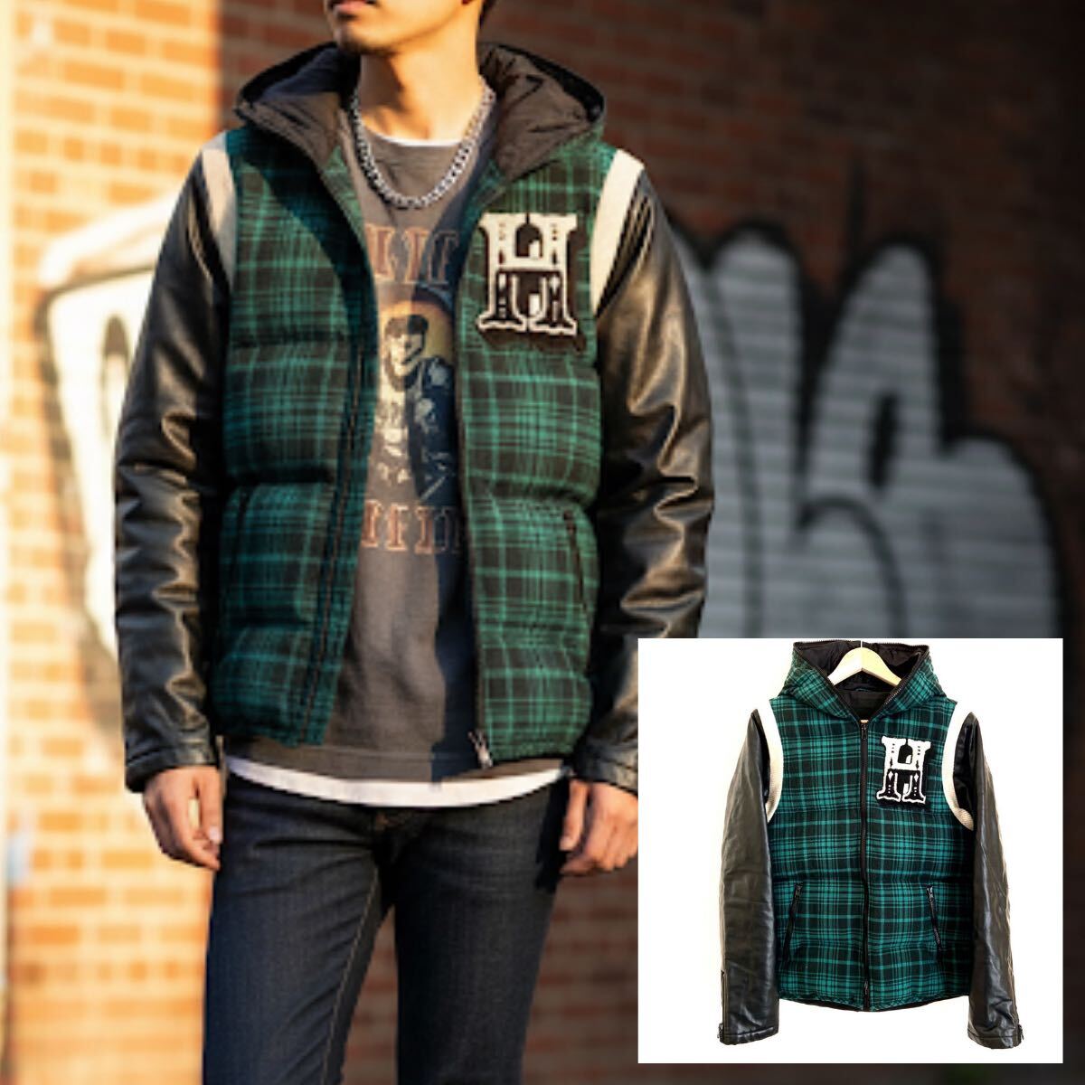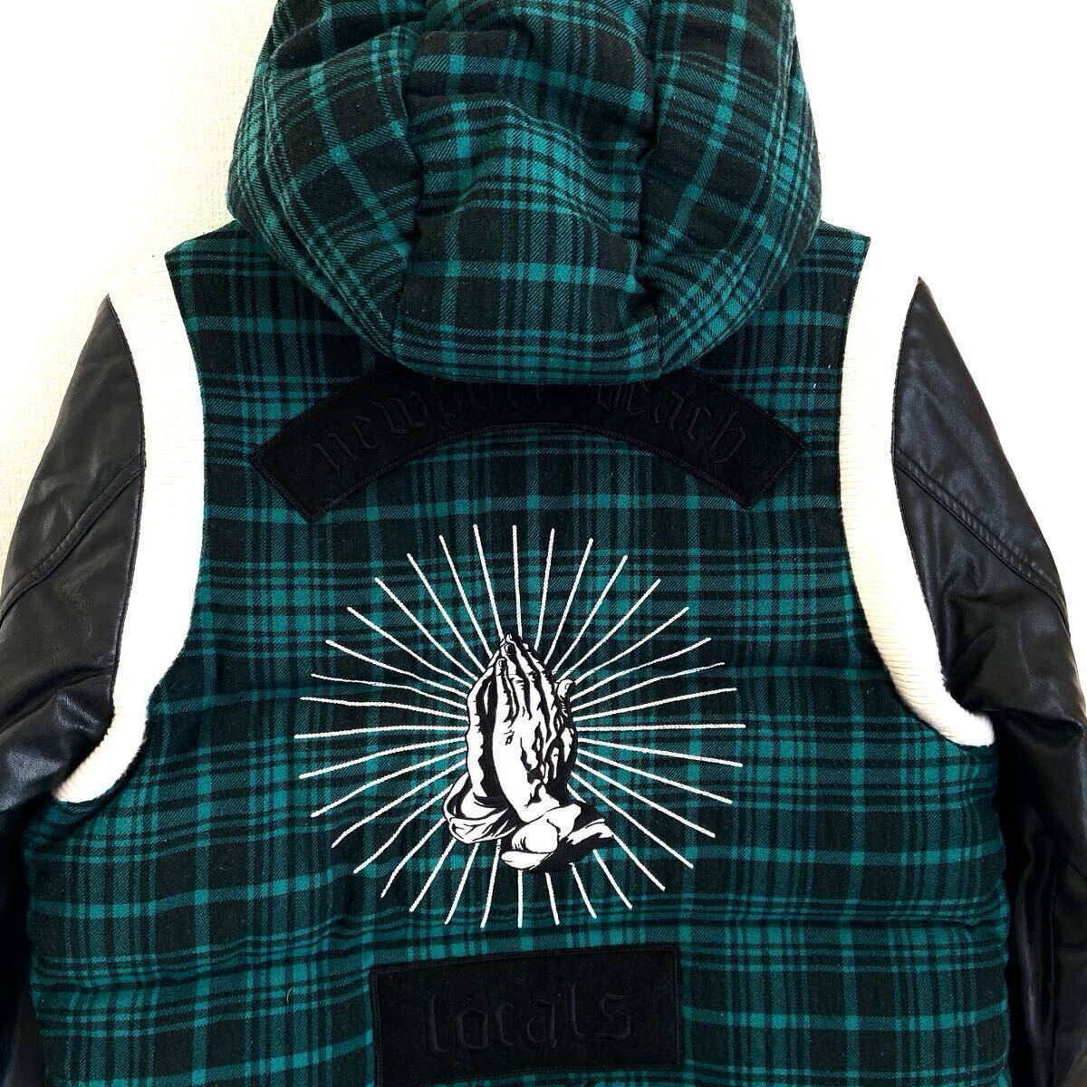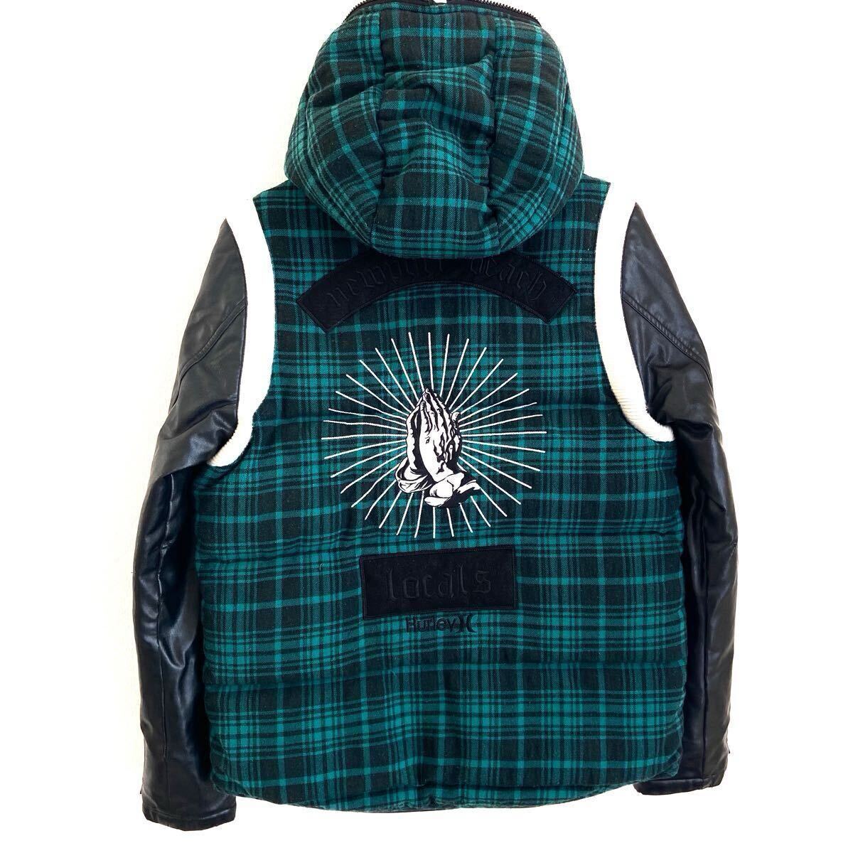 チェック柄のフリースとレザーの組み合わせと個性的な刺繍がインパクト大のダウンジャケットです!多少のよごれや、袖革には若干のはがれが見られますが、 まだまだご着用頂けます!ストリートスタイルにおすすめ!