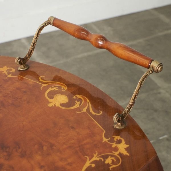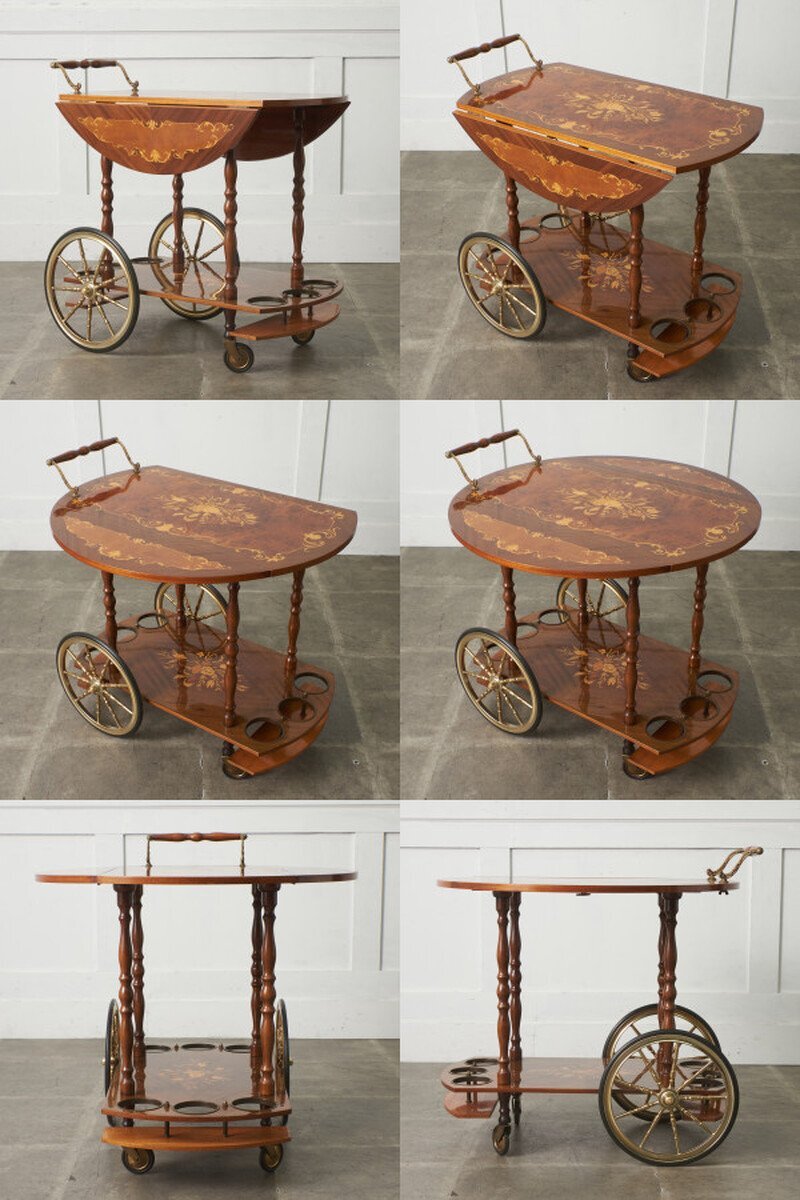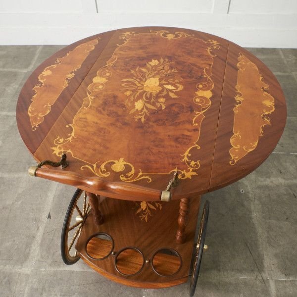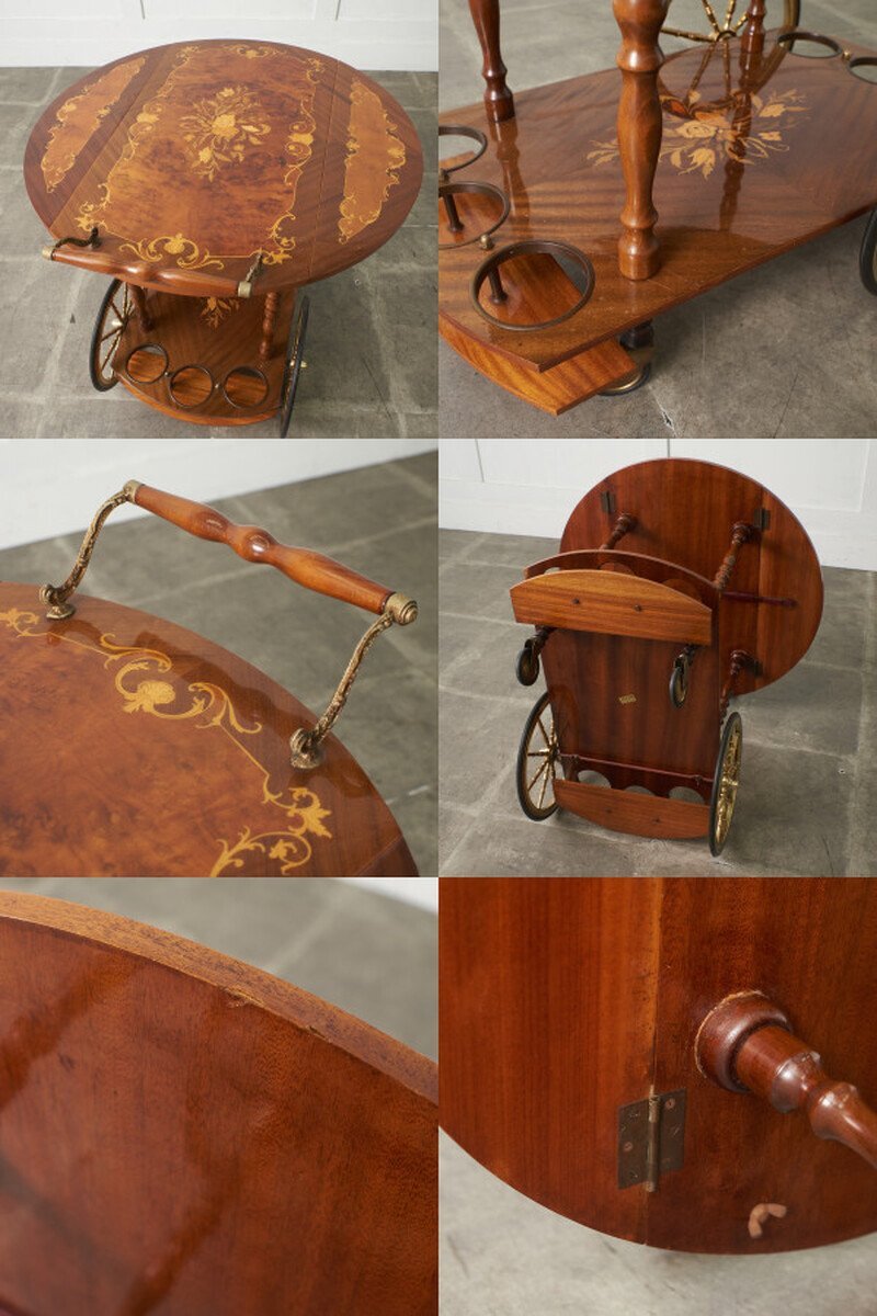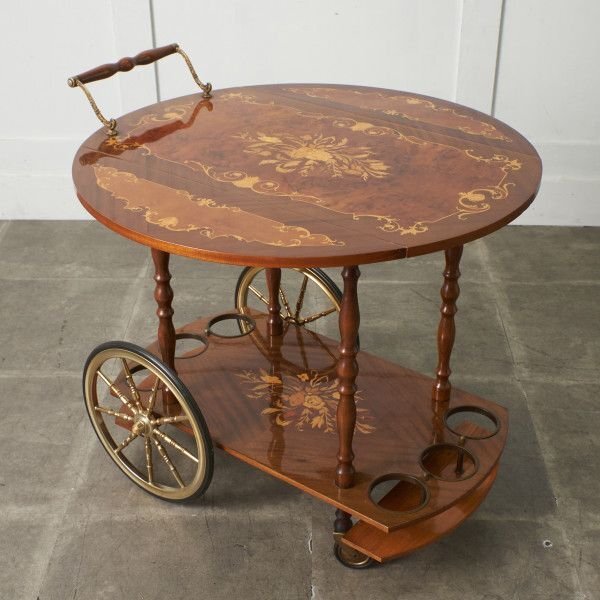 鮮やかな木目に花、植物をモチーフとしたイタリア伝統工芸の木象嵌マーケタリーが施されたキッチンワゴン。エレガントなフレームや支柱がアクセントとなり、上品な佇まいの一品。ワゴンとしてお使い頂くのはもちろんのこと、お部屋のオブジェやサイドテーブルとしてのご利用や店舗什器にもお勧めです。