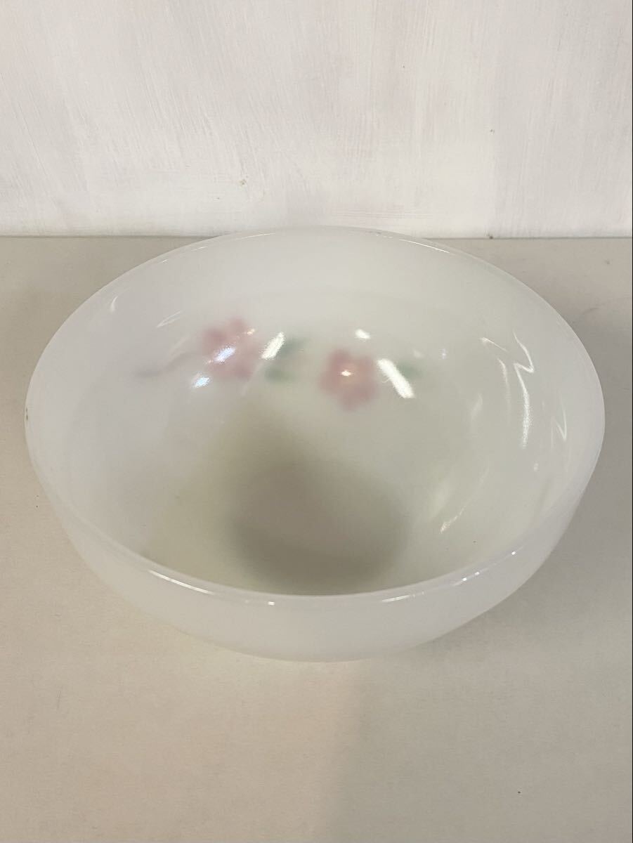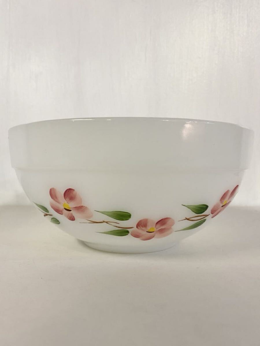 1950年代~1960年代頃、ファイヤーキングのキッチンボウルです。 ピーチブロッサム柄。 ミルクガラスの中サイズのボウル。 Gay Fad Studiosとのコラボレーションシリーズ。 職人によるハンドペイントで描かれた絵柄は、ひとつひとつが異なります。 時を経たビンテージでも頑丈で使いやすく、デイリーユースでいつまでも使い続けることができます。 【サイズ】 高さ86mm 口径190mm 【状態】 フチに小さな着色、少しのペイントロスございますが、ツヤ残り多くスレも少ないとても良い状態です。 商品No:z00781 |