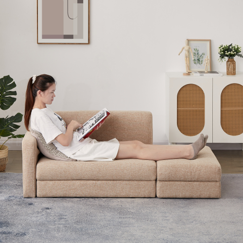 • ご紹介するソファは、ソファーベッドとしても利用できるカウチソファです。3 人掛けの広いデザインで、家族や友人と一緒にくつろげます。付属のオットマンは、足を伸ばしてリラックスできるだけでなく、収納機能も備えており、使い勝手が抜群です