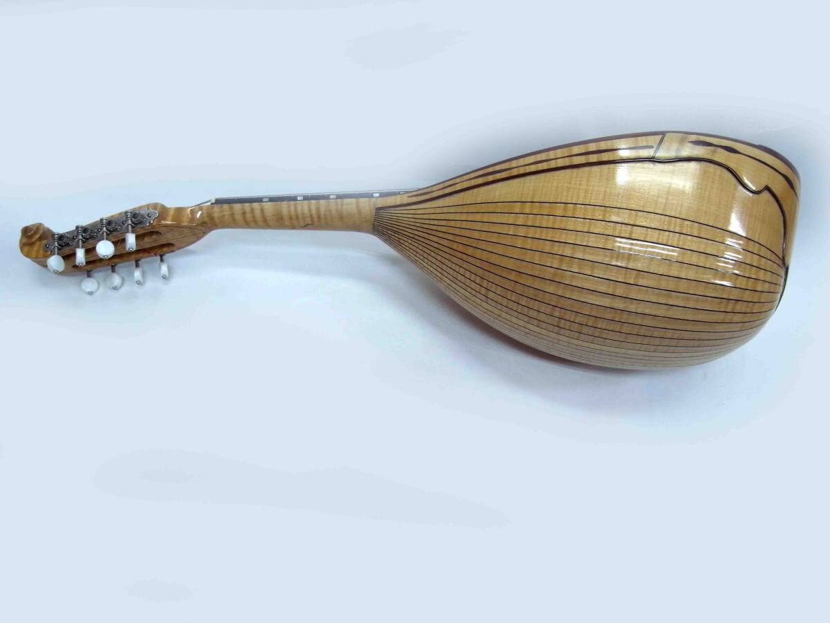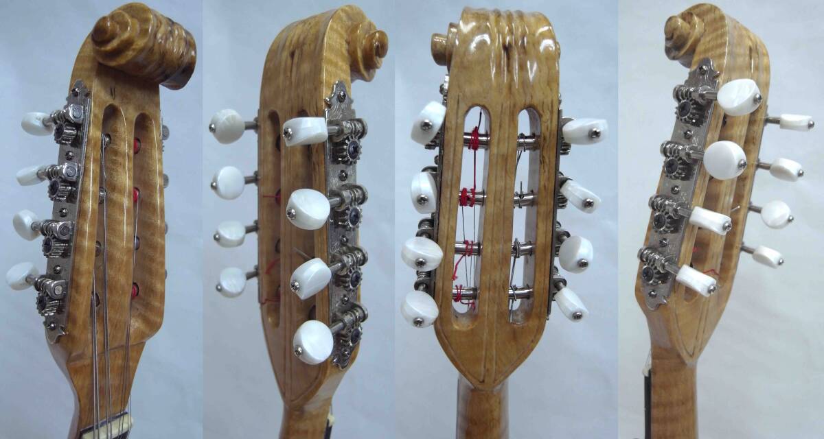 ヘッド形状は渦巻きヘッドで棹や胴は高級メープル材(トラ目)で豪華です。