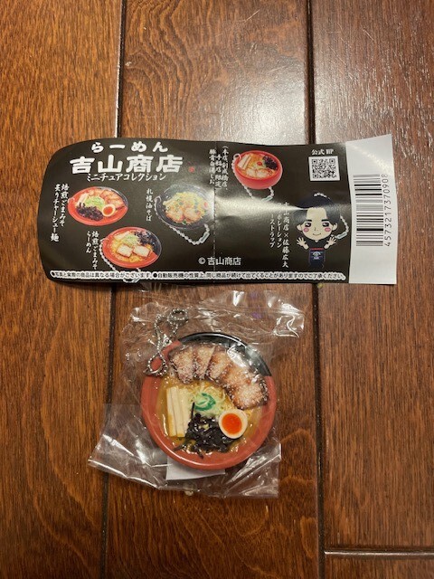 レインボーから出ました「らーめん吉山商店ミニチュアコレクション」全5種のうち「焙煎ごまみそ炙りチャーシュー麺」になります。500円ガチャだけあって細部まで精緻な造形となっております。私が見た感じではC-plaでしか置いていないようで、ガチャ自体レアのようです(笑)。内袋未開封(ただし密封式)、リスト付きです。