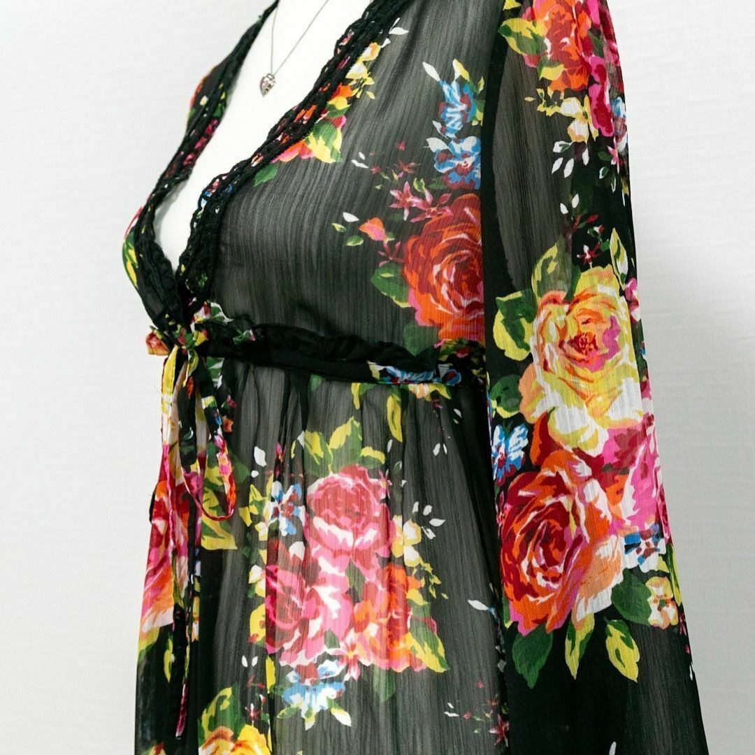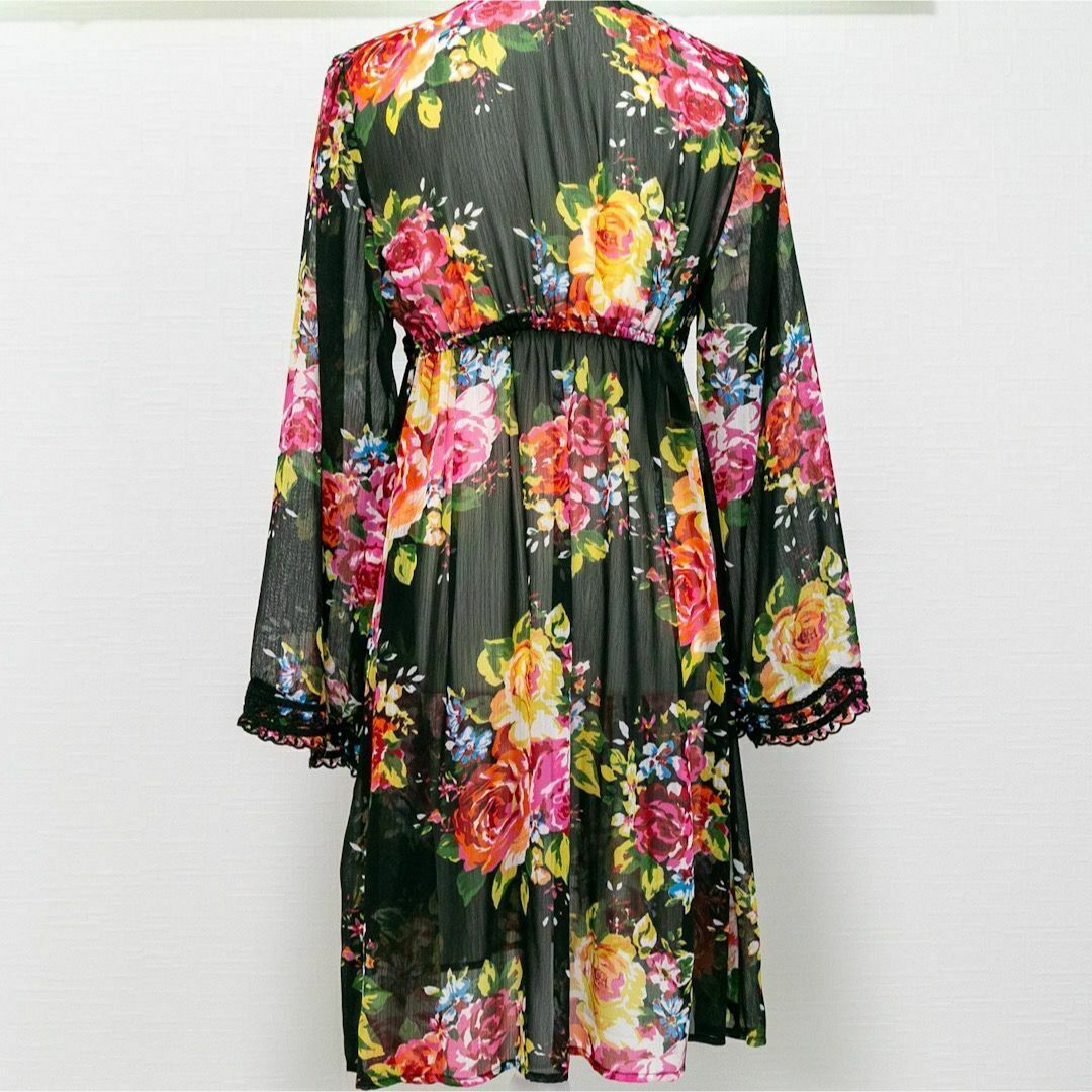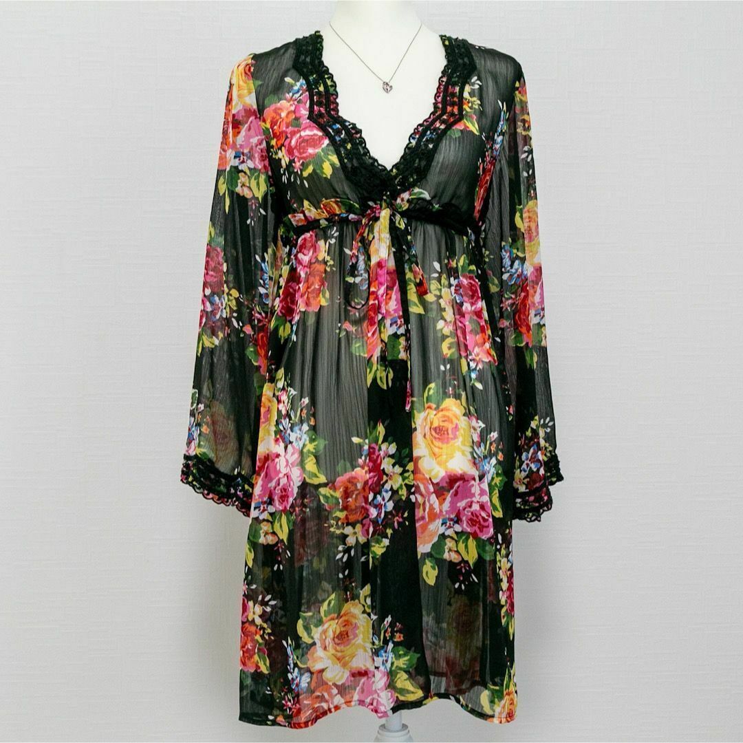 フラワープリント 総柄 シアー素材 チュニックワンピース ブラック 黒 刺繍 ウエストマーク
