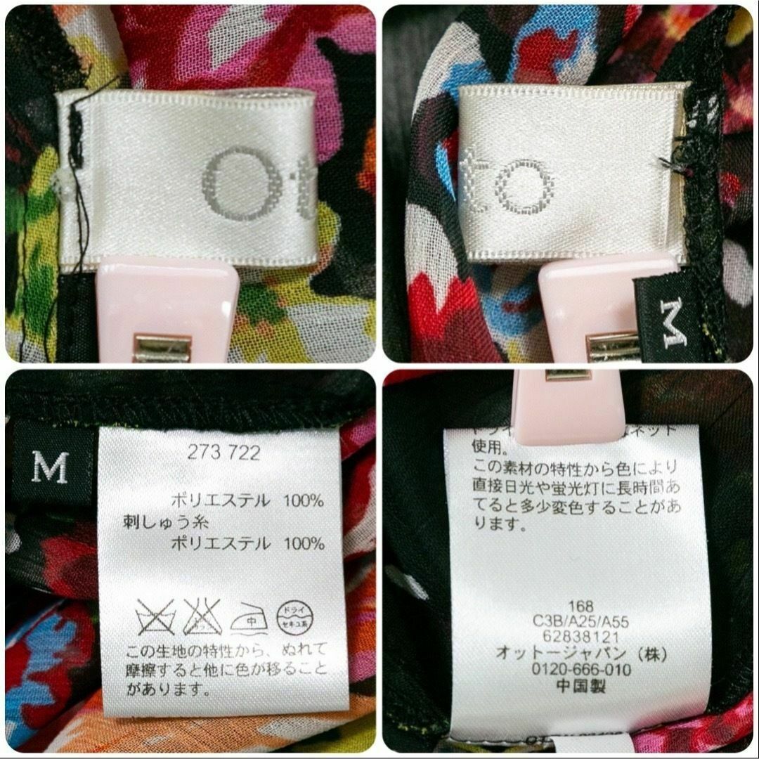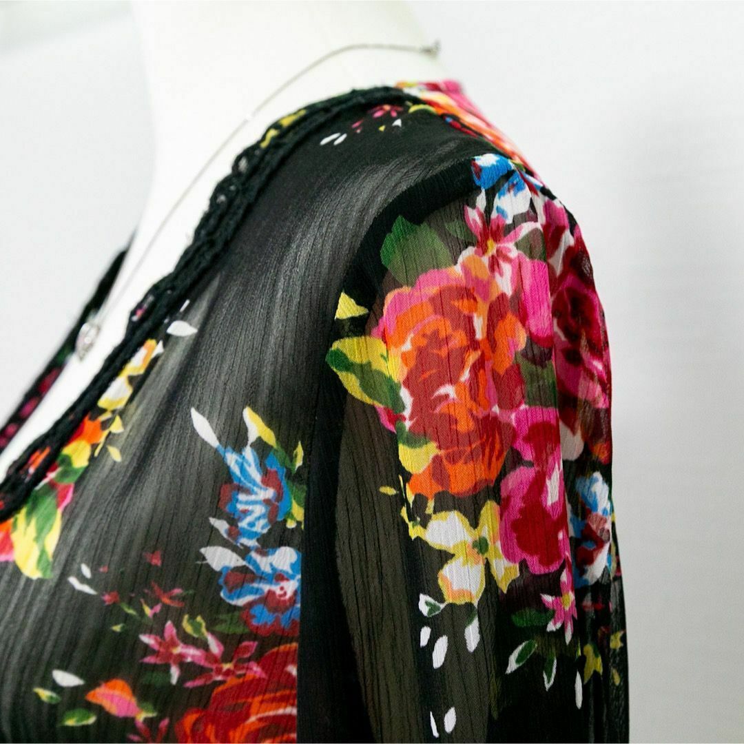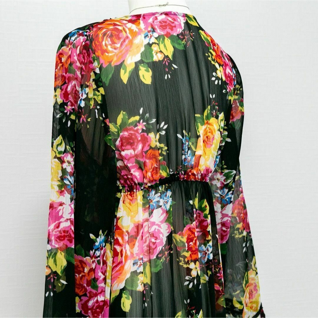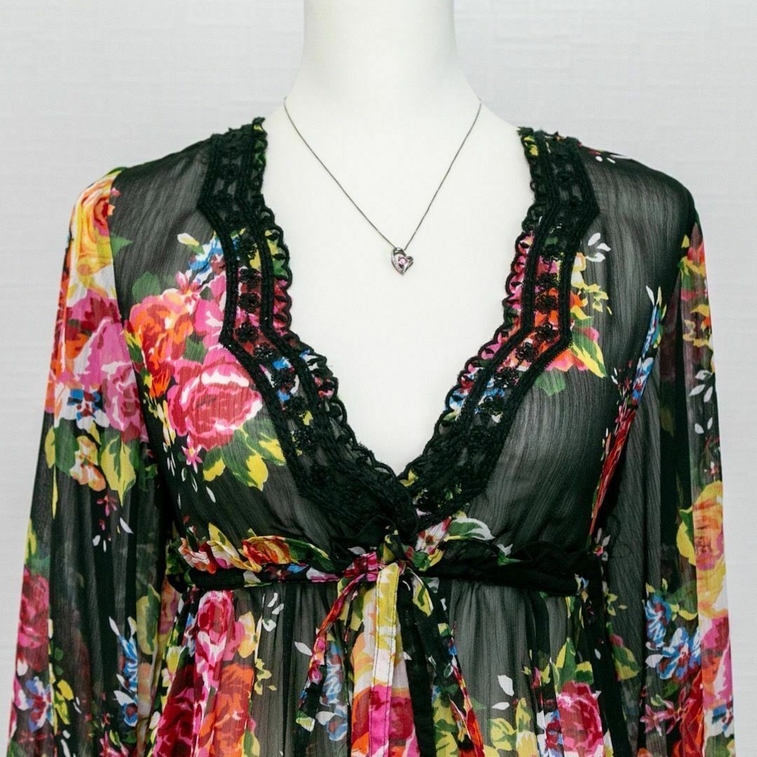 フラワープリント 総柄 シアー素材 チュニックワンピース ブラック 黒 刺繍 ウエストマーク