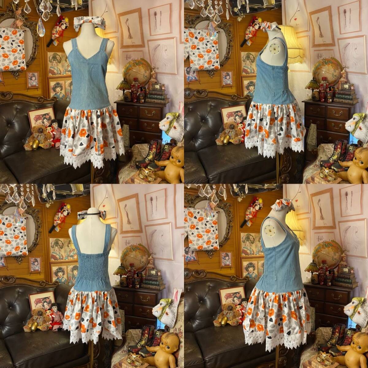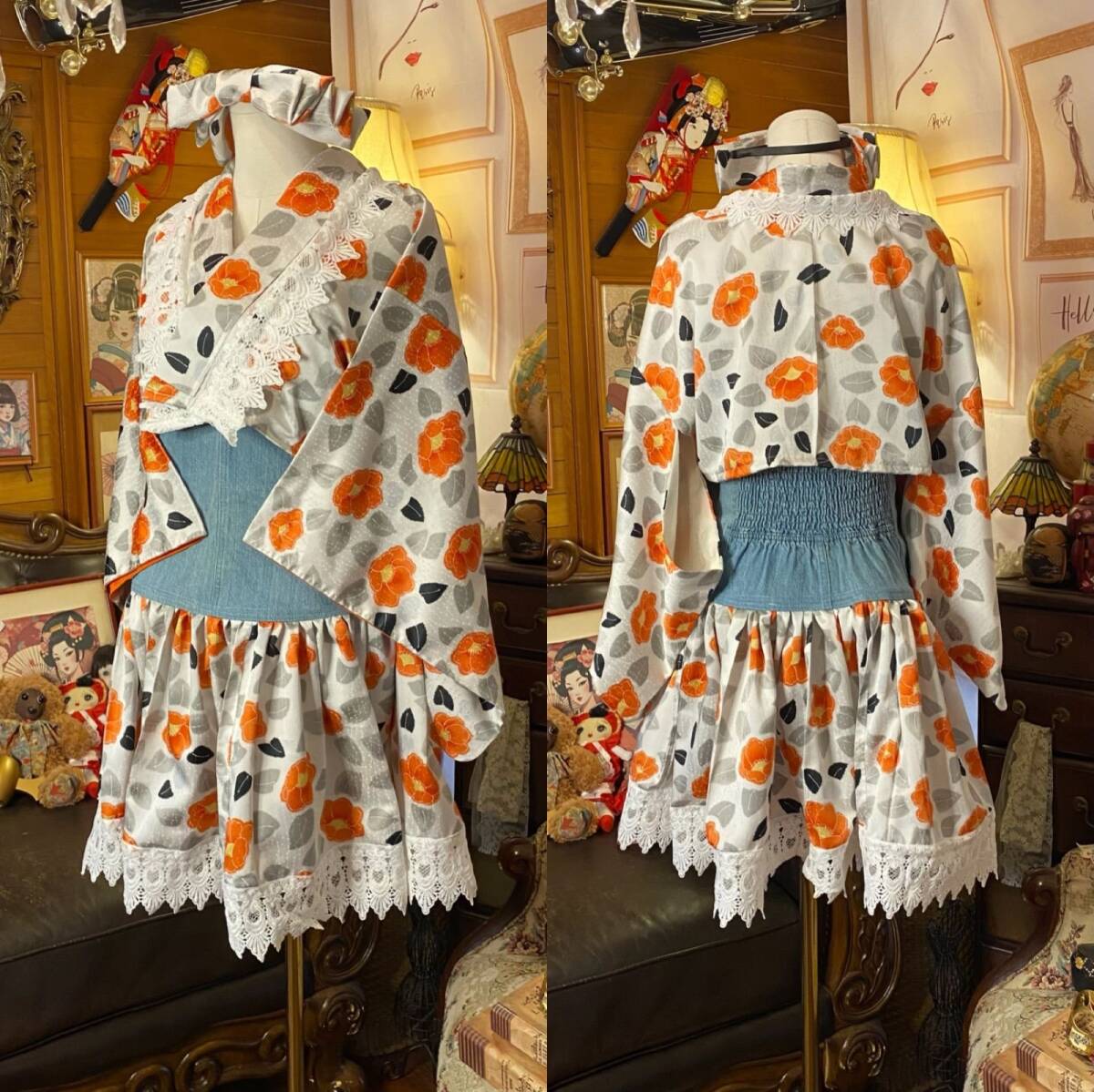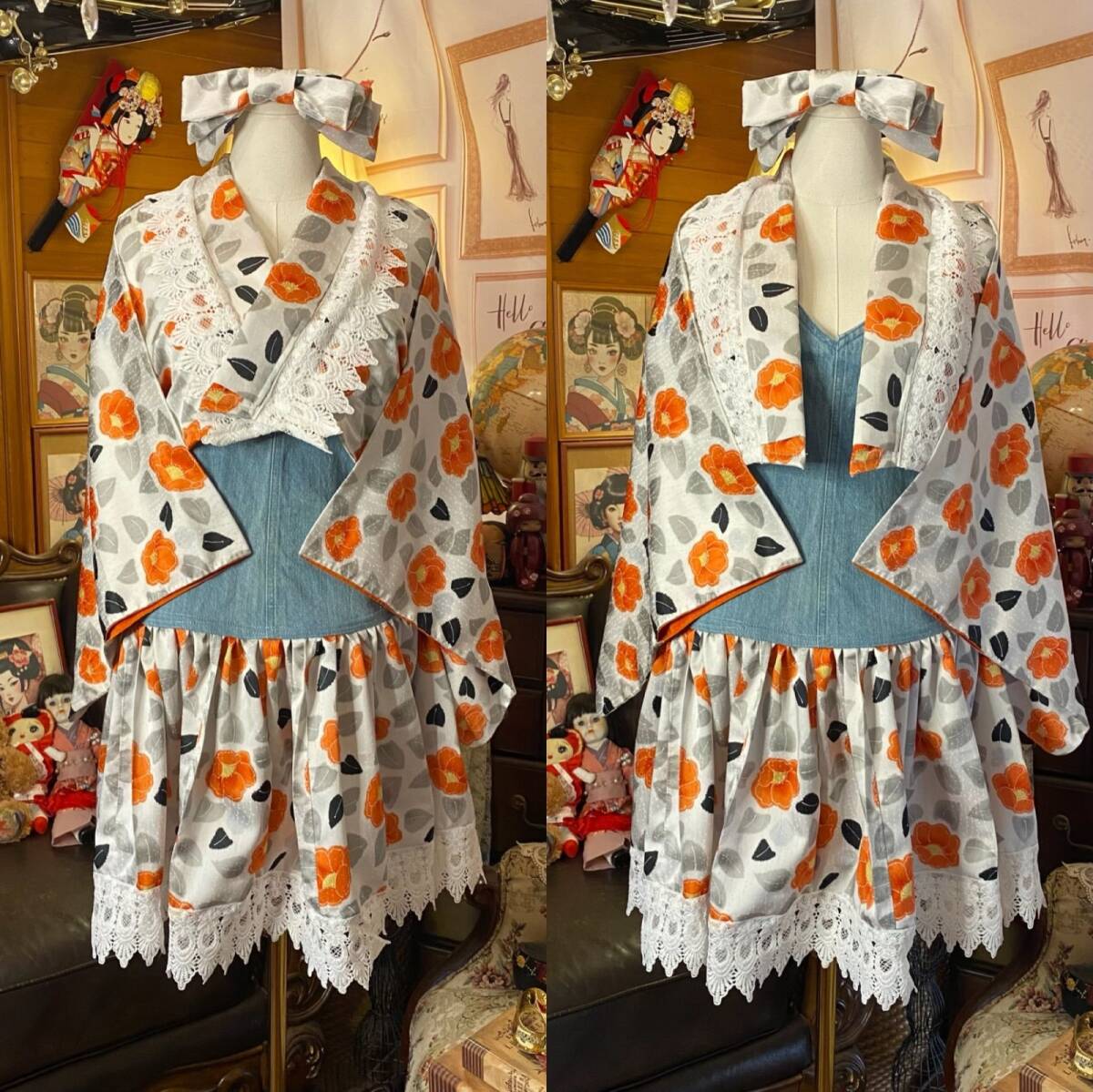 【 着物 リメイク セットアップ 和洋折衷 ツーピース 2部式 コラージュ パッチワーク レースアップ デニム レトロ 古着 ハンドメイド やわらかなオフホワイト地に朱橙の椿 DS-11 】
