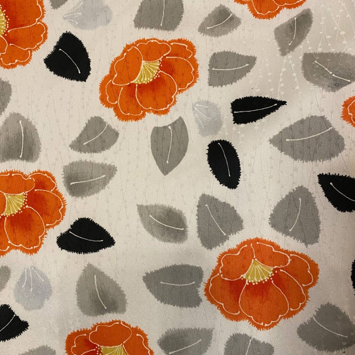 朱橙の椿を主役に、薄鼠~チャコールの抽象化した葉を大小リズミカルに散らしたレトロポップな意匠です。花芯のレモンイエローがアクセントとなり、白地の清涼感とオレンジの華やぎが軽やかに調和。