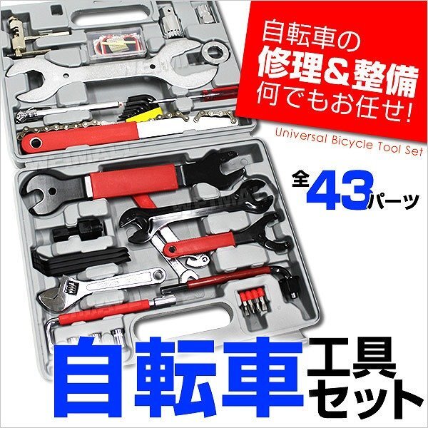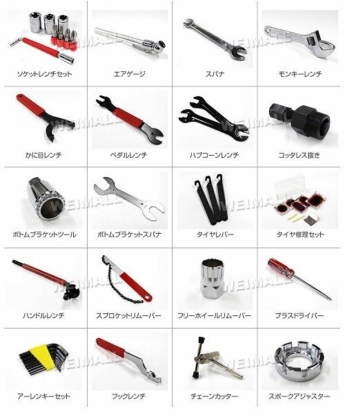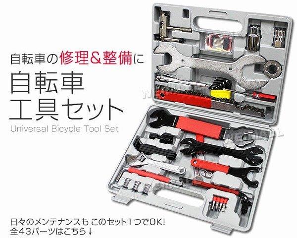 マウンテンバイクやロードバイクのメンテナンスに! MTBやロードバイク、自転車全般のメンテナイスに必要な基本的な工具が20種43パーツ入った工具セットです。 ベースセットとして必要な工具を厳選しました!! ステップアップごとに必要な工具を買い足していけば、あらゆるメンテに対応できます。 ■商品仕様 サイズ(約):33cm×26cm×7cm ■商品内容 ソケットレンチセット:(8/9/10mm)/(ビットソケット)/ (ビットPH+x2、−x2) エアゲージ かに目レンチ モンキーレンチ:〜18mm ペダルレンチ:15mm/16mm、15mm/17mm ハブコーンレンチ:13mm/15mm、14mm/16mm ボトムブラケットツール スパナ:8mm/10mm コッタレス抜き タイヤレバー ×3 ボトムブラケットスパナ:30mm/32mm、36mm/40mm タイヤ修理セット スプロケットリムーバー フリーホイールリムーバー ハンドルレンチ プラスドライバー アーレンキー(HEX)セット:1.5/2/2.5/3/4/5/6/8mm チェーンカッター(チェーン外し工具) スポークアジャスター:10/11/12/13/14/15G フックレンチ ※注意事項:使用範囲内であっても、状態や状況によっては、使用することができない場合があります。 ※写真と実物は多少異なる場合がございます。あらかじめご了承下さい。 |