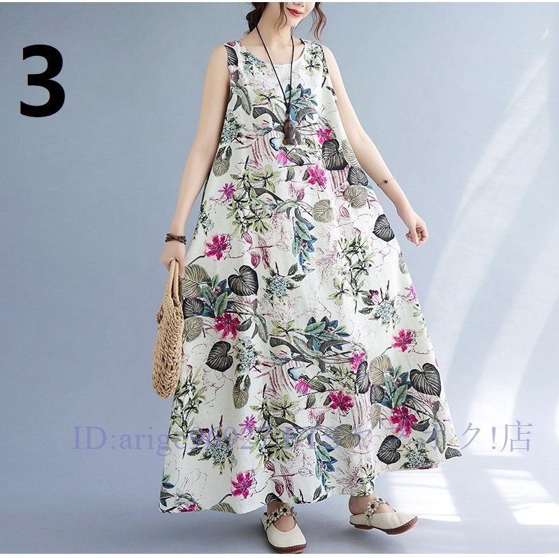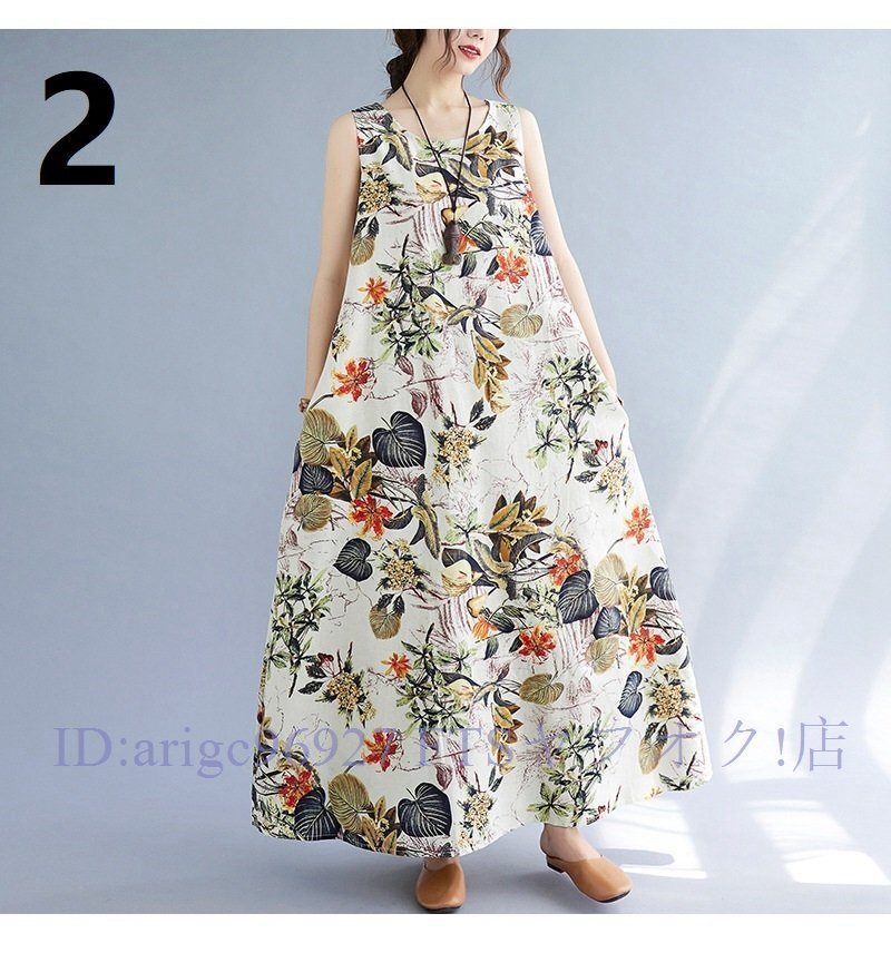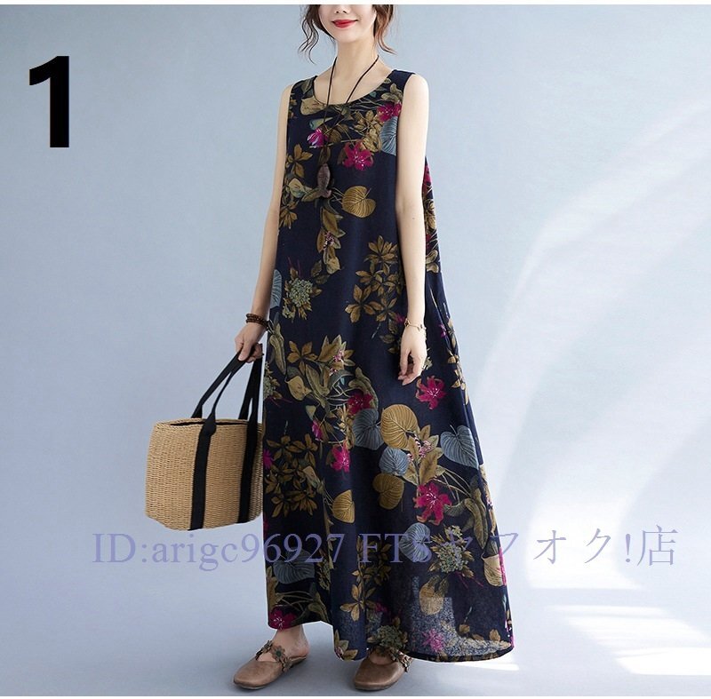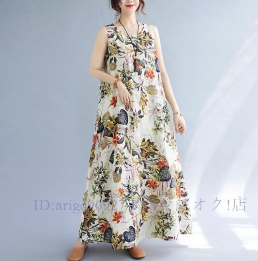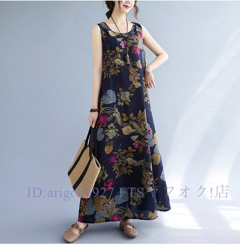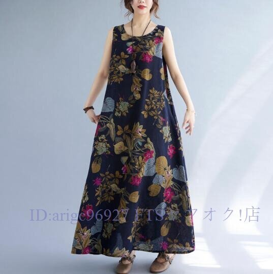 ★新品ワンピース ロングワンピース マキシワンピース エスニックワンピース コットンリネン 綿麻 花柄 総柄 プリント M