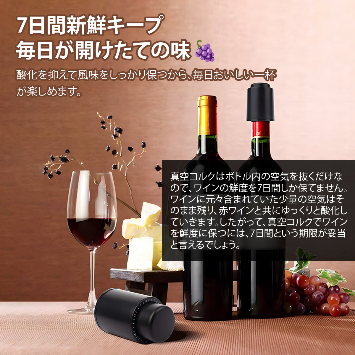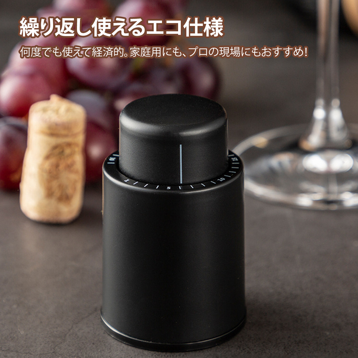 | 商品の説明 | 【ワンプッシュで簡単真空密封】:ボトルに差し込んで押すだけ!内蔵の真空バルブが空気を抜き、ワインの酸化を防止。誰でも簡単に使える設計です。 【鮮度を最大7日間キープ】:空気をしっかり抜いて密封保存。風味や香りを保ち、開けたての味を7日間楽しめます。1杯だけ飲みたい日の強い味方。 【日付表示機能付きで安心管理】:いつ開けたかひと目でわかる日付スケール付き。ワイン管理や飲み忘れ防止にも便利。家庭用だけでなくワインバーやレストランにも重宝。 【液漏れゼロ&スタイリッシュデザイン】:高密閉構造で横にしても漏れない安心設計。コンパクトで美しいデザインだから、ワインボトルの見た目も損なわず、ギフトにもおすすめ。 【家庭・おもてなし・業務用にも】:ホームパーティー、ディナー、お祝いの席、ワインバーやレストラン、さらにはワインセラー管理まで、さまざまなシーンで活躍! |