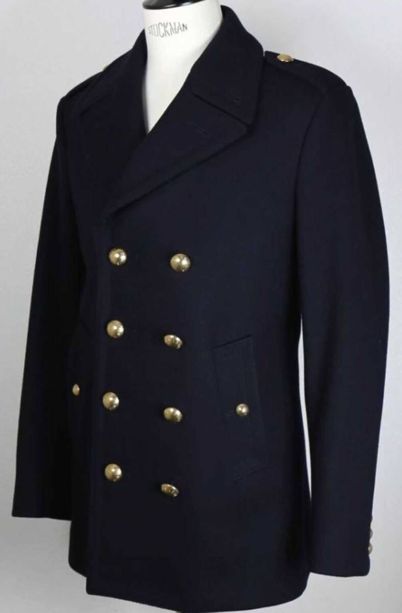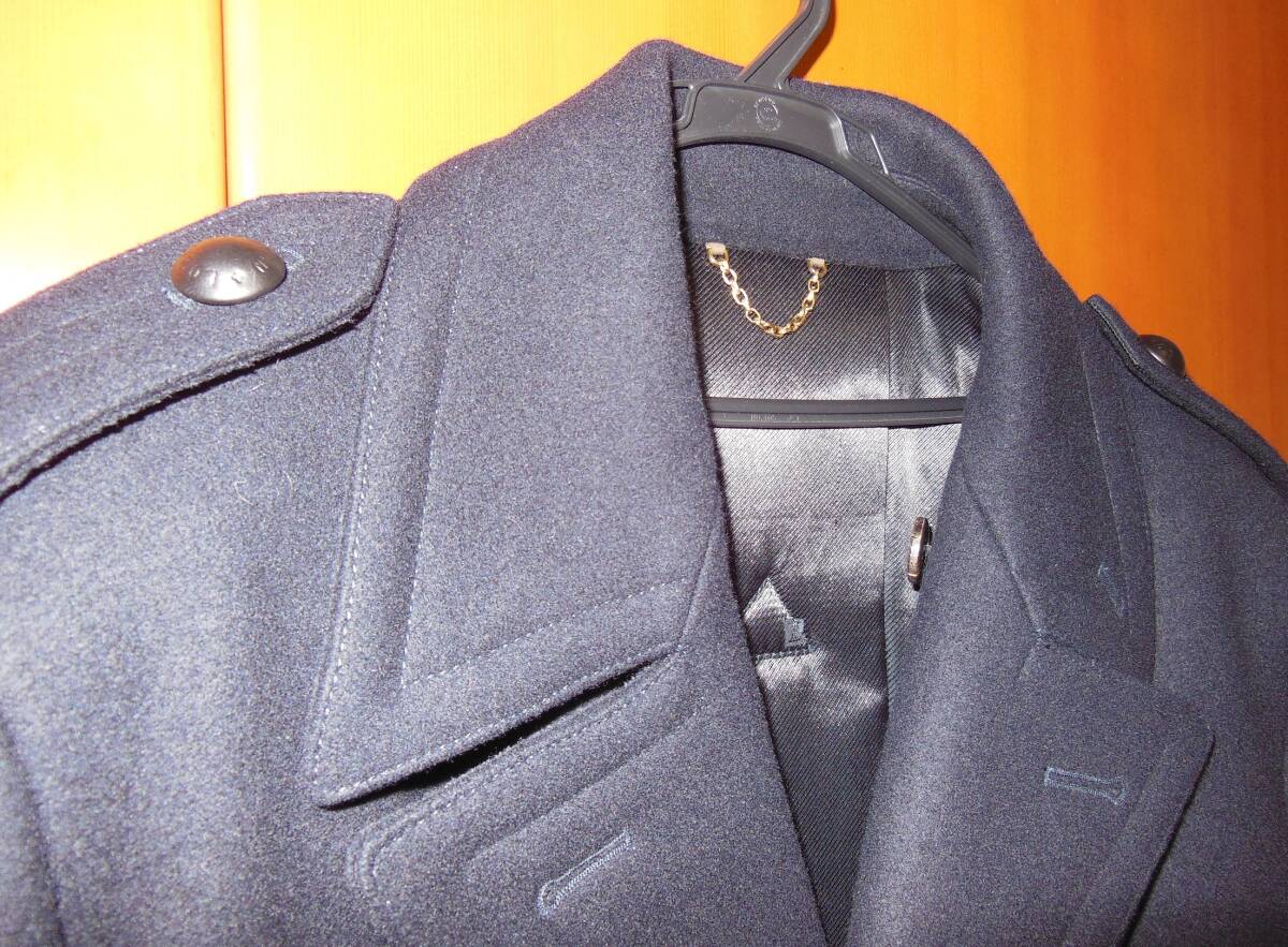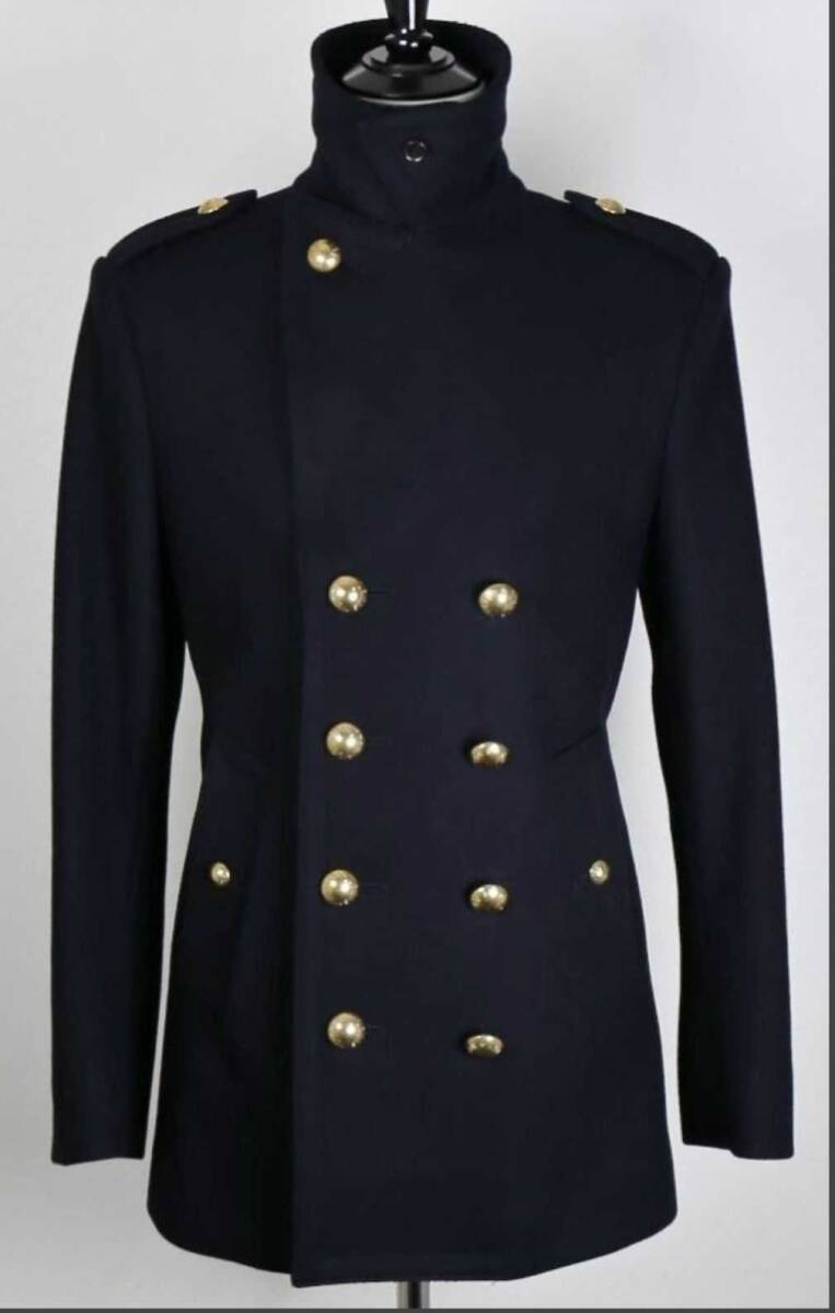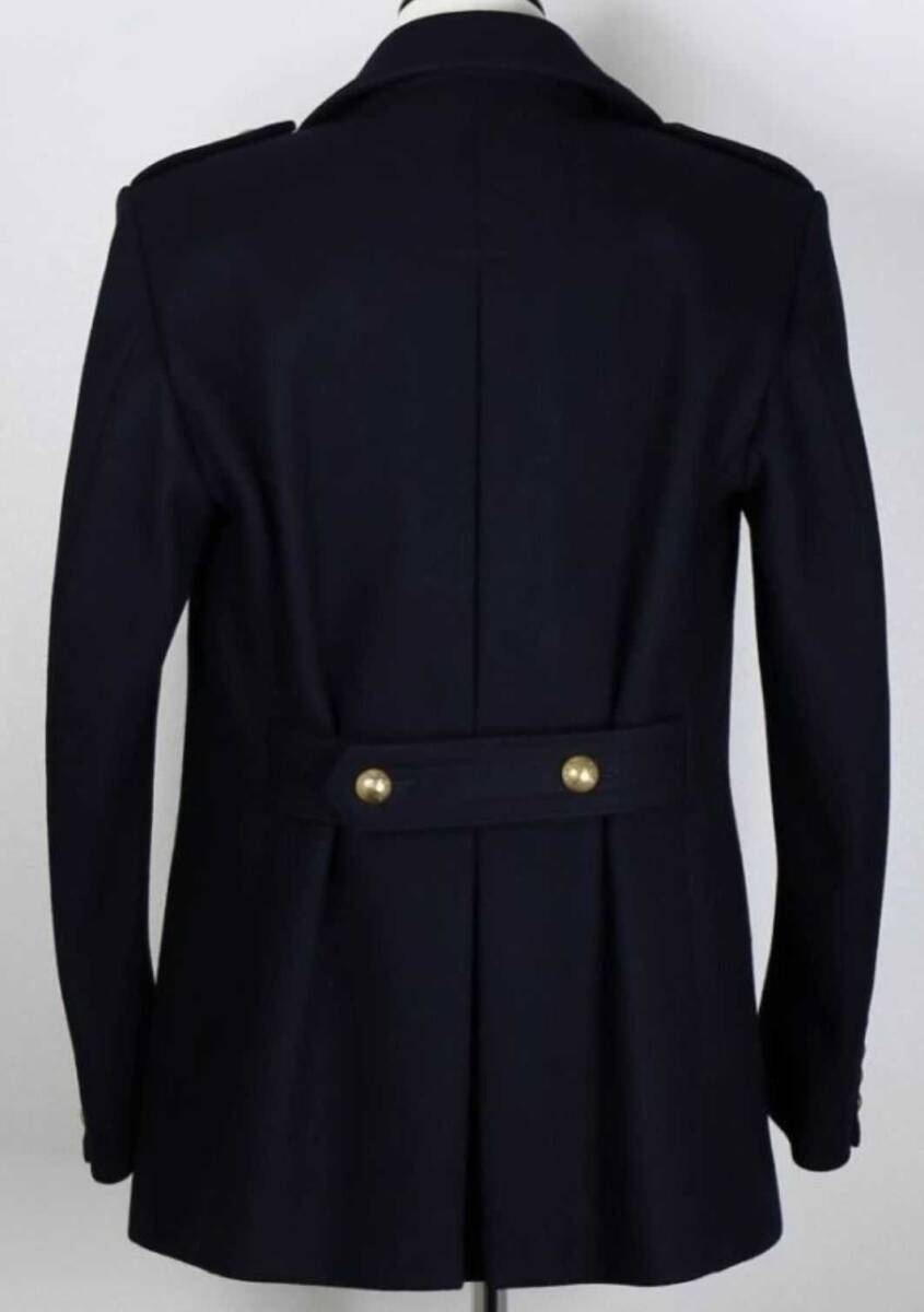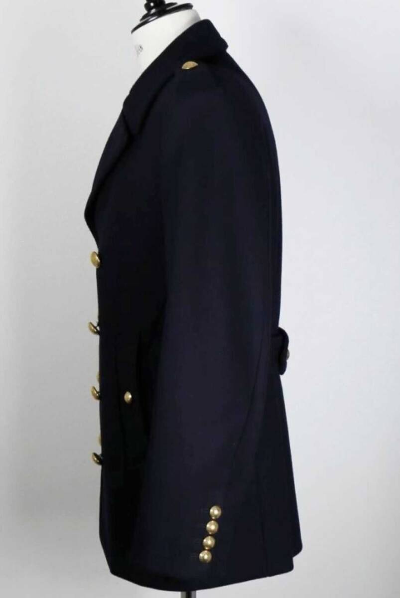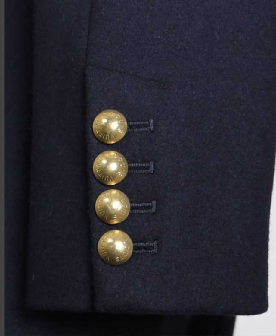 素材はウール80%、カシミア20%で、色は濃紺です。全てのメタルボタンにロゴが入っています。