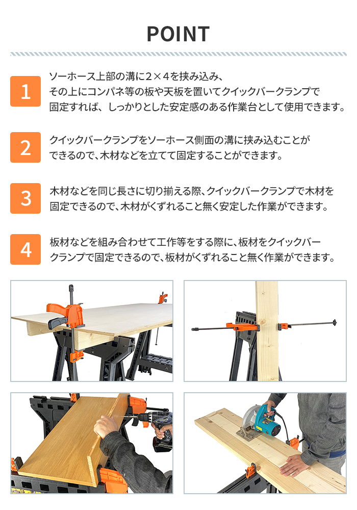 | ◇コンパネ等の板や天板を置いて簡易作業台として使用できます。 ◇ソーホース上部の溝に2×4を挟み込み、その上にコンパネ等の板や天板を置いてクイックバークランプで固定すれば、しっかりとした安定感のある作業台として使用できます。 ◇クイックバークランプをソーホース側面の溝に挟み込むことができるので、木材などを立てて固定することができます。 ◇木材などを同じ長さに切り揃える際、クイックバークランプで木材を固定できるので、木材がくずれること無く安定した作業ができます。 ◇板材などを組み合わせて工作等をする際に、板材をクイックバークランプで固定できるので、板材がくずれること無く作業ができます。 |