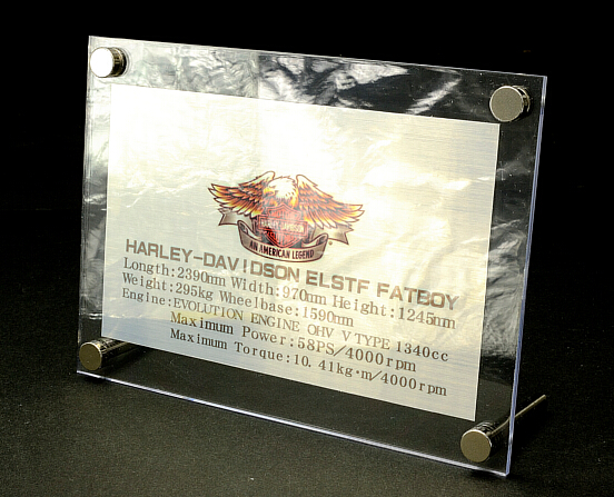 | 商品説明 | デアゴスティーニ 1/6 1/8等ハーレーダヴィットソンファットボーイ1990年用アクリル製ネームプレートです。 アクリルは高純度・高透明のキャストタイプ(流し込み製法)1.5mm+1.5mm高級アクリル硬質板を用い、金具も専用のネジ留式特注金具を使用しています。 盾部分は従来の台座に使用されているスペック付きのものを使用しています。(印字はハッキリ出ています) ネームカードはシルバーのライン入り高級紙を使用しています。 スペック内容 全長、全幅、全高、エンジン、等 大きさ 盾 外形約150mm×110mm カード部 約120mm×80mm |