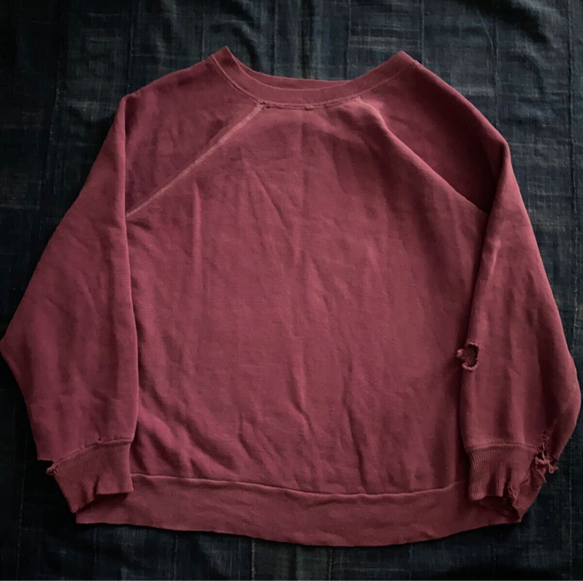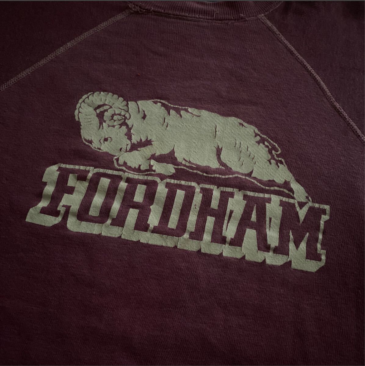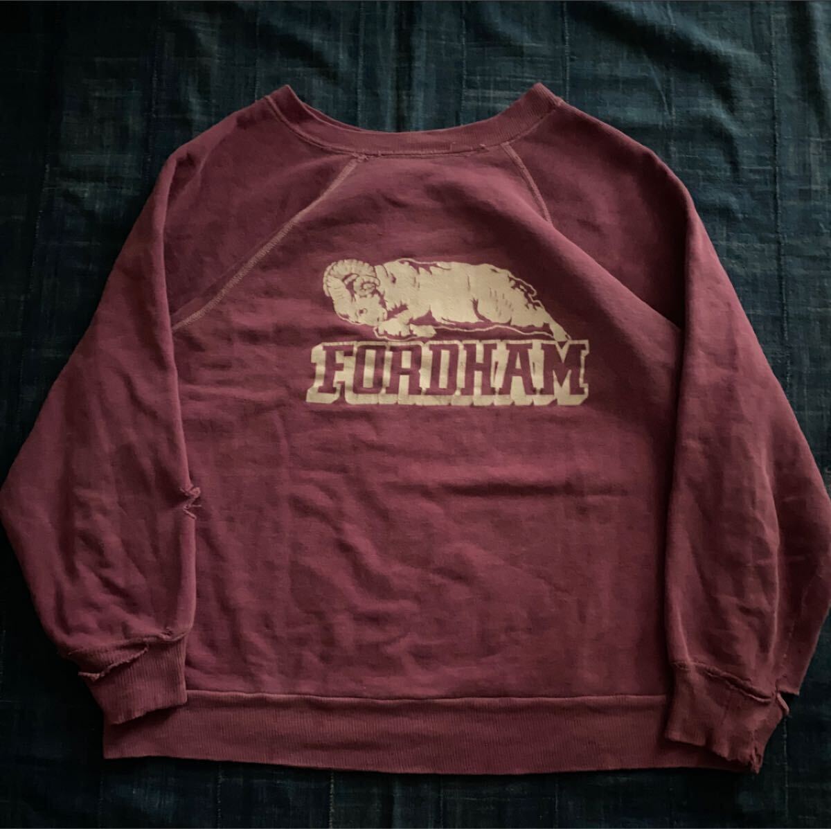 Rare 60s 70s FORDHAM スウェット の出品になります。希少なボディカラーのマルーン。加えてグッドプリント入りの逸品です。年代相応のダメージ等御座いますが個人的には寧ろプラスの評価です。オリジナルヴィンテージにしか出せない雰囲気で、一目でヴィンテージと認識できる見た目でかっこいいですよ。色付きのTシャツなんかとのレイヤードも良さそうです。古い年代のスウェットにはなりますが身幅、着丈共にサイズ感は申し分ありません。ラグランスリーブに丸胴ボディとディティールも素晴らしいです。雰囲気抜群でグッドプリントの1枚。是非この機会に御検討下さい。