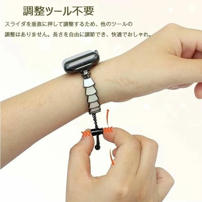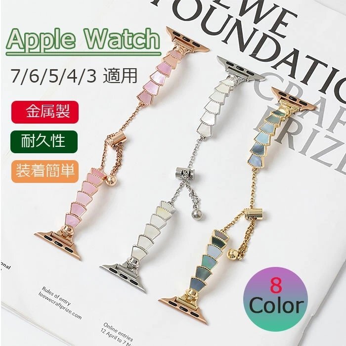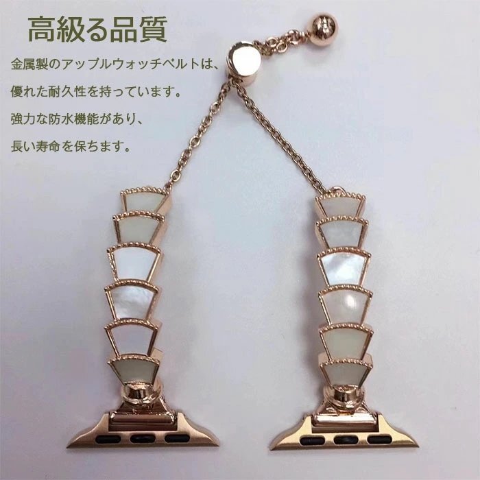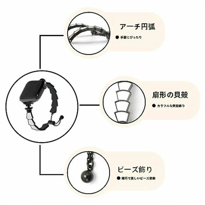 【デザイン】:このアップルウォッチバンドはキールの形をしており、ホタテ貝のアクセサリーが施されています。 エンド部分はスライド式のチェーンとビーズでできており、手首をより細くかわいく見せてくれます。