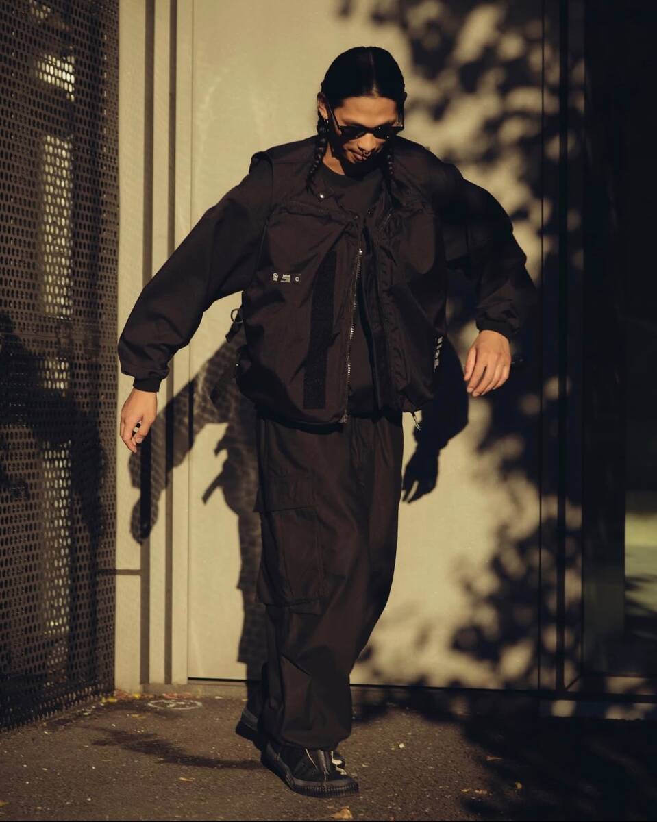 フロントと背面にフラップ付きポケット、両サイドにアコーディオン型のカーゴポケットを配備。