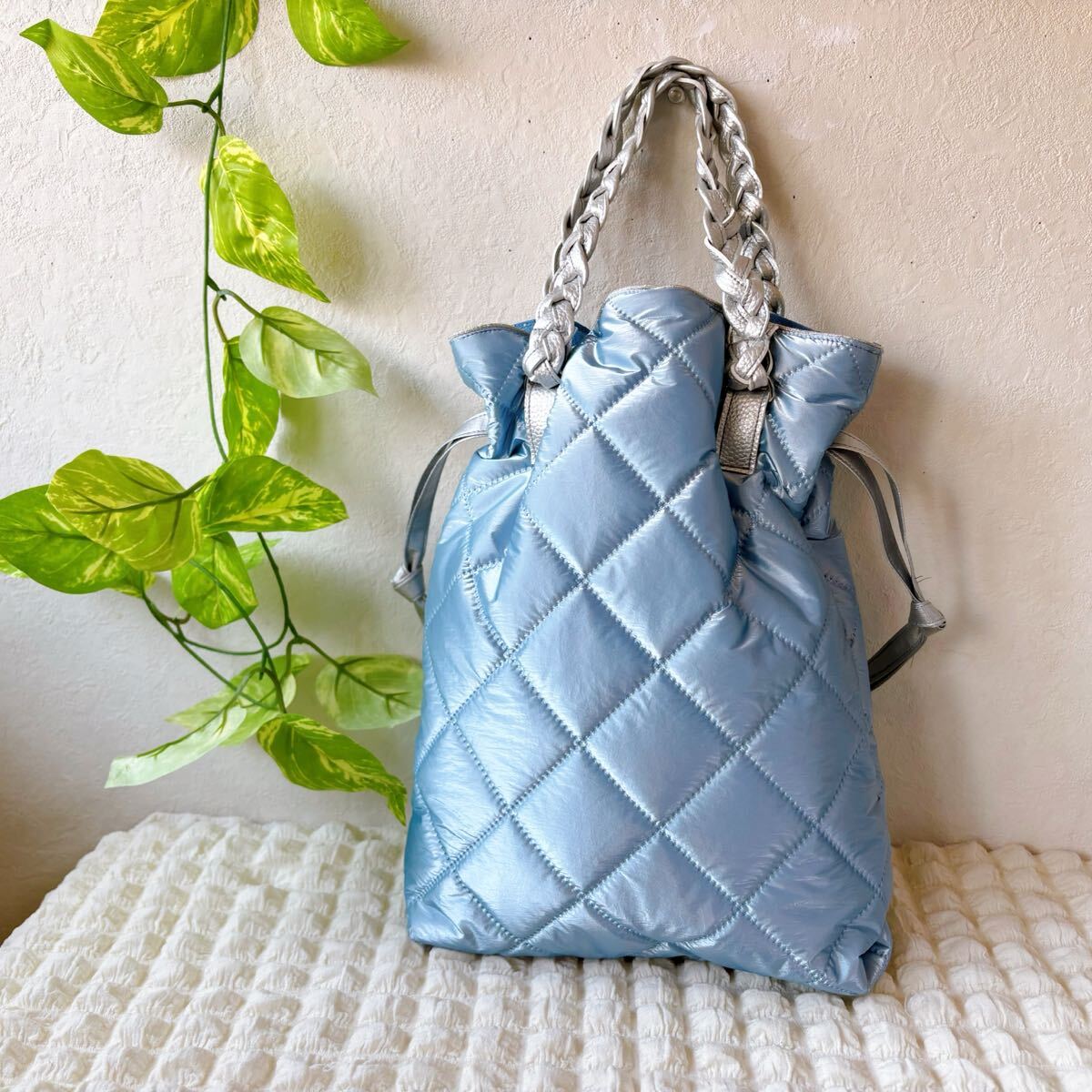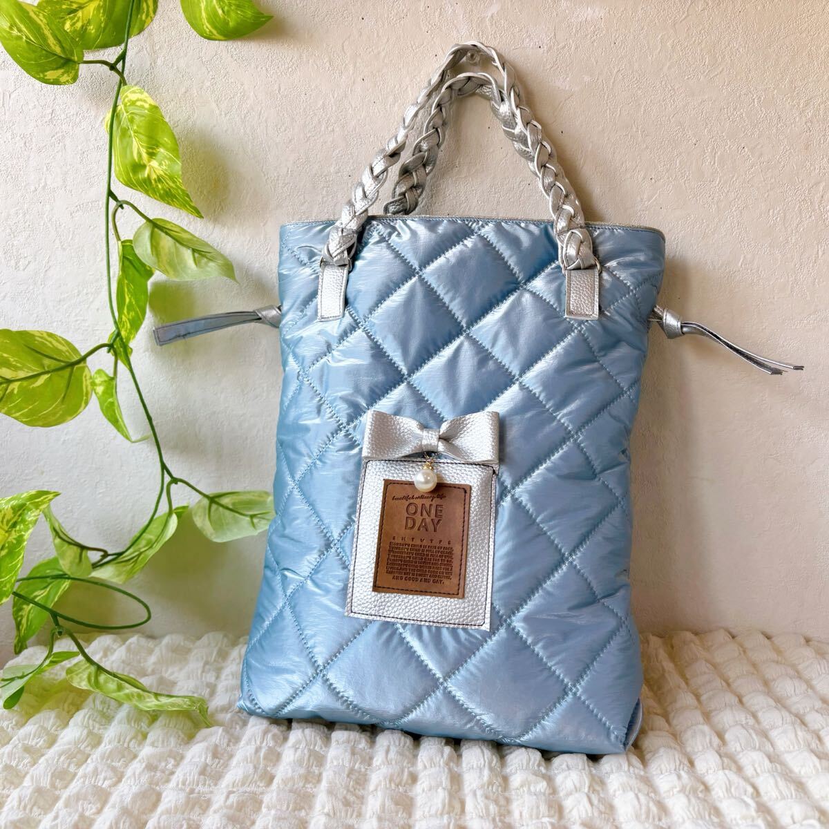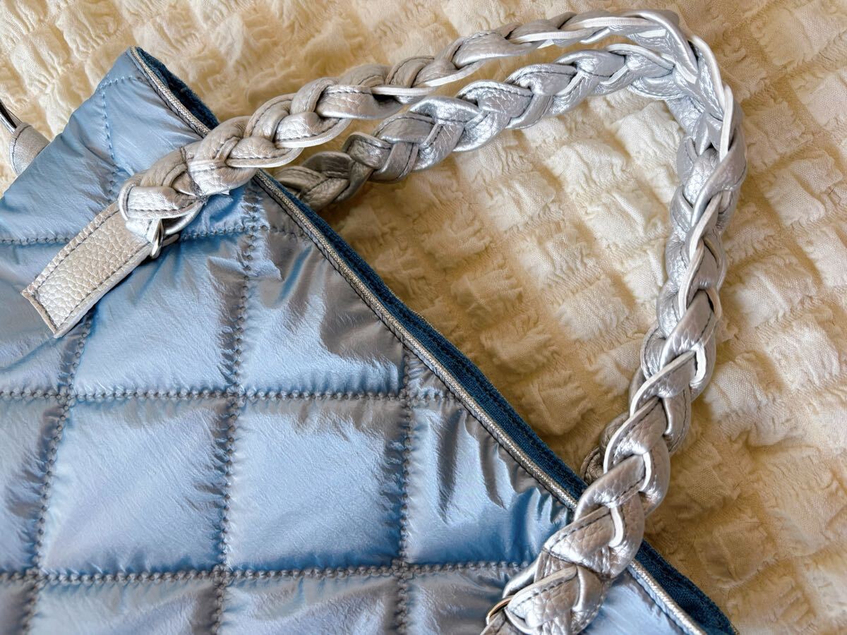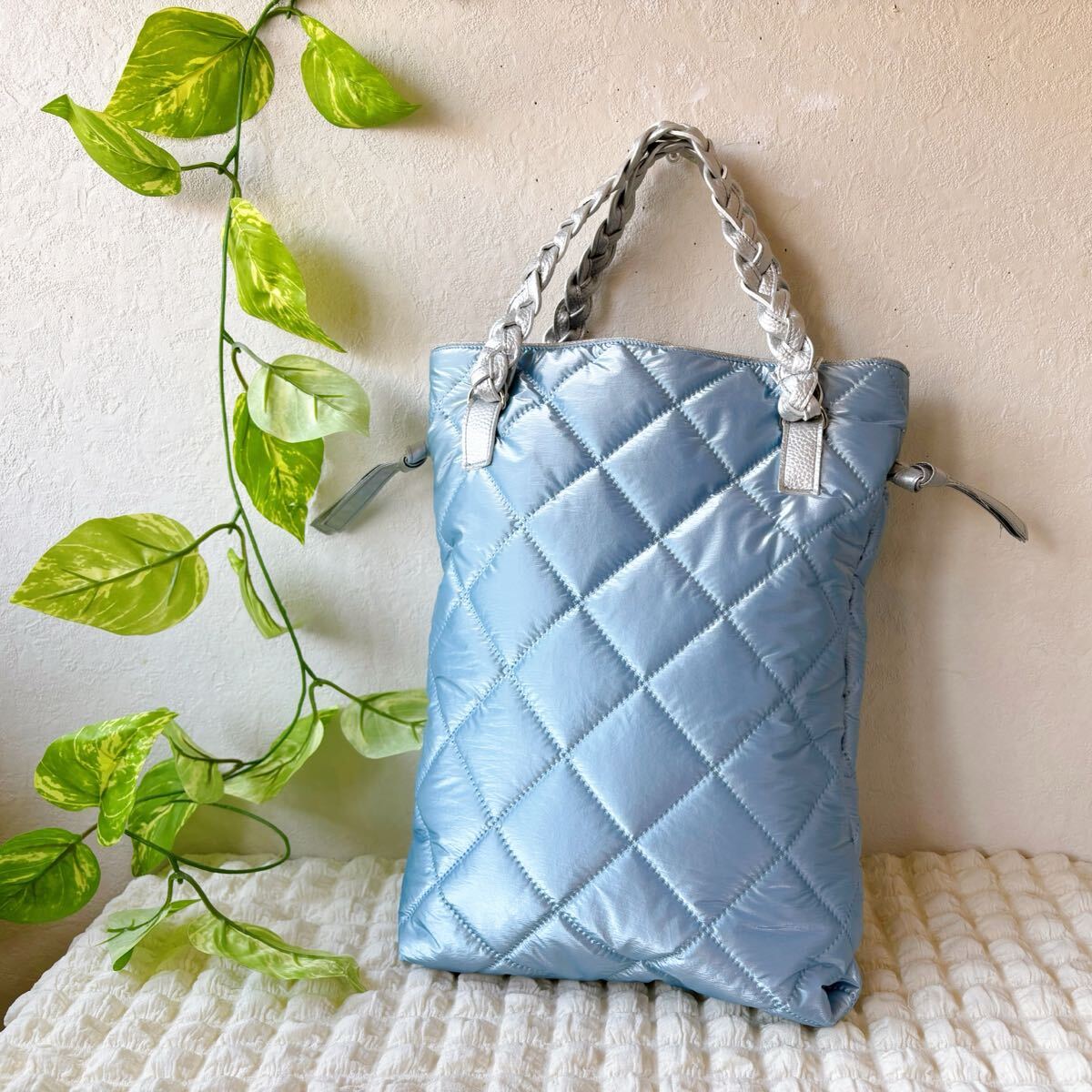 お待たせです♪今回は可愛いシャンパンメタリックブルーキルトでふわふわトートです♪B5ノートがすっぽり収まるサイズなのでサブバッグにも♪サイドの紐を少し絞ると可愛い巾着風にも♪持ち手はPUレザーを編み込みして作りました♪詳細は後ほどです♪ご検討頂けたら嬉しいです。よろしくお願い致しますm(__ )m