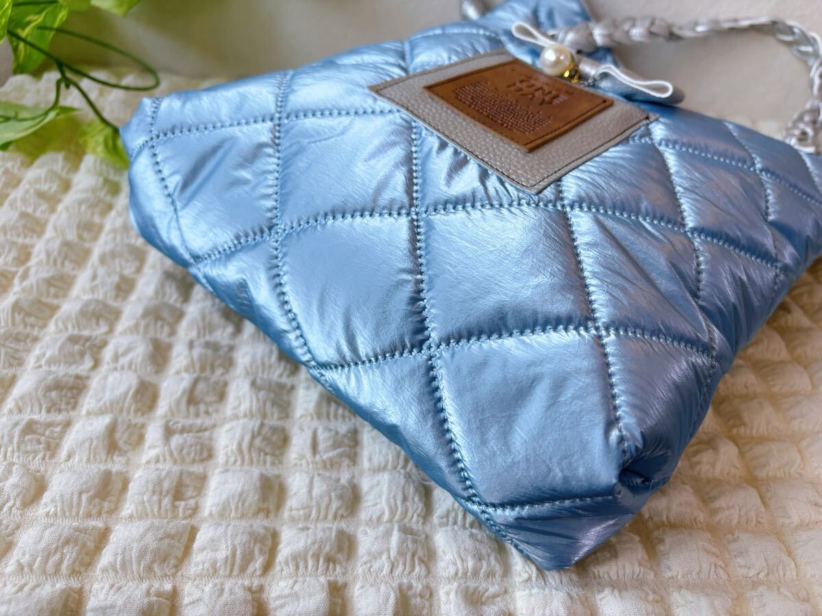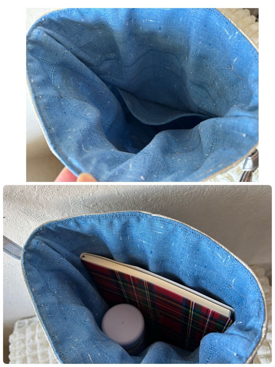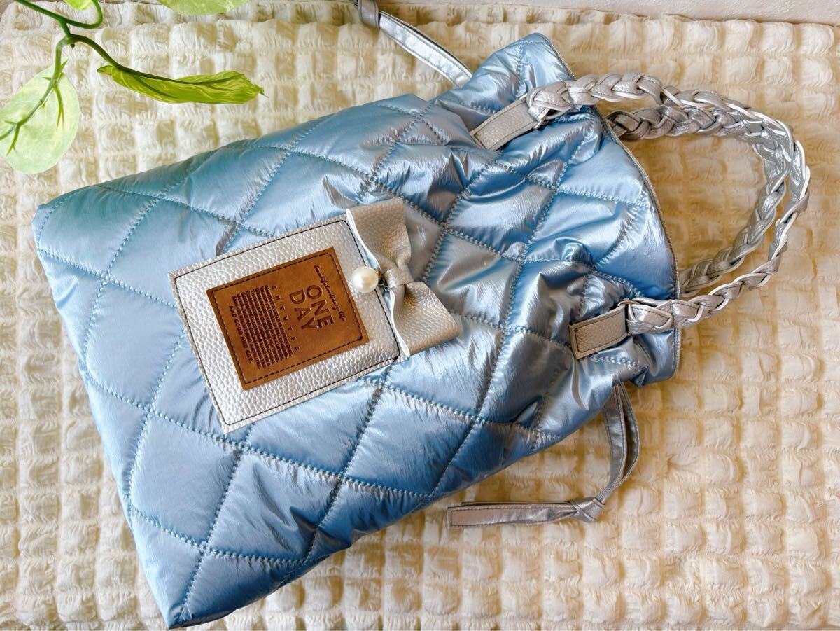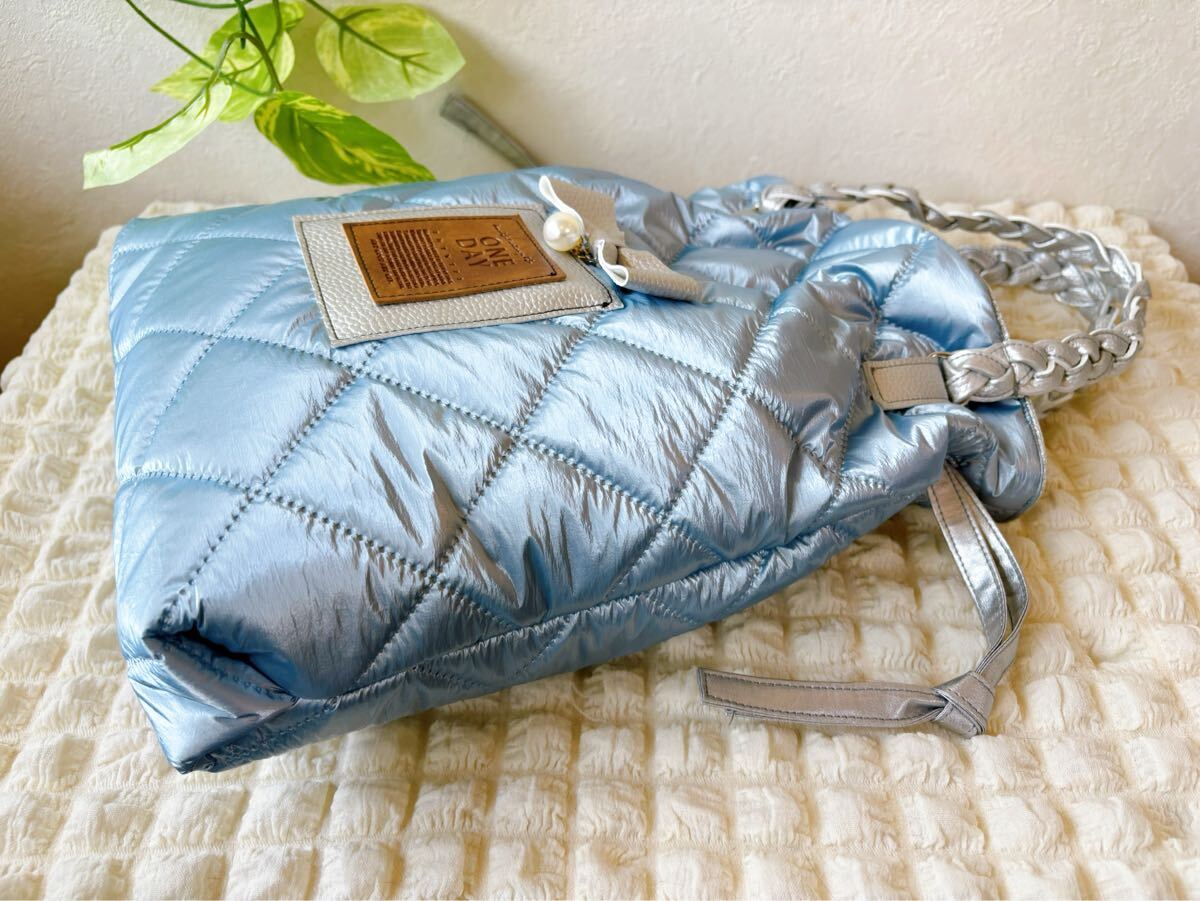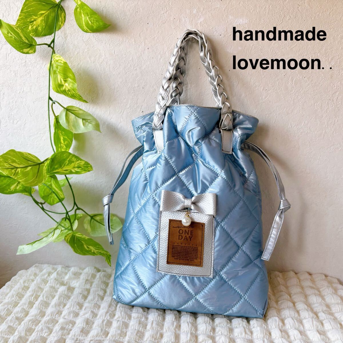 お待たせです♪今回は可愛いシャンパンメタリックブルーキルトでふわふわトートです♪B5ノートがすっぽり収まるサイズなのでサブバッグにも♪サイドの紐を少し絞ると可愛い巾着風にも♪持ち手はPUレザーを編み込みして作りました♪詳細は後ほどです♪ご検討頂けたら嬉しいです。よろしくお願い致しますm(__ )m