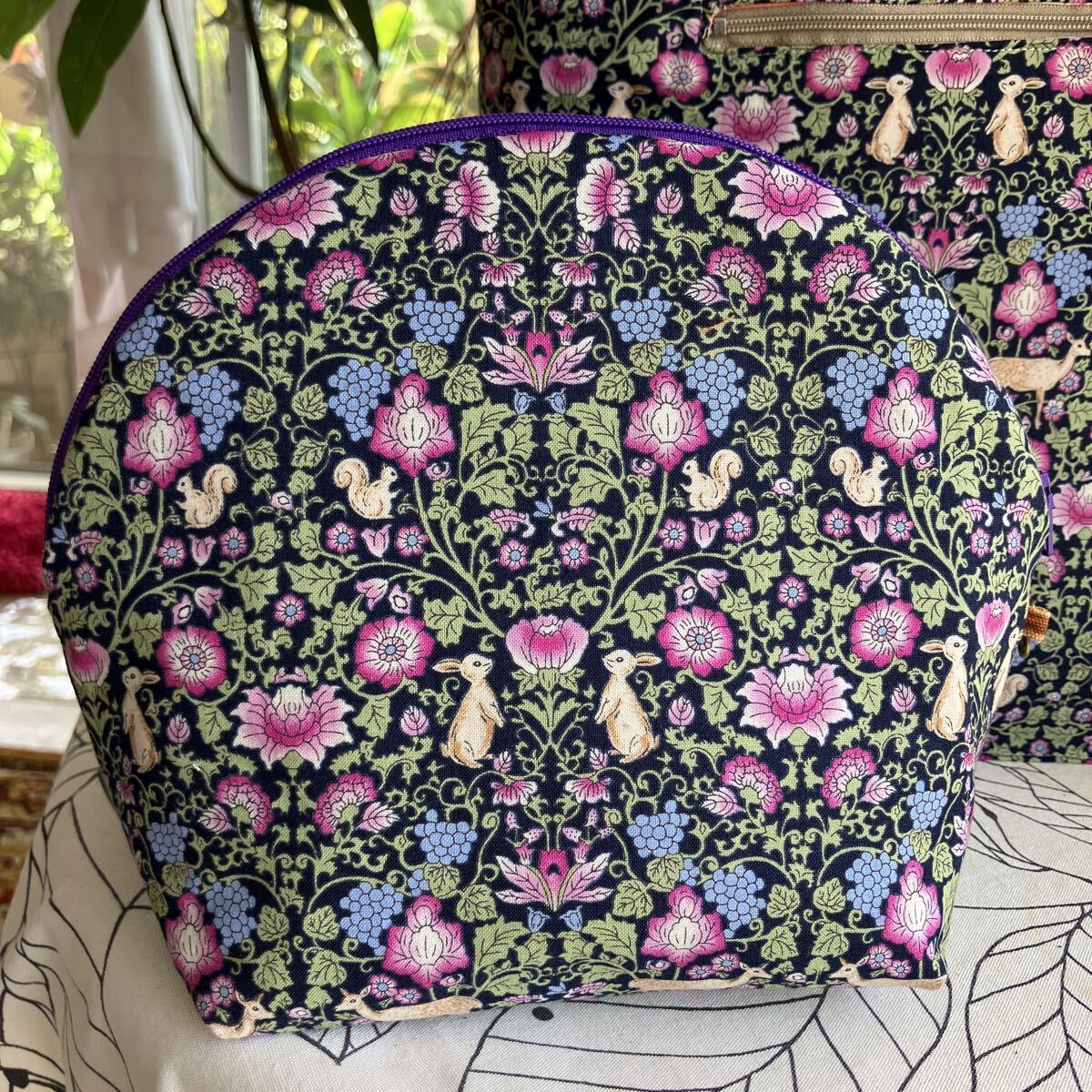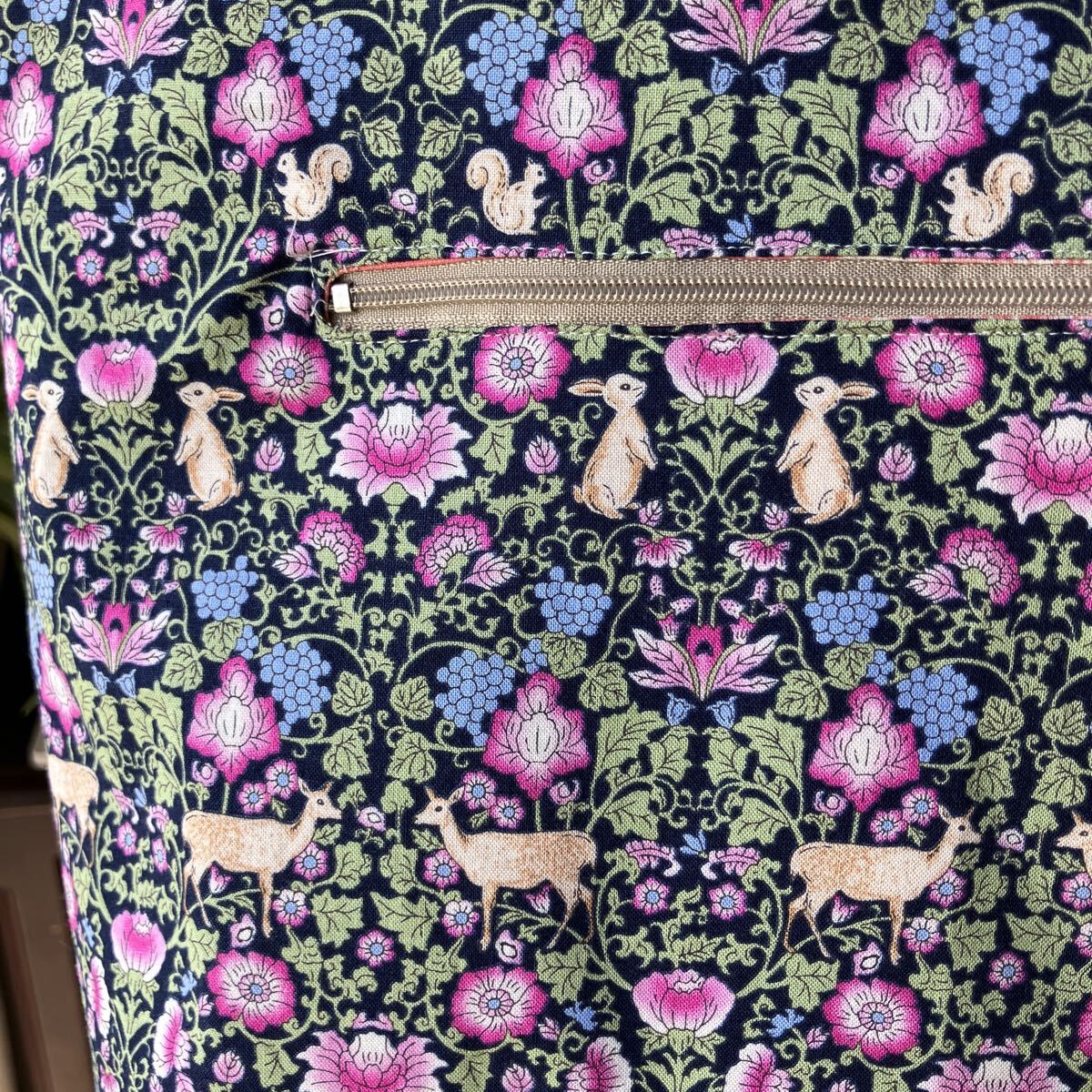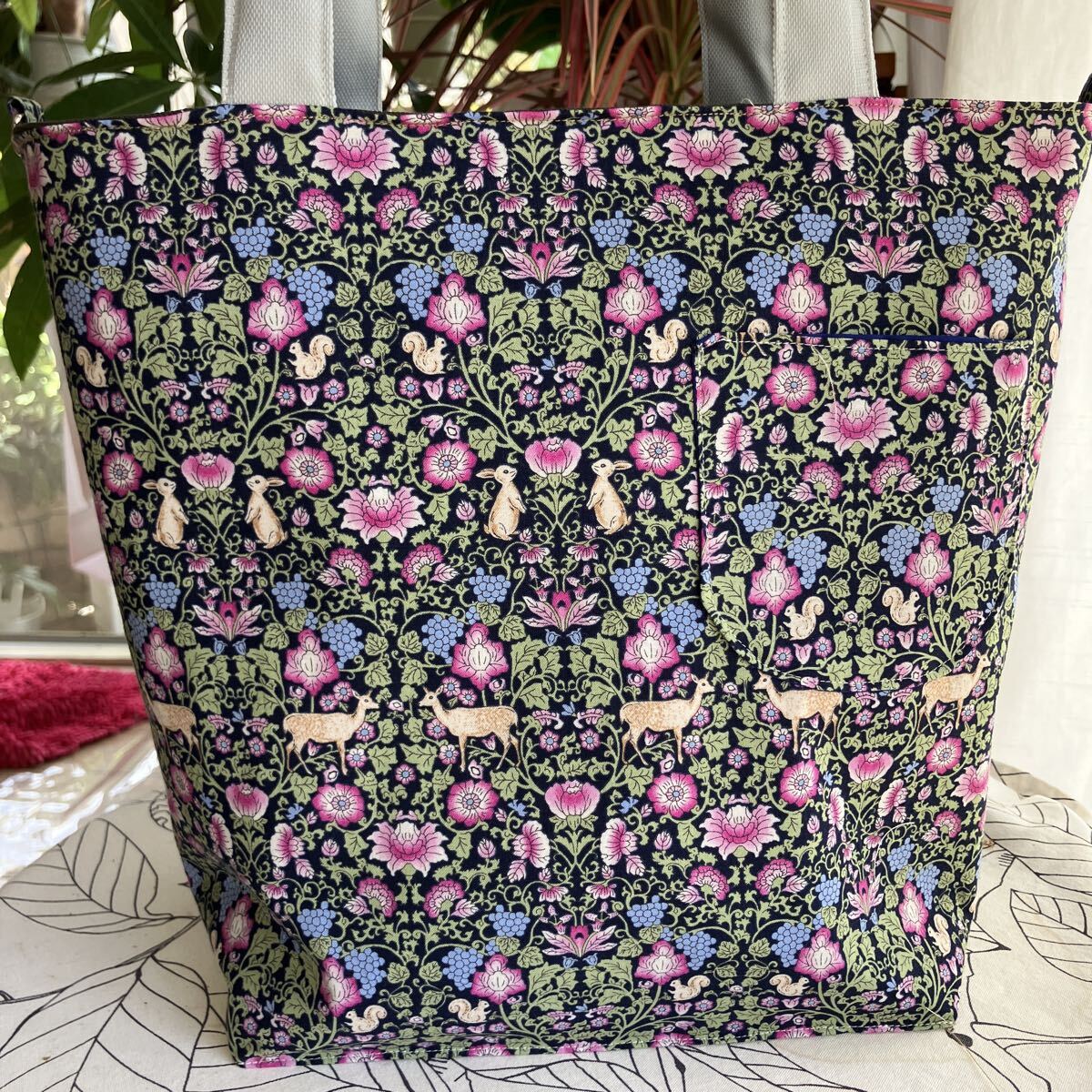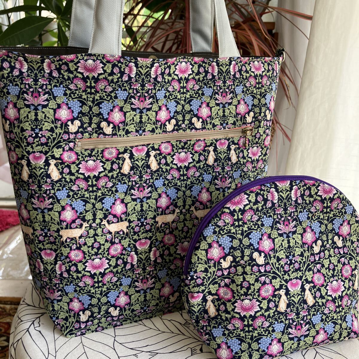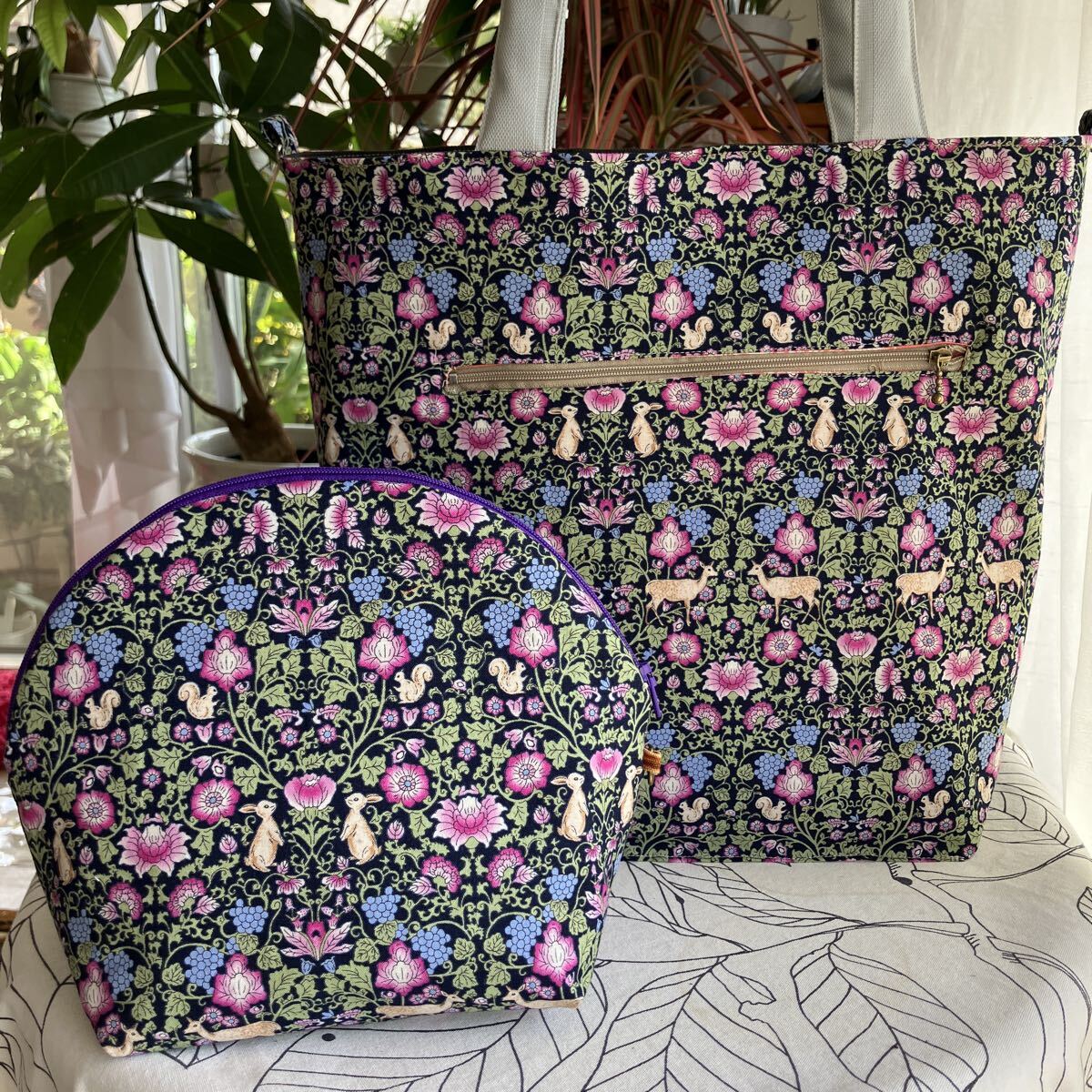 ウサギやシカもいる繊細で上品な植物柄のコットンでふんわりポーチと大きめシンプルなトートを作りました。