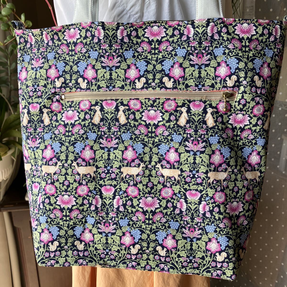 ハンドメイド☆うさぎやシカもいる繊細で上品な植物 使いやすいトートとふんわりポーチ 20㎝のファスナーポケットが便利