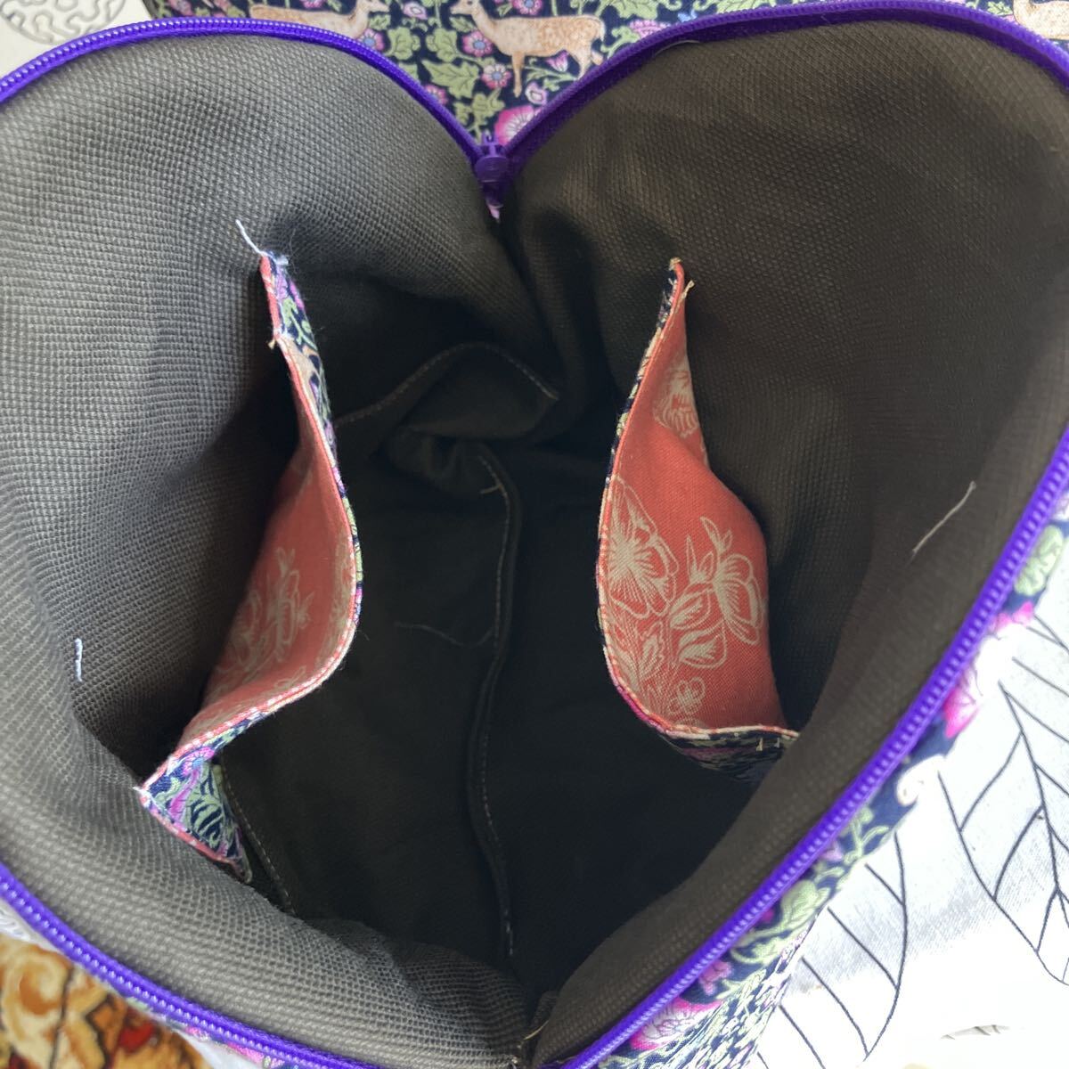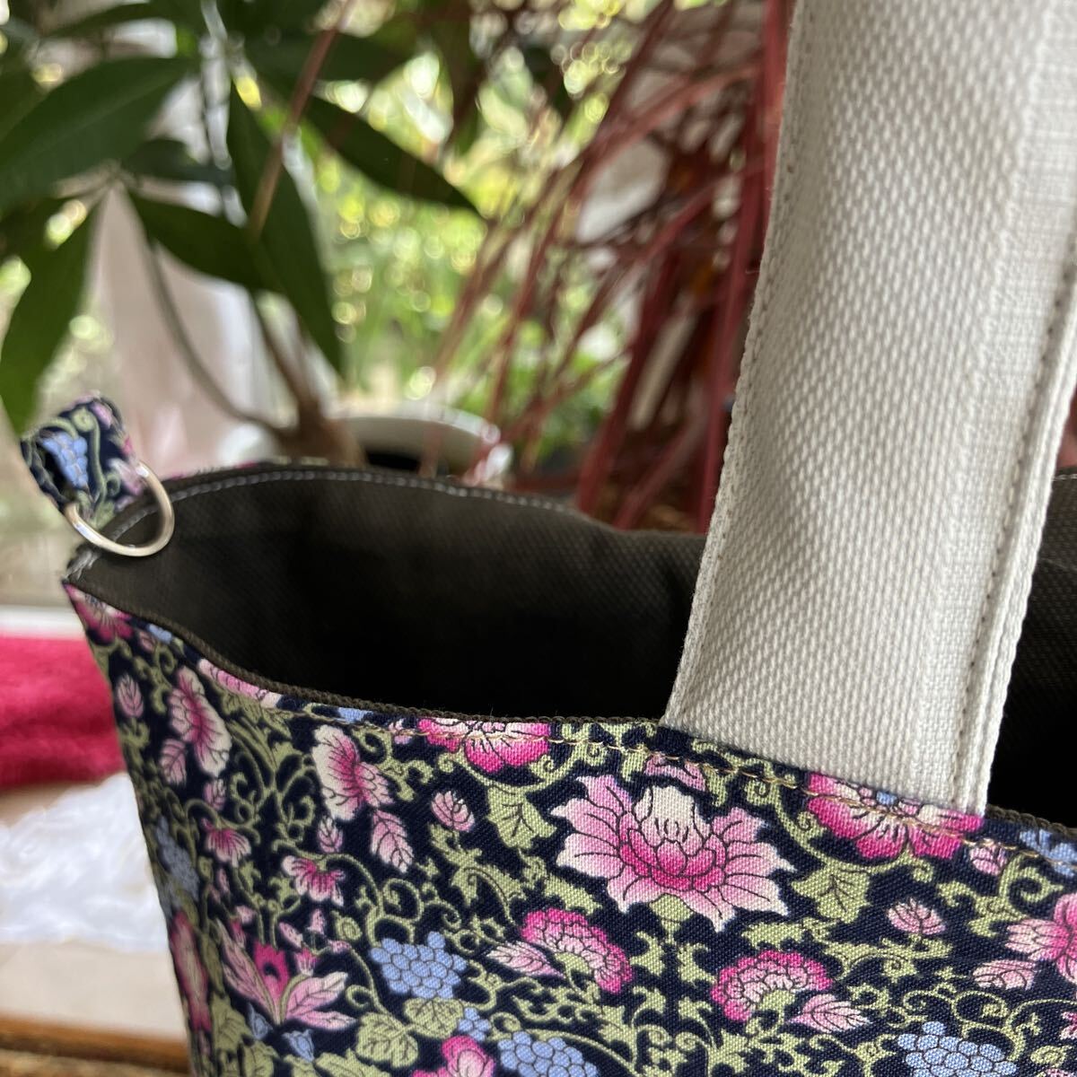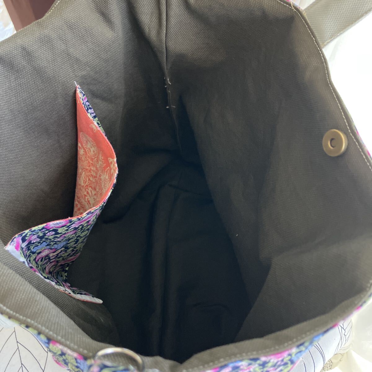 トートは肩からも掛けられます。容量もあります。表地に接着芯を貼っています。20㎝のファスナーポケットが便利です。