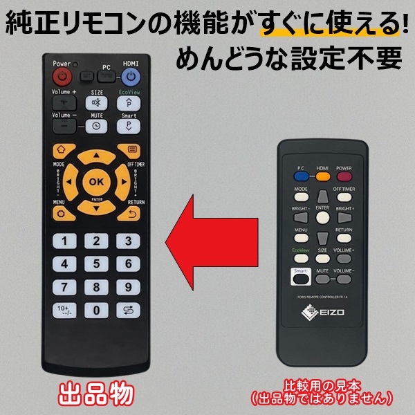 【商品名】 EIZO FR-14 代替リモコン 【対応機種】 FS2333 FS2434 FDF2305W用 比較画像の右側の純正リモコンが付属する機種に使用出来ます。 上記機種以外については、質問欄よりメーカーと型番をご連絡頂ければ、対応品のご案内をしております。 【商品について】 左側の代替リモコンが出品物になります。右側のリモコンは見本画像です。 タイトル機種のリモコン信号を入力した、設定不要で使える純正品と同等の代替リモコンです。 乾電池は付属しません。別途ご用意下さい。(単4乾電池×2本) 【商品サイズ】 縦15cm×横5cm×高さ2.3cm 【発送について】送料無料 迅速発送を心掛けております。土日祝日はお時間を頂く場合ございます。 ポスト投函配達となり、日時指定は出来ません。 | ||