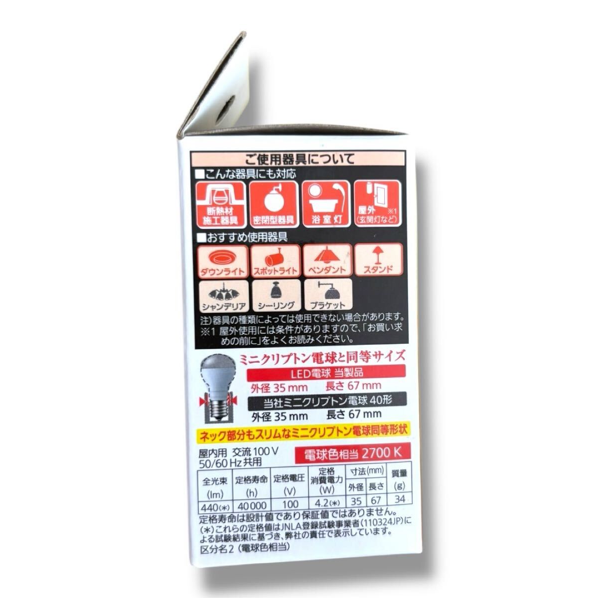 配光角140度で下方向を明るく照らす断熱材施工器具対応密閉型器具対応光色:電球色相当口金E17定格寿命:40,000時間屋外用器具への取り付け対応調光器対応非対応