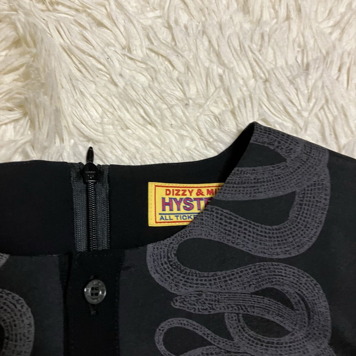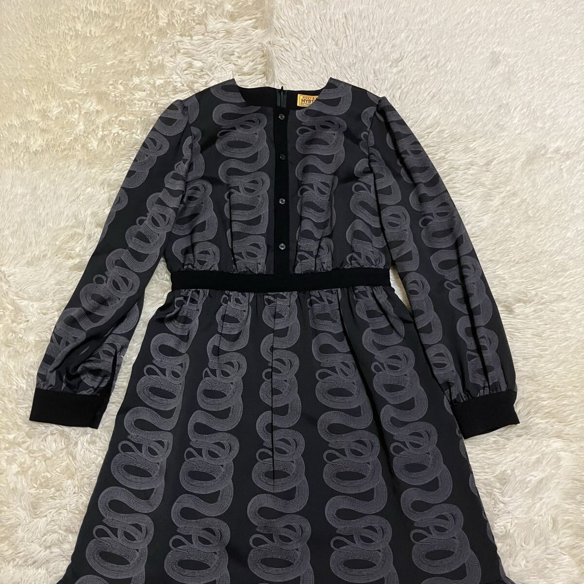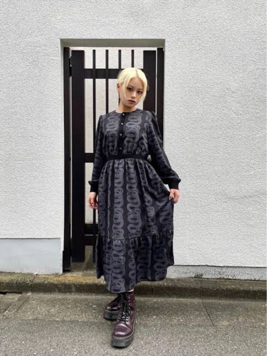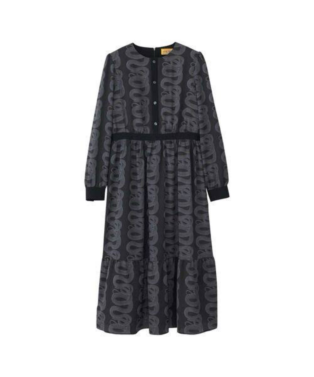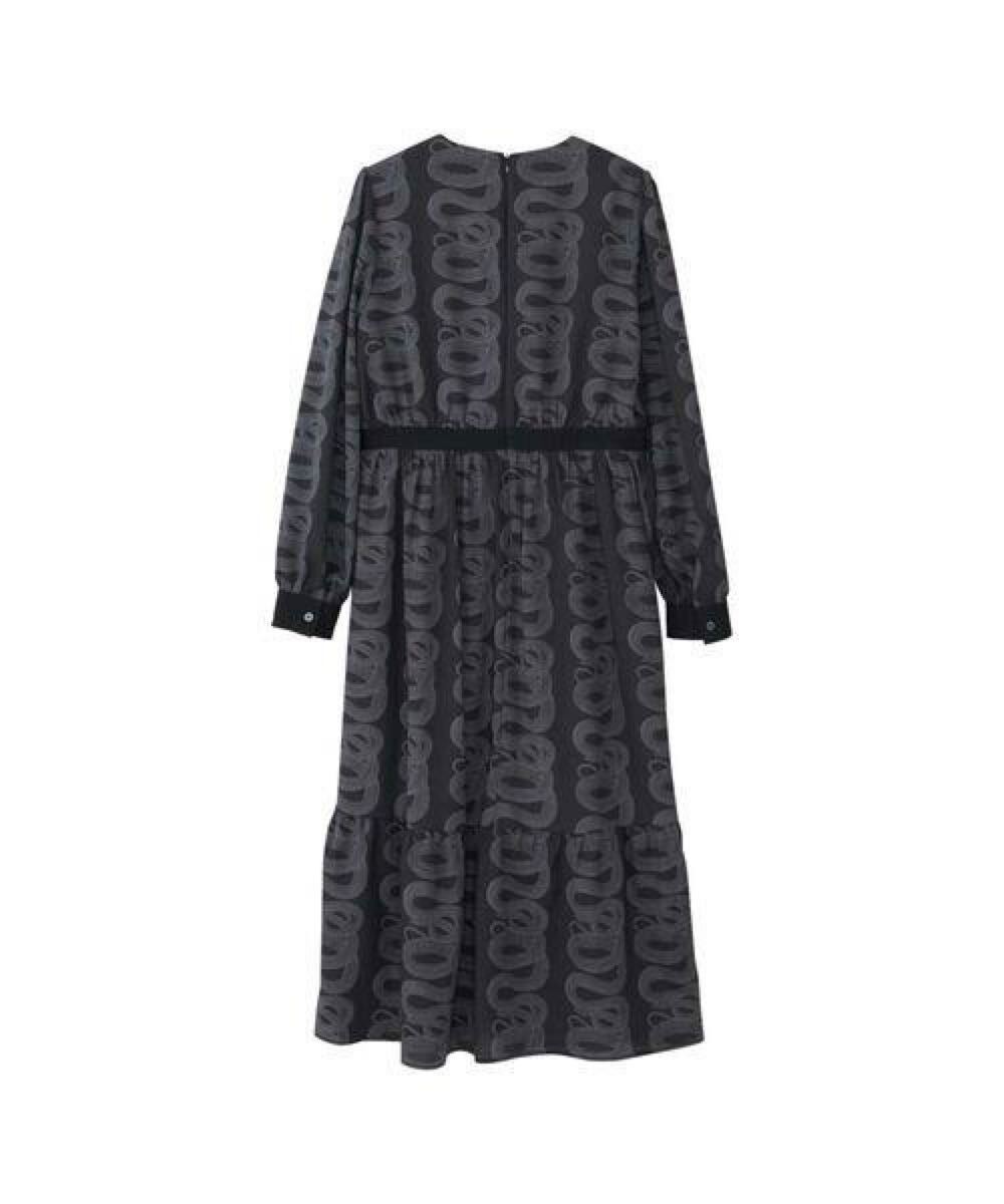 ギャザーをたっぷり施したノーカラーワンピース。シャリのある適度な張り感と、シボ立ちが良い表面感が特徴の微光沢素材を使用。90年代HYSTERIC GLAMOURのリバイバル、SNAKE LOOP柄を抜染プリントで繊細に表現した。身頃とスカート部分が裏地付きなので、透け感を気にせず着用できる。
