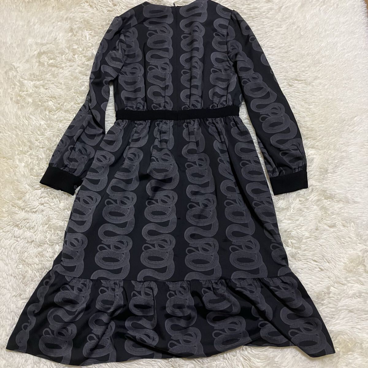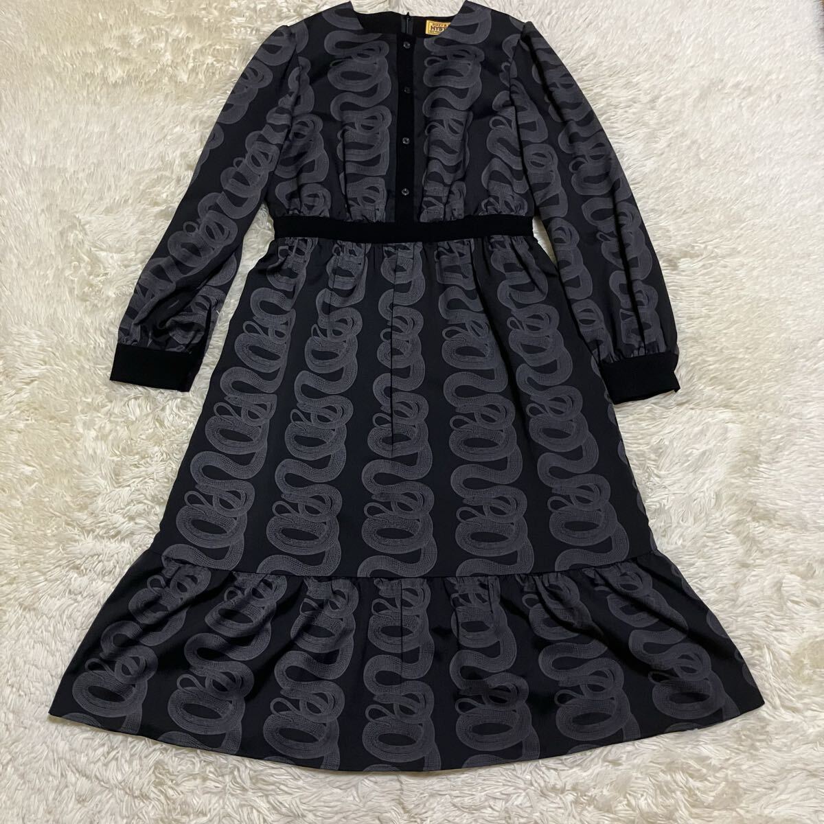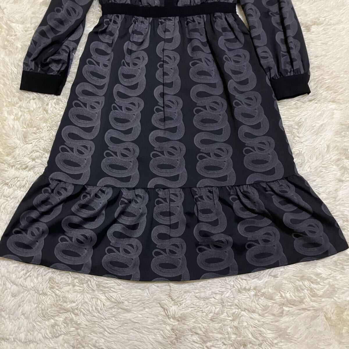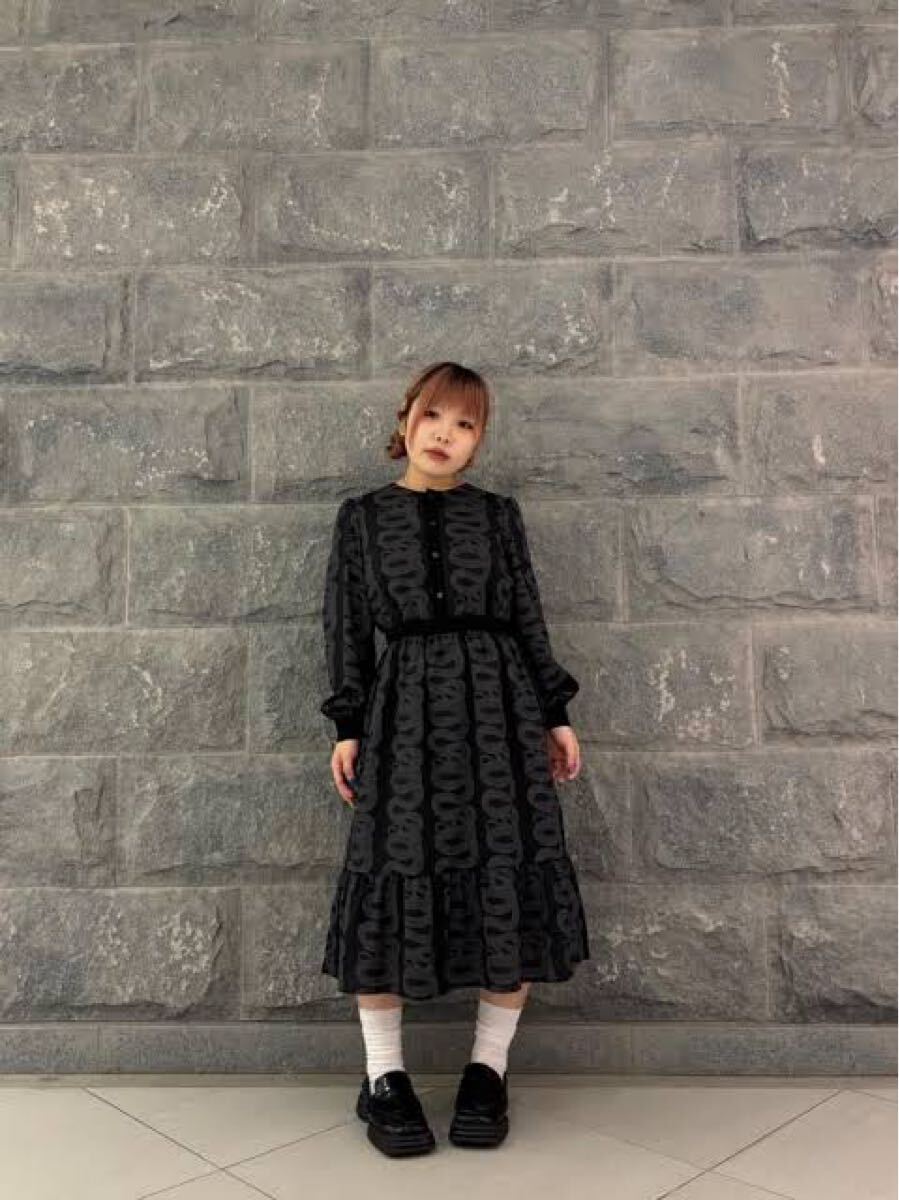 ギャザーをたっぷり施したノーカラーワンピース。シャリのある適度な張り感と、シボ立ちが良い表面感が特徴の微光沢素材を使用。90年代HYSTERIC GLAMOURのリバイバル、SNAKE LOOP柄を抜染プリントで繊細に表現した。身頃とスカート部分が裏地付きなので、透け感を気にせず着用できる。