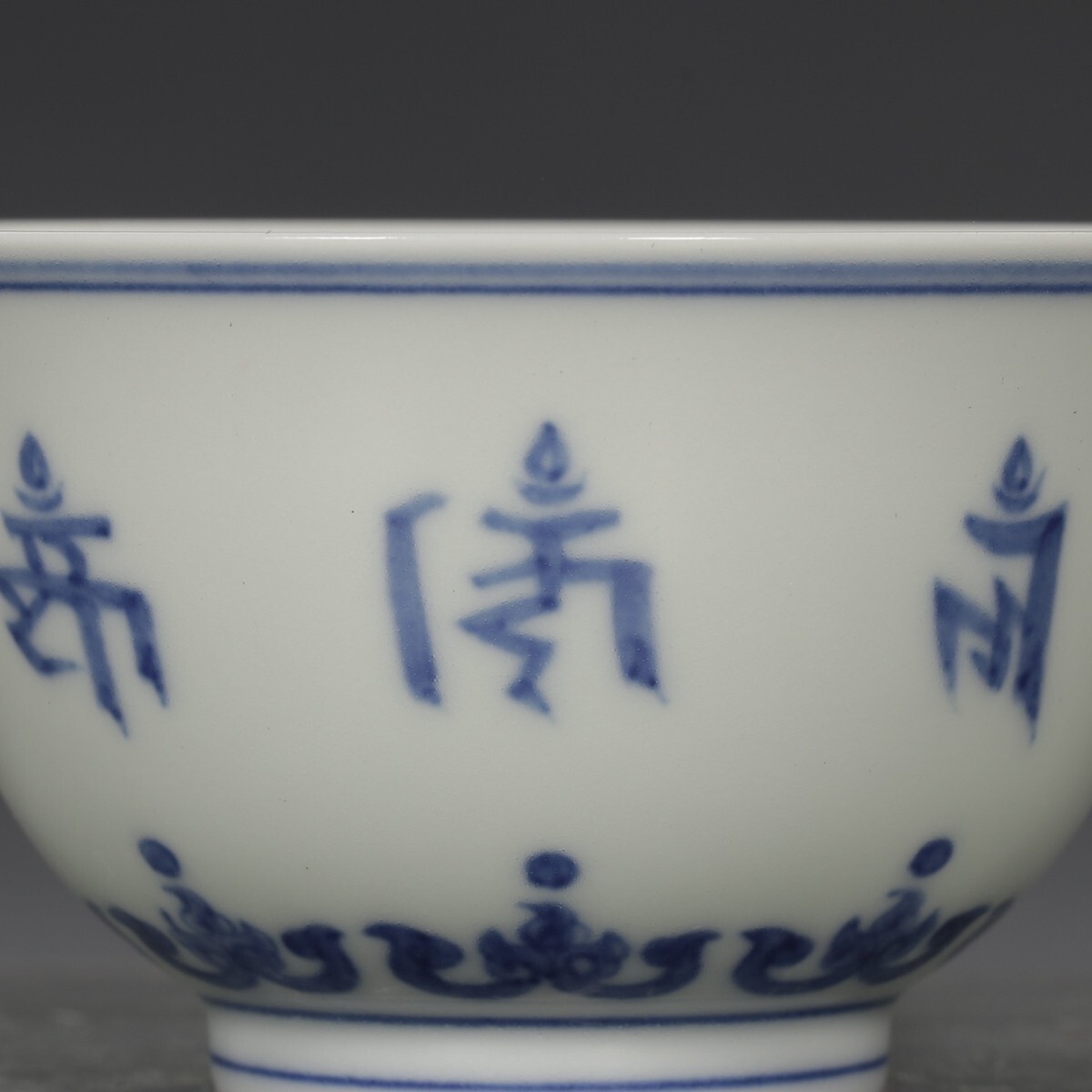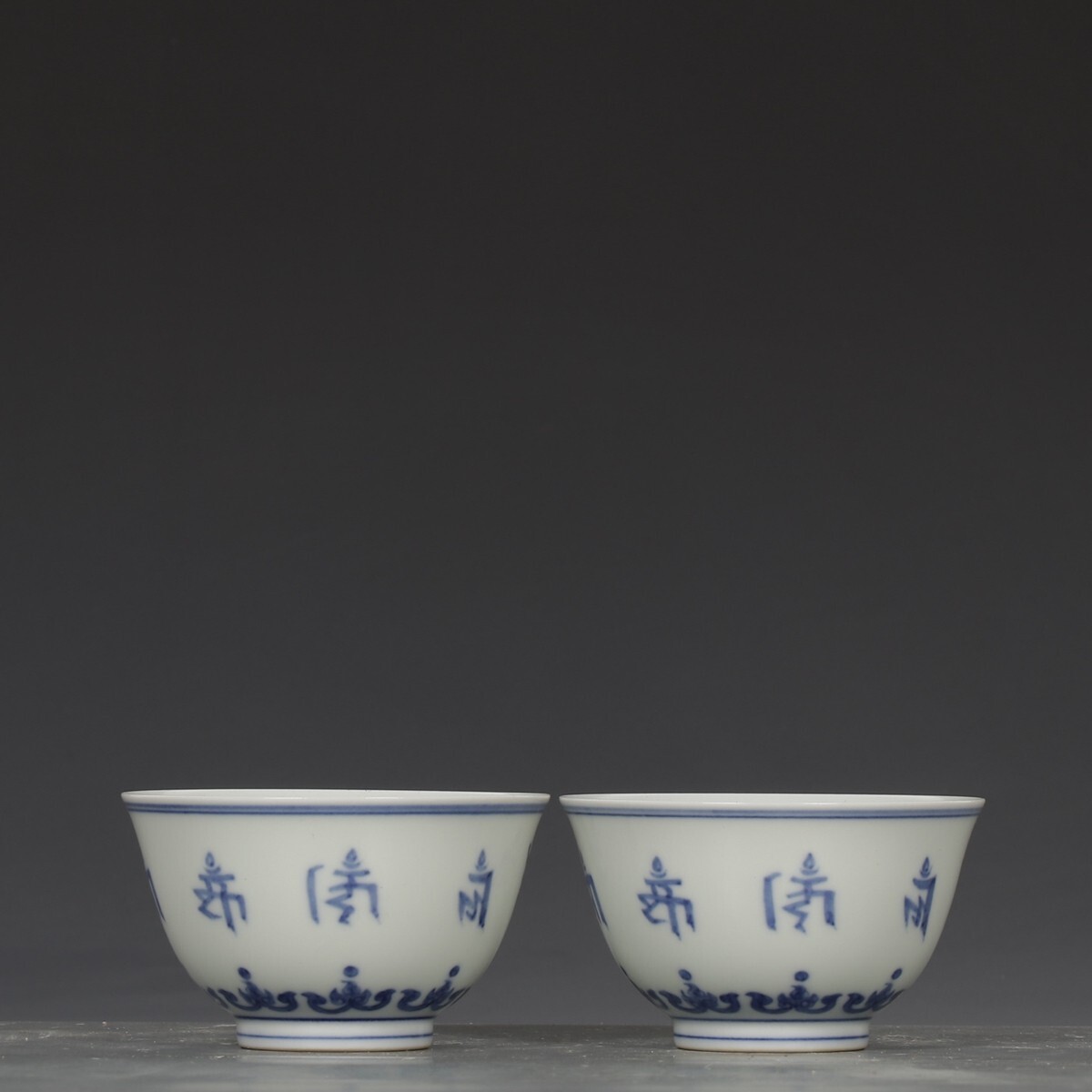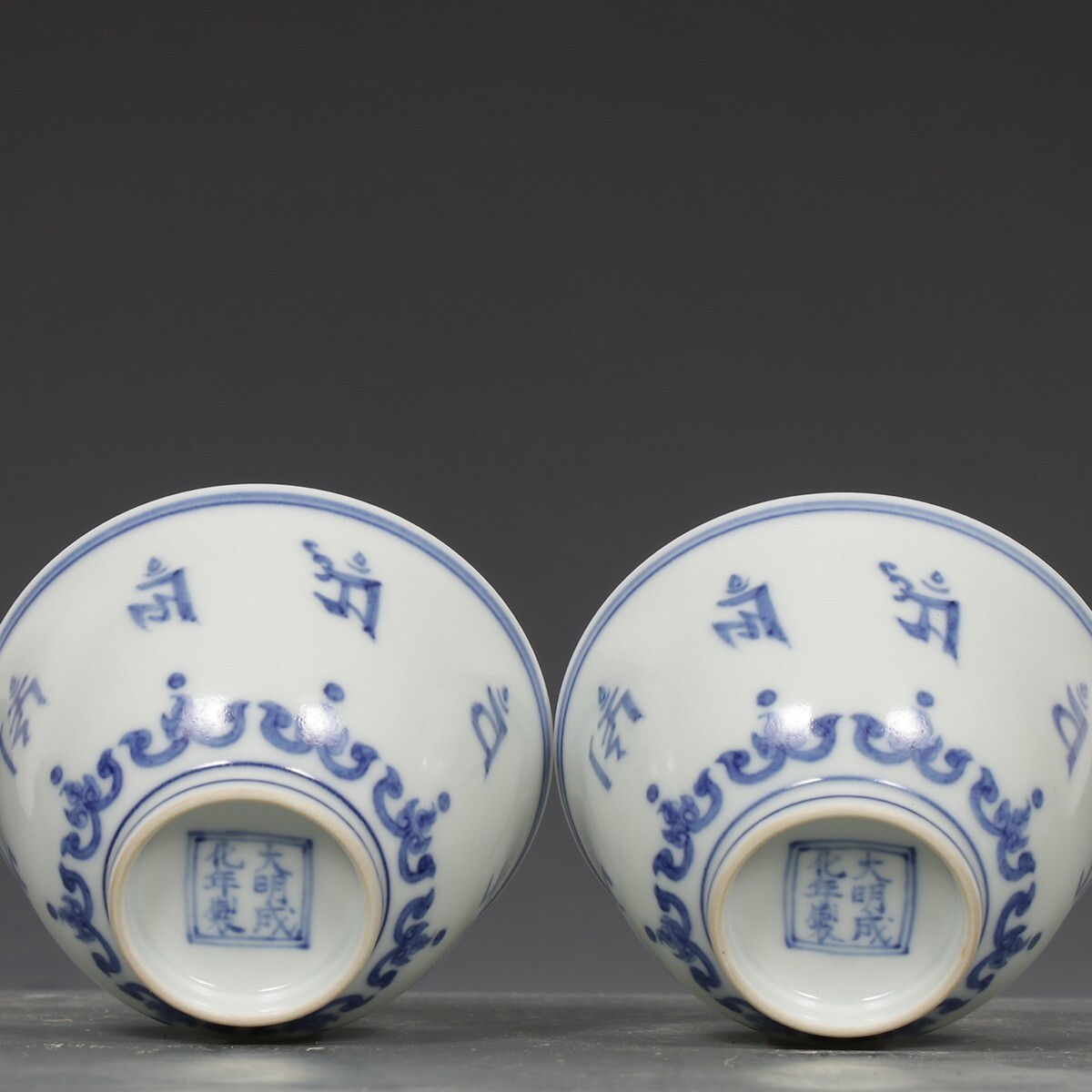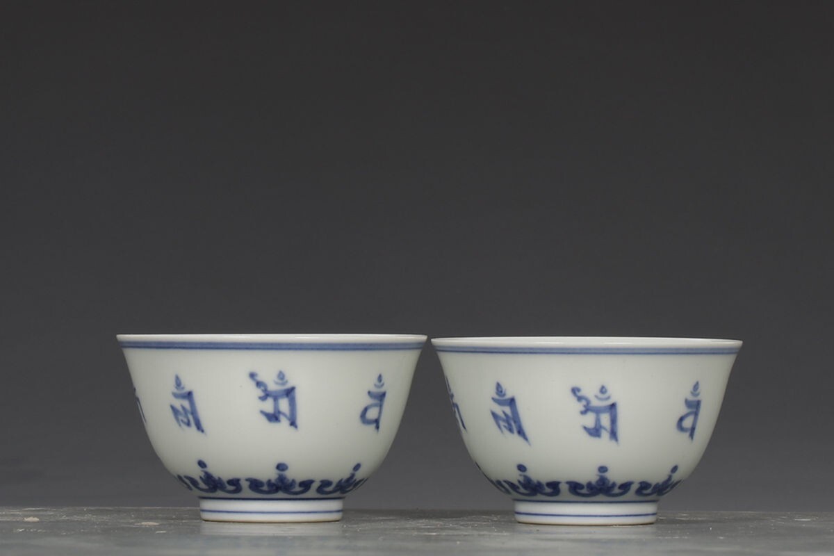 「明 成化年製 陶磁器 青花梵文杯一対」染付 置物 擺件 古賞物 中国古美術 旧蔵出