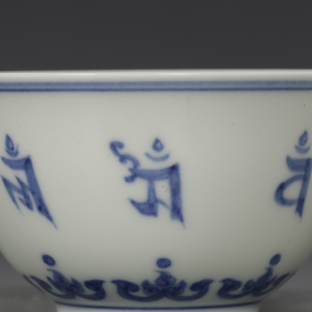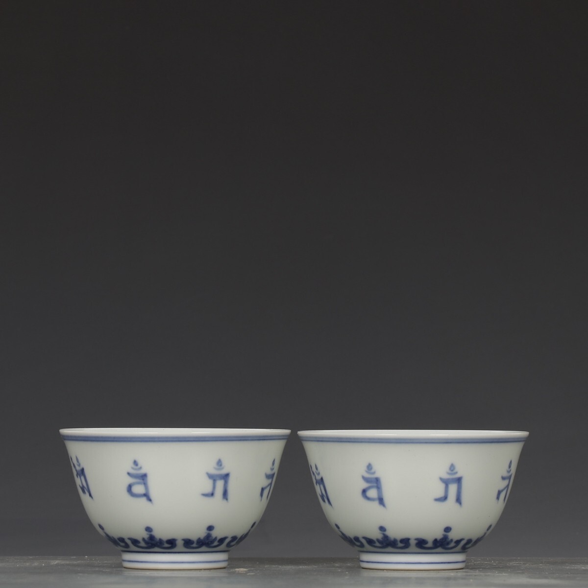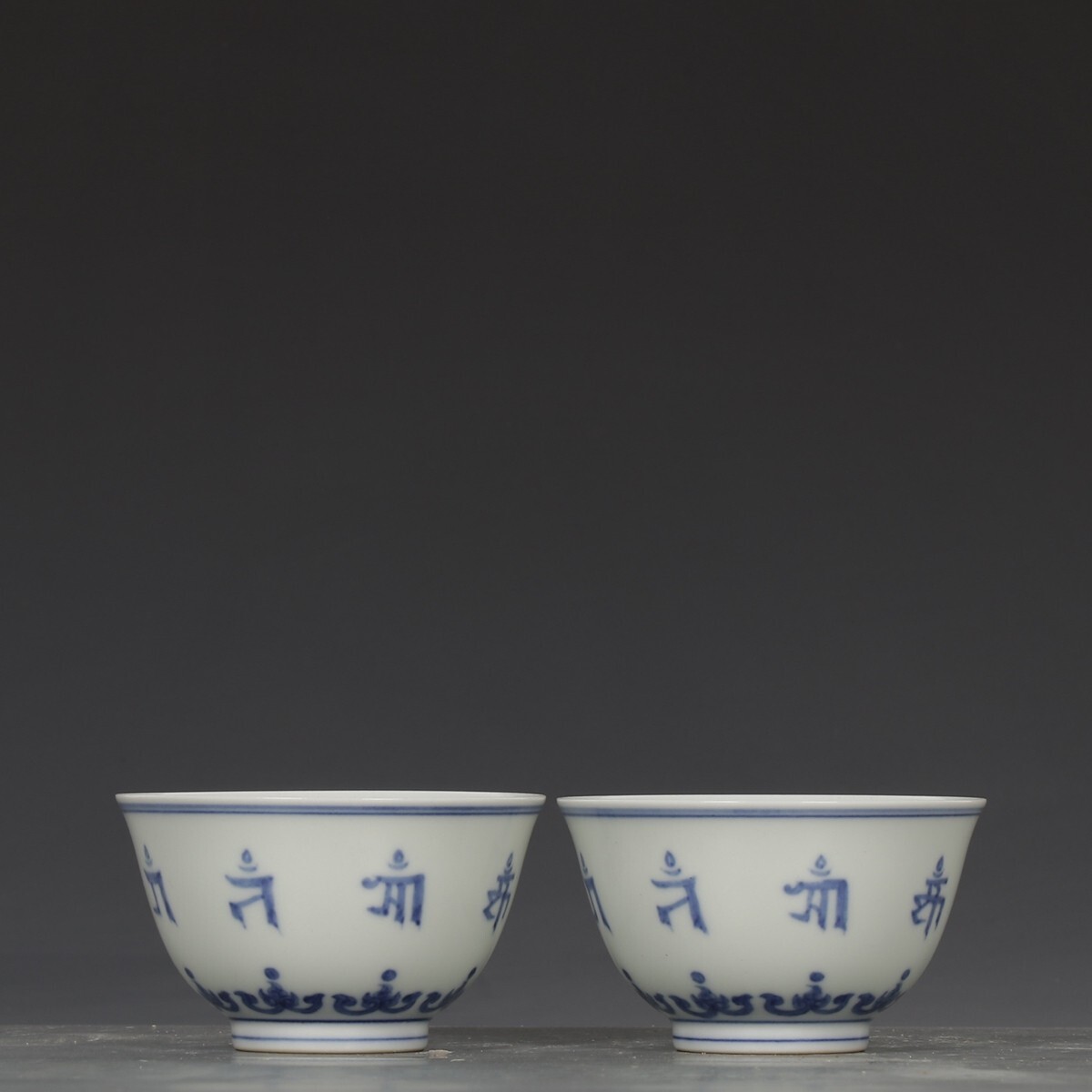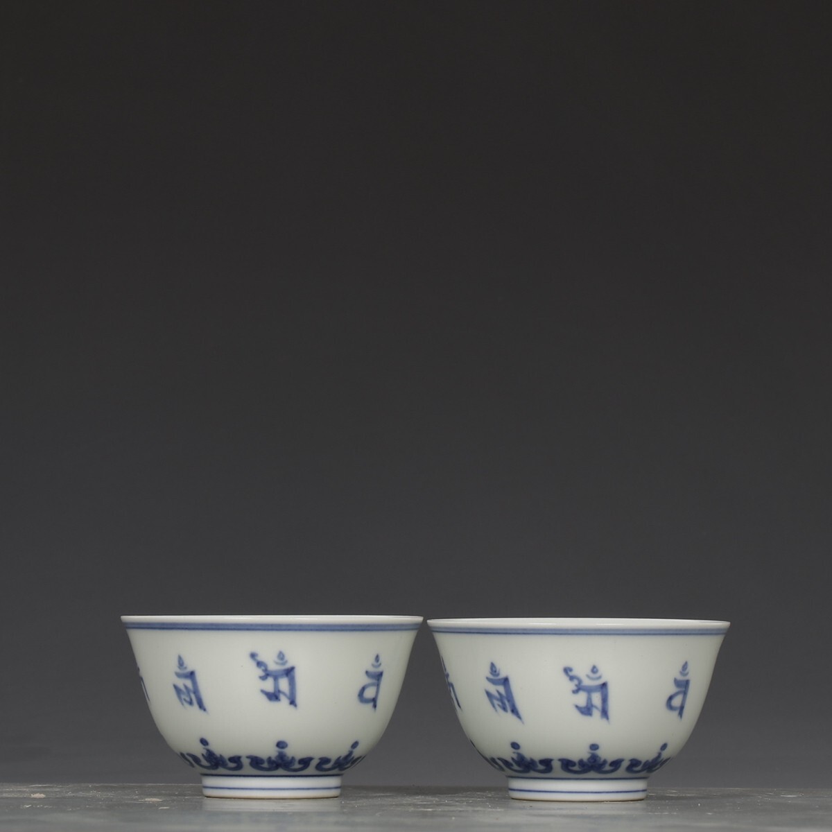 「明 成化年製 陶磁器 青花梵文杯一対」染付 置物 擺件 古賞物 中国古美術 旧蔵出