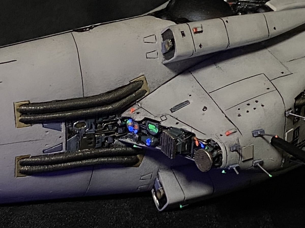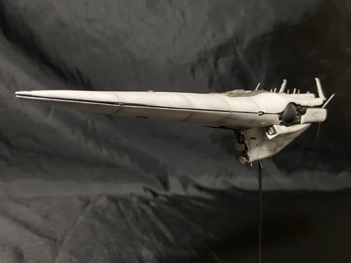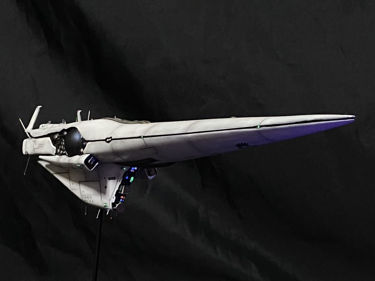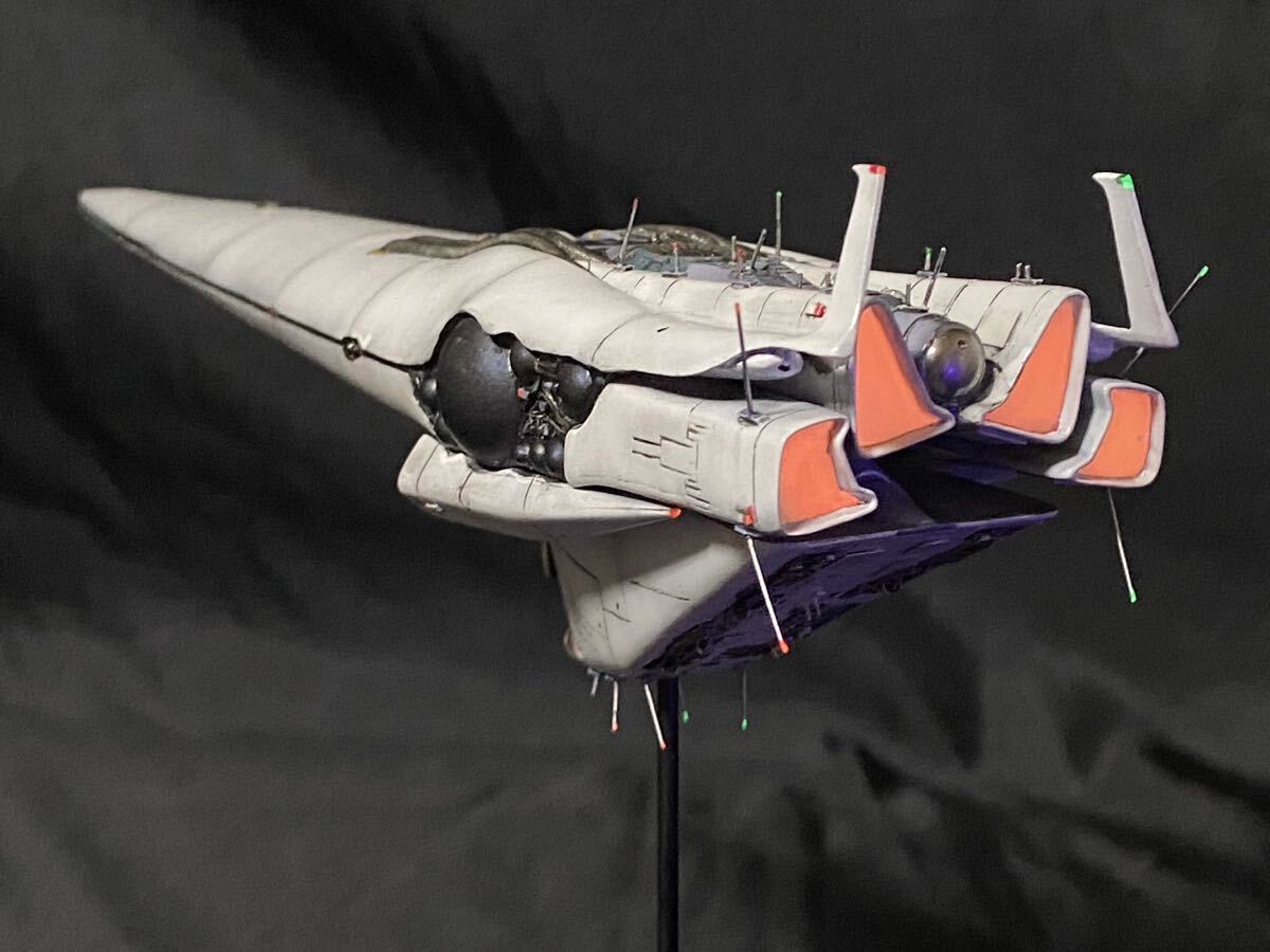 塗装は下地にガンメタルからクレオスのブリュンヒルトホワイトを基本色に5段階の様々なホワイトパールを調色吹き重ね、再度ブリュンヒルトホワイト+クリアでカウンター塗装で白に戻し深みのあるパールホワイト塗装。エンジンはブラックライトで蛍光赤に発光。また艦舷灯は蛍光レッド/蛍光イエローグリーンで塗装し、センサー類は蛍光ブルーも加えブラックライトで発光。