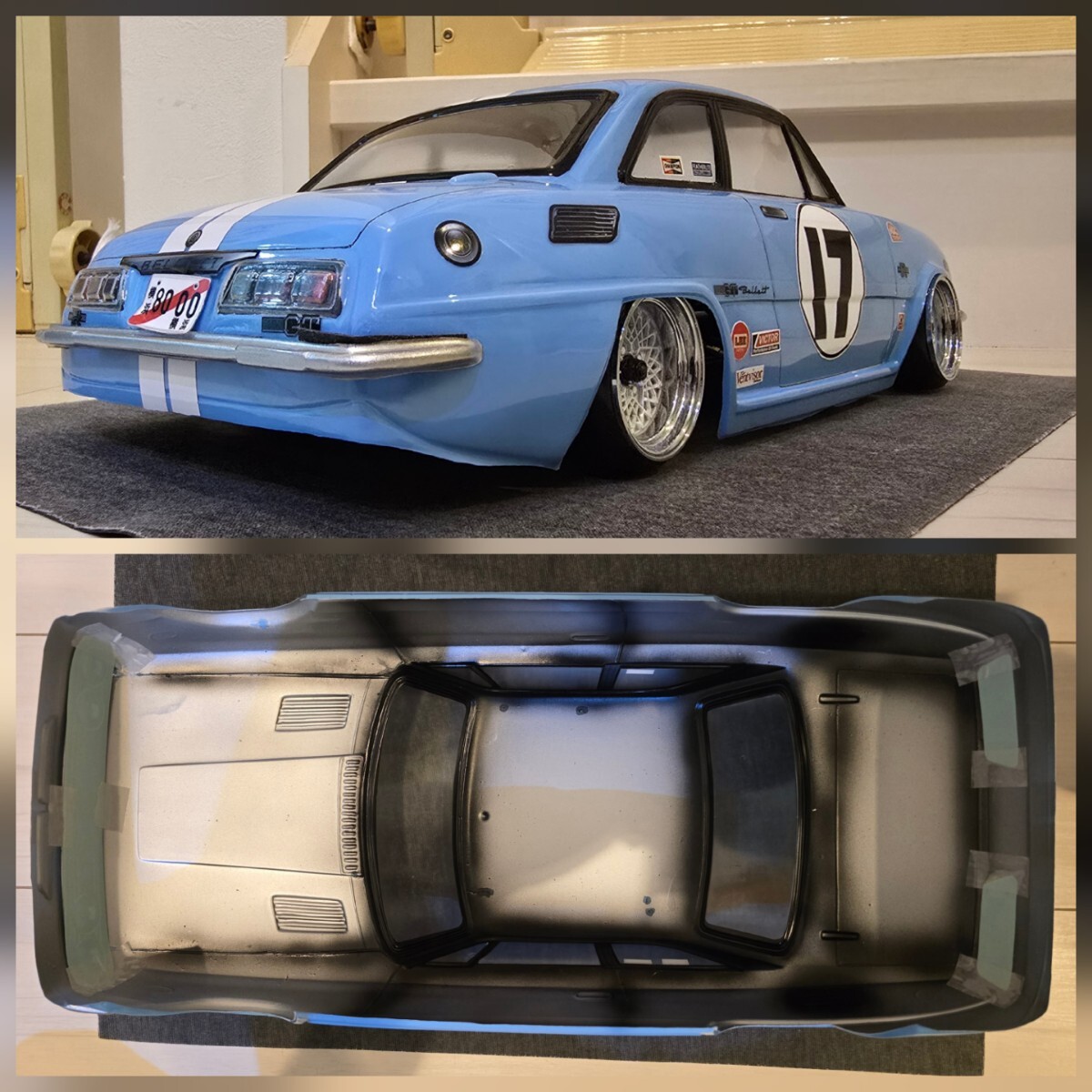 エアブラシにて、塗装密着用にSHOW UP PCバインダー後、ファスカラーの調色でFasSky、裏打ちはタミヤポリカスプレーにて、ホワイト、シルバーにて仕上げています。パネルラインはブラック、バンパーパーツはサテンシルバーアルマイトを使用しています。