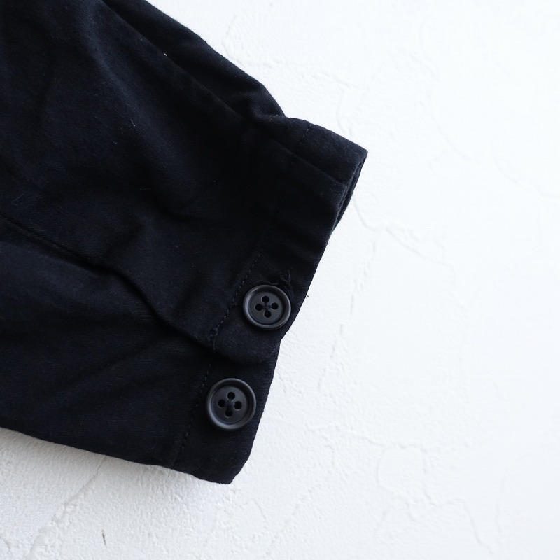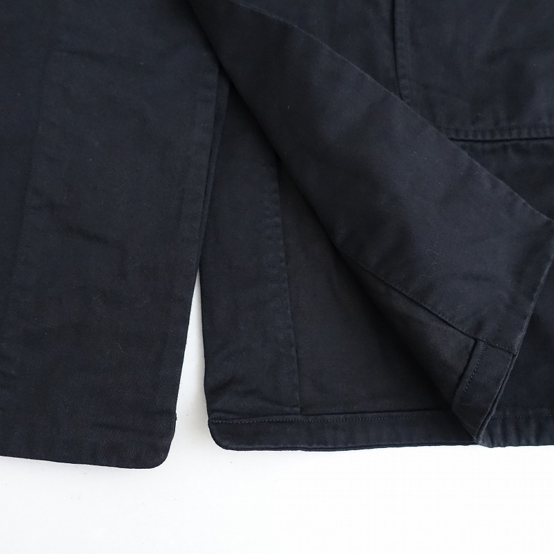 | YAECAの155057 Atelier Coatです。カラーはブラックで、コシのある綿×混紡素材です。フロントボタンで着脱でき、袖口は2段階に調節可能なボタン留めで、バックセンターベント入りです。前腰左右&左胸にパッチポケット付きで、前腰左右に内ポケット&左胸内側にペン挿しがあり、上身頃のみ裏地付きです。定価(メーカー希望小売価格)63,800円の商品です。こちらは、元々の製品に工房で染め直しを施しました。 |