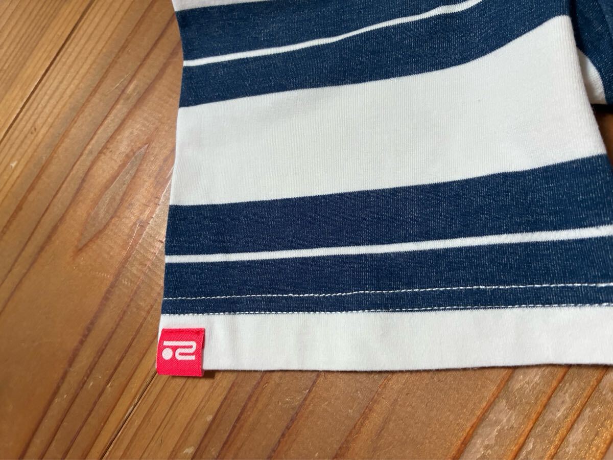 ボーダー柄で、胸にポケットのあるハイネックにデザインです。