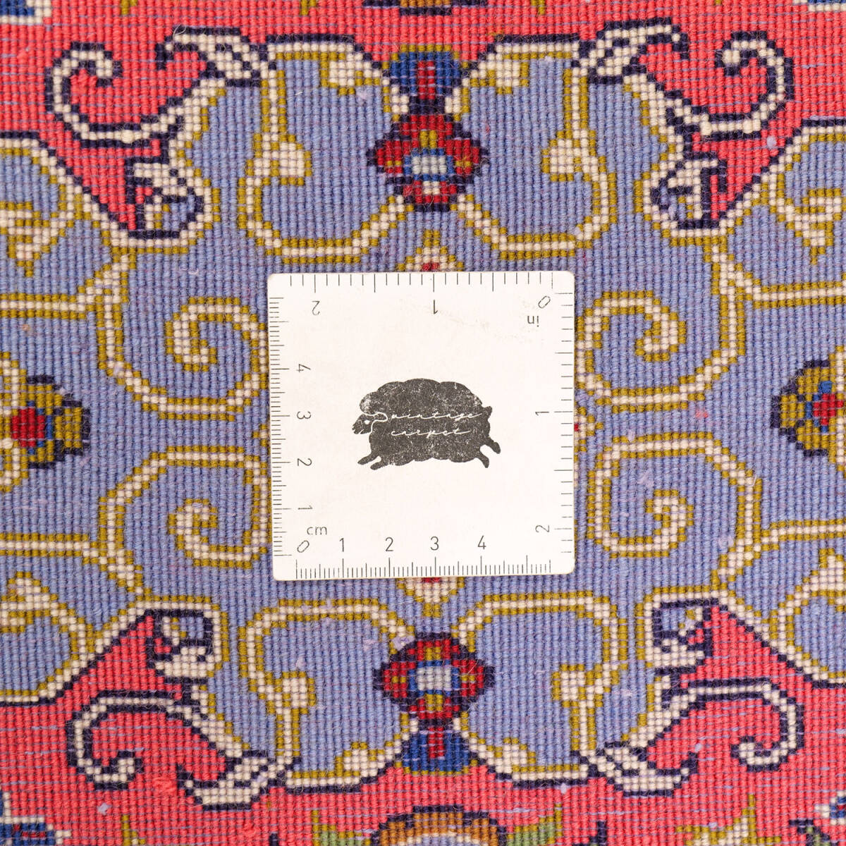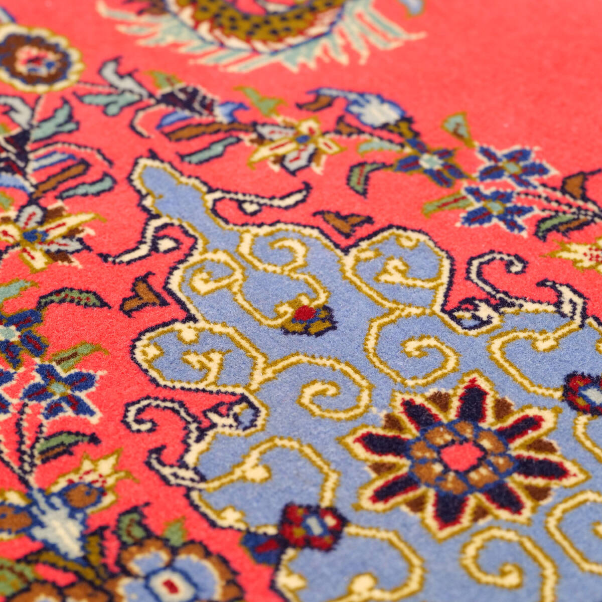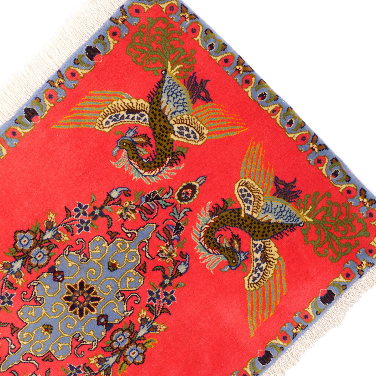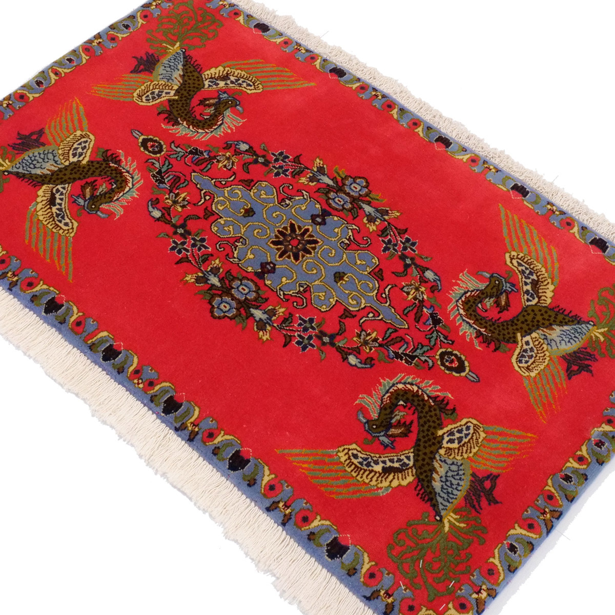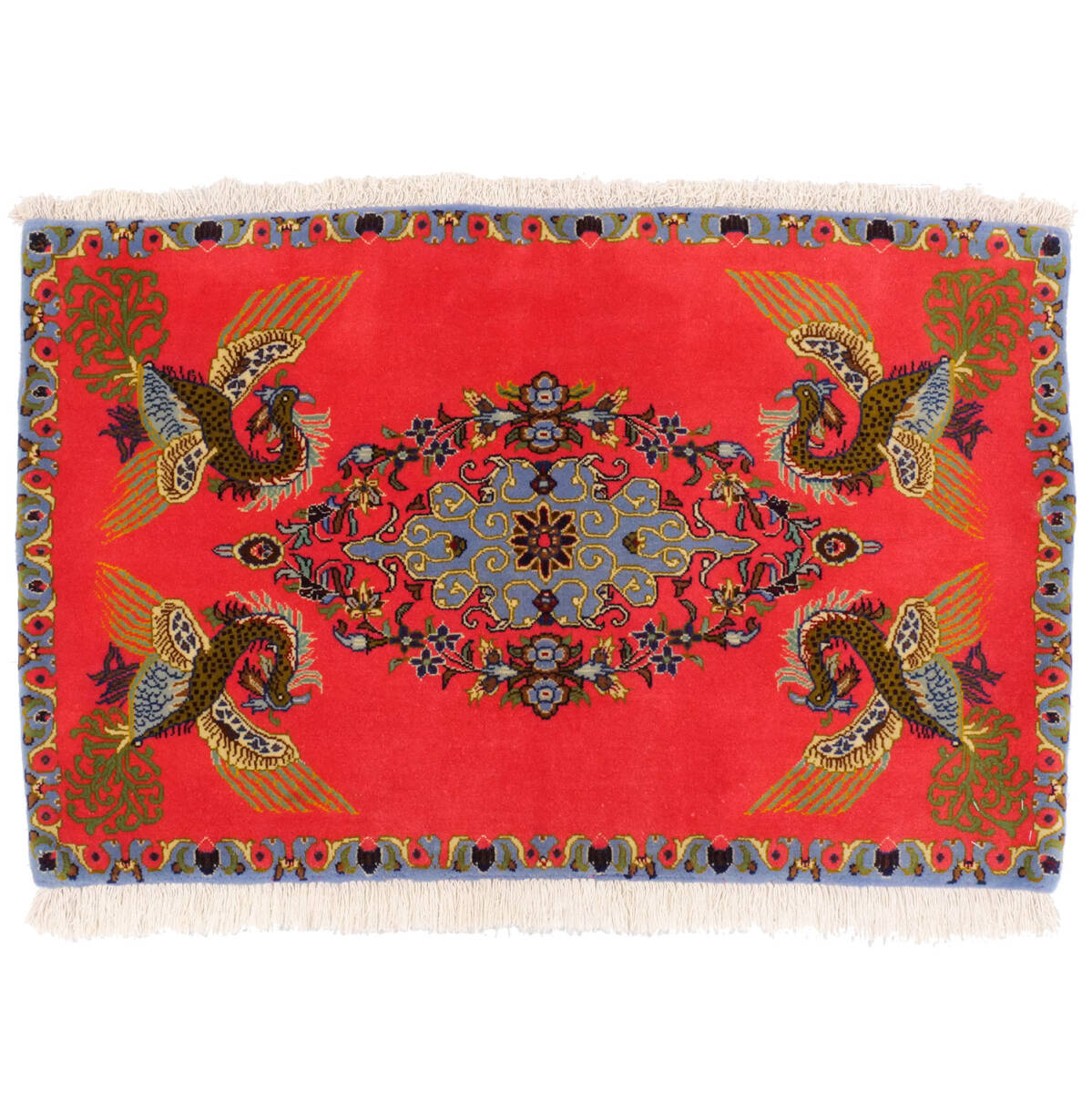 1960年代のカシャンで制作された、精緻なフェニックス文様が魅力のセミアンティークラグです。中央には左右対称に配置されたアラベスク風の装飾モチーフが広がり、その周囲を4羽のフェニックス(神鳥)が取り囲む幻想的な構図となっています。