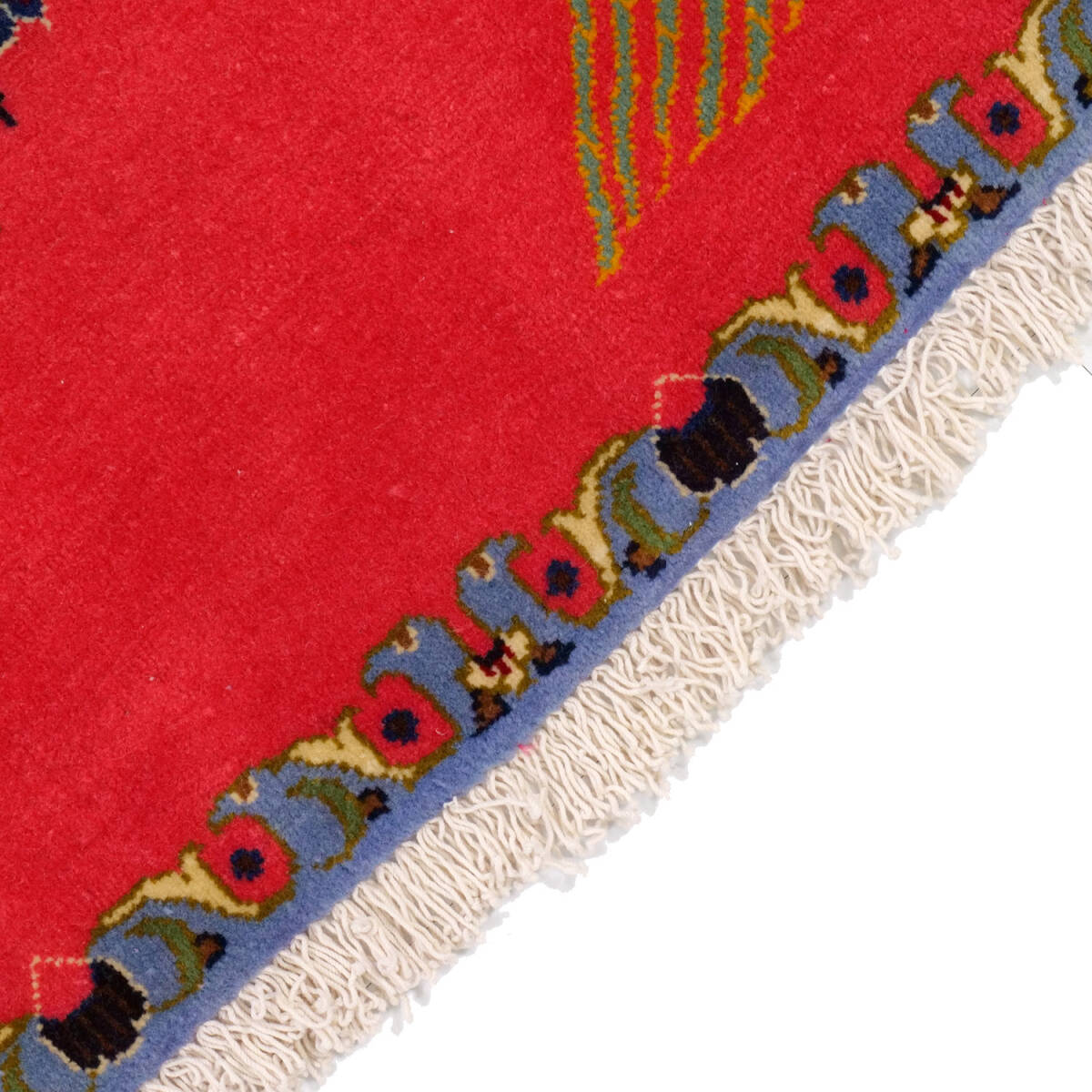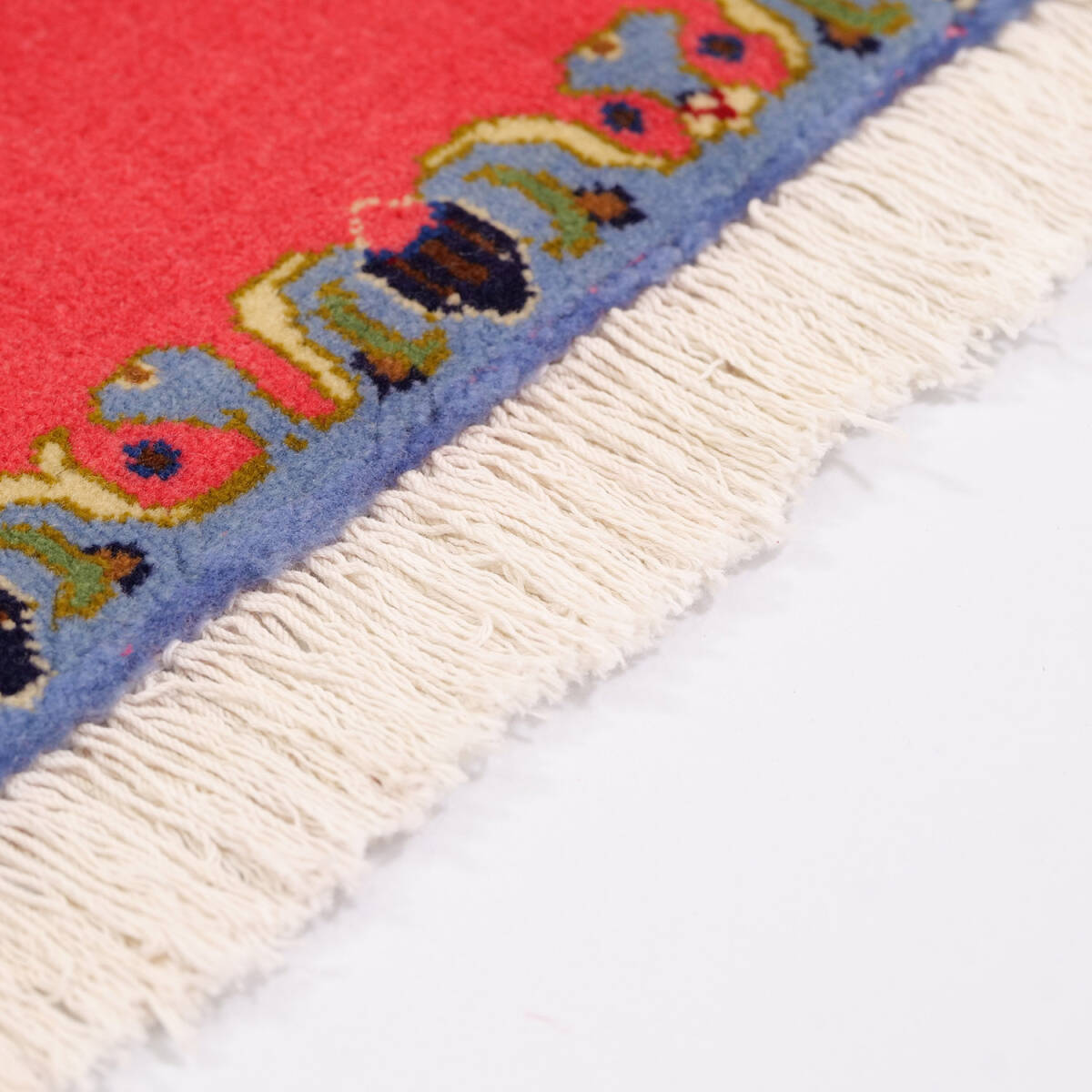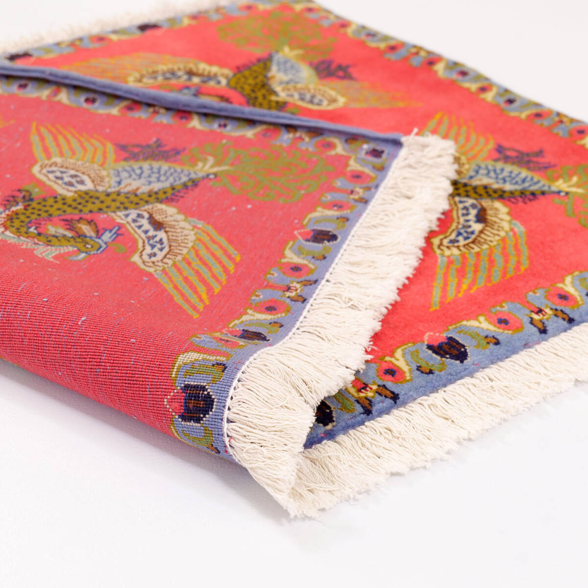 大胆な赤を背景に、ブルーやゴールド、モスグリーンの色調が緻密に織り上げられ、視覚的な迫力と繊細さが共存しています。鳥の尾羽の曲線や羽ばたきの動きまで丁寧に描かれており、観賞価値の高い一枚です。
