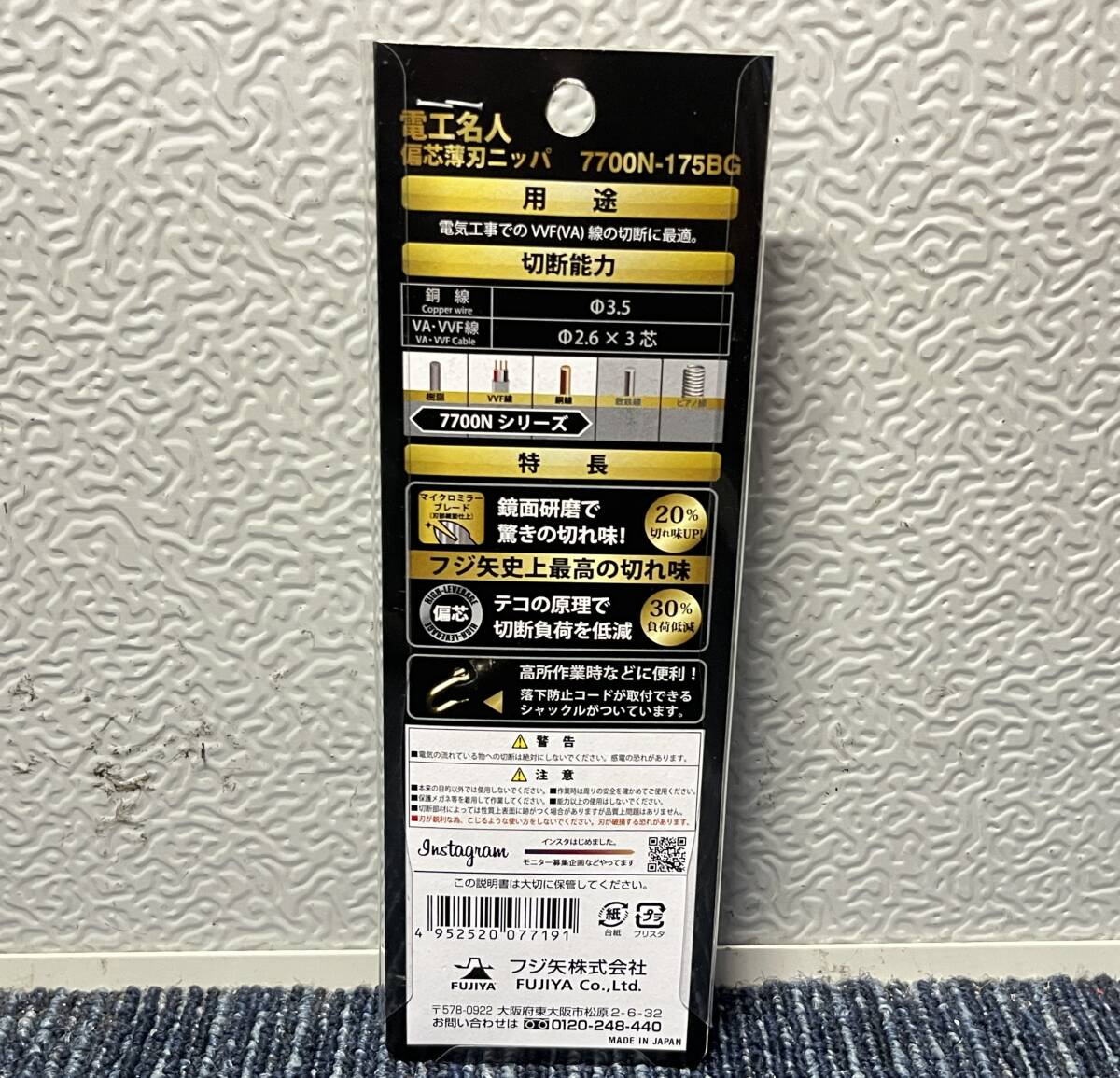 【新品未使用品】FUJIYA フジ矢 KUROKIN 電工名人 偏芯薄刃ニッパ 7700N-175BG 175mm 9919