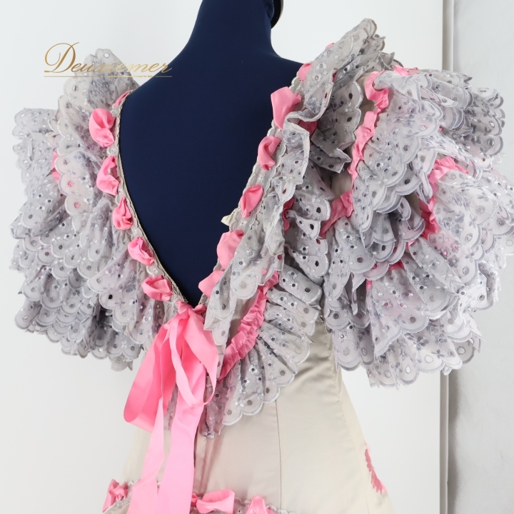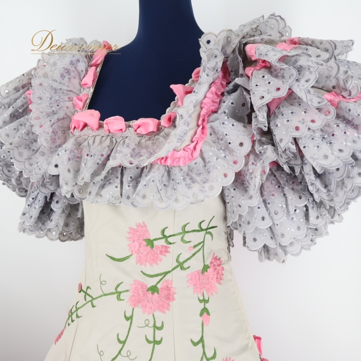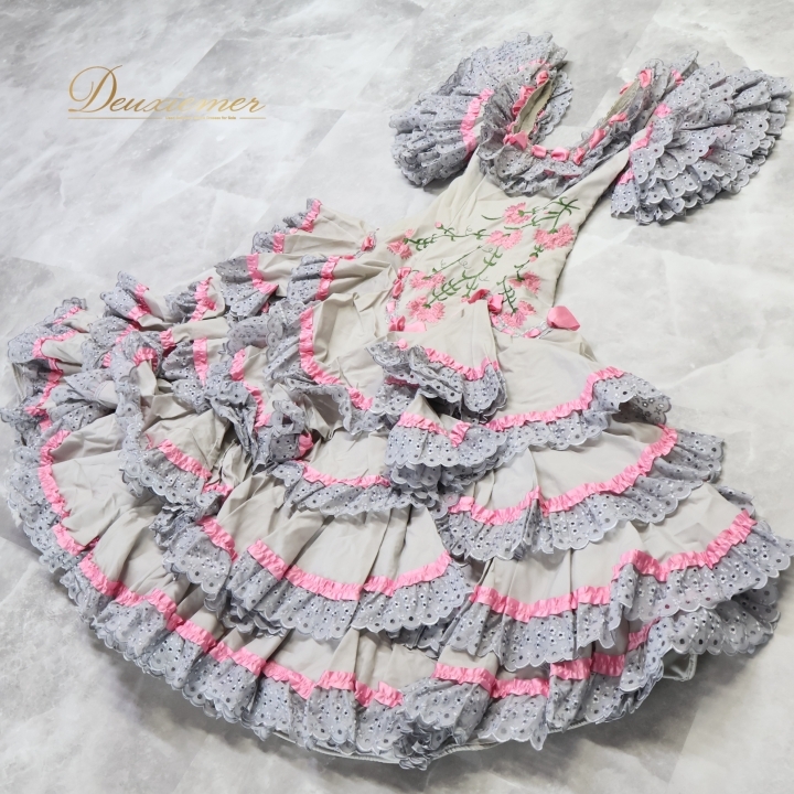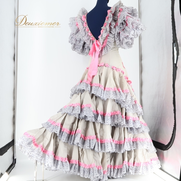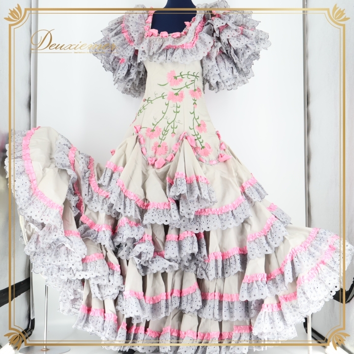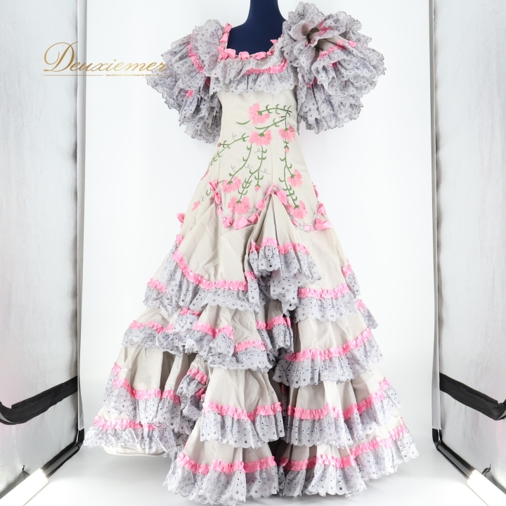 | 【商品名】フラメンコ 衣装 ワンピース ドレス 【サイズ】40表記 平置き実測:総丈約143cm(裾~肩部まで)、身幅約45cm、ウエスト約34cm ※実測の為、多少の誤差はご了承ください 【仕様】 ・背面ファスナー仕様 ・伸縮性無し ・肩パッド無し ・胸パッド無し ------------------------------------ 【ポイント】 ▽グレー×ピンクのかわいい色味 ▽梯子リボンがキュートなデザイン ▽段々のボリュームのあるフリル ▽スペイン製 ------------------------------------ 【撮影時使用トルソー】 種 類:女性用トルソー9号 (一般的に使用されるサイズです) サイズ:肩幅約37cm、バスト約88cm、ウエスト約66cm、ヒップ約89cm |