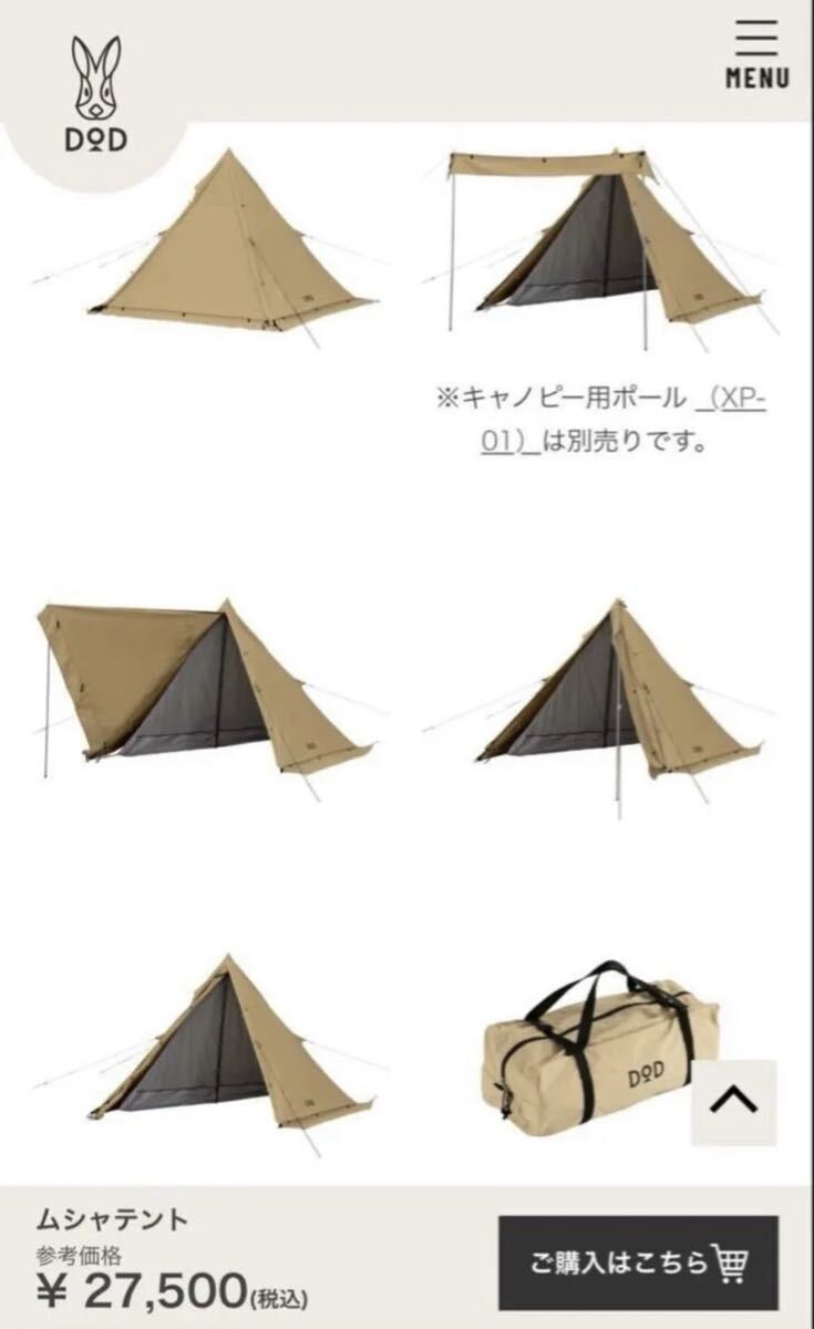 フライシート、インナーテント、ポール×1本、ペグ×13本、ロープ×7本(5本はテントに取り付け済)、キャリーバッグ、キャリーバッグ(ポール入れ)、キャリーバッグ(ペグ入れ)、タイベルト×2本