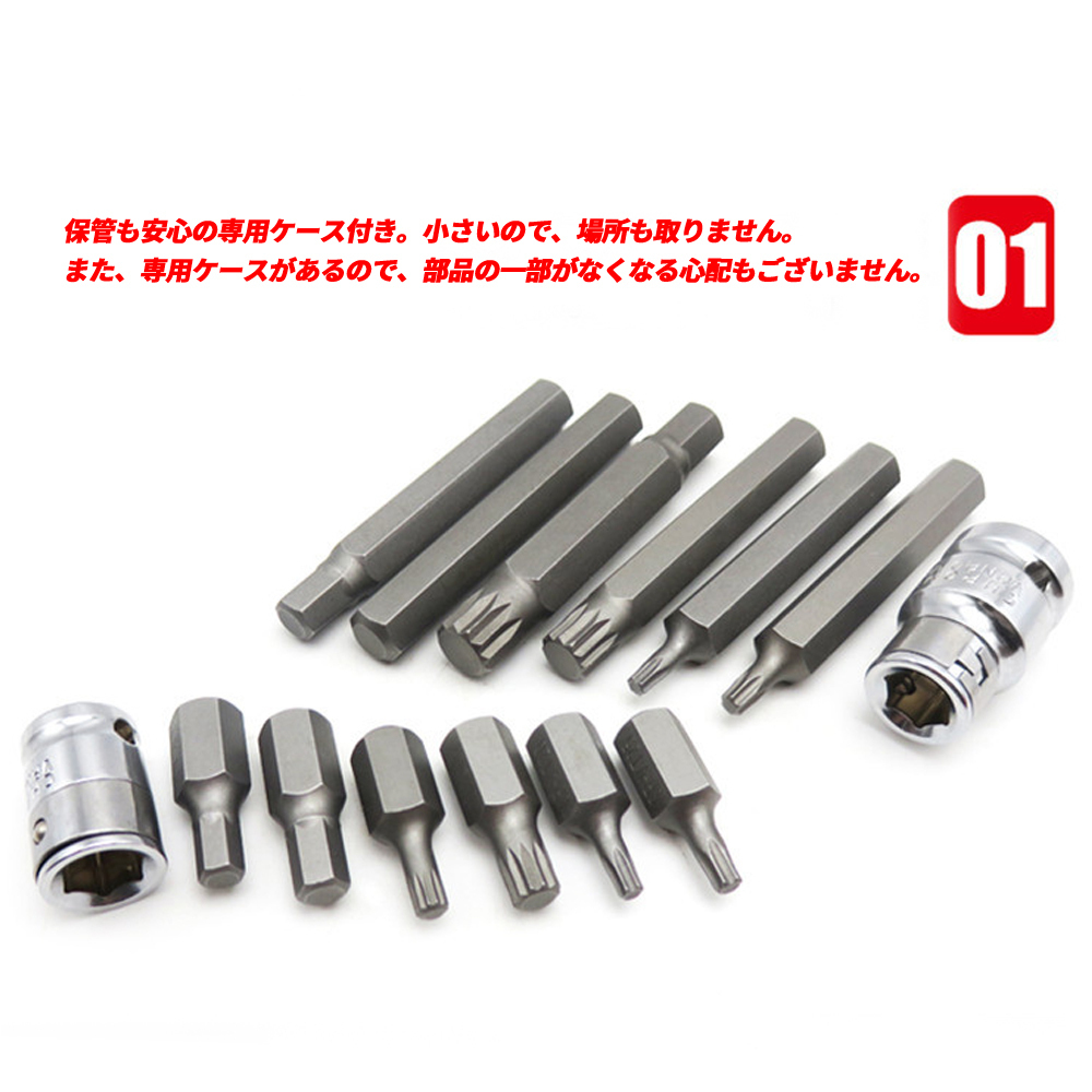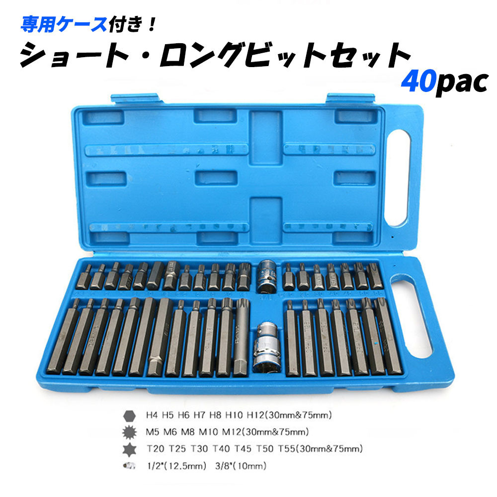 | 自動車整備、バイク整備によく使用されている形状のビットセット トルクス(星型)、ヘックス(6角)、トリプルスクエア(12角)の主要サイズをおさえた充実のビットセット!! 3.5cmのショートと7.5cmのロングでどのような場面でも活躍できます! どのサイズを買えばいいかわからない...など悩んだ場合はこちらの商品があればいろいろな場面で活躍! 入門用にもおすすめなセットとなります! 専用ケースは厚さ3.8cmなので収納にも困りません! 【商品詳細】 ■ケースサイズ W330×D135×H38mm(約) ■商品内容:全40個 ショート(3cm):ヘックス(6角) :H4 / H5 / H6 / H7 / H8 / H10 / H12 トルクス(星形) :M5 / M6 / M8 / M10 / M12 トリプルスクエア(12角):T20 / T25 / T30 / T40 / T45 / T50 / T55 ロング(7.5cm):ヘックス(6角) :H4 / H5 / H6 / H7 / H8 / H10 / H12 トルクス(星形) :M5 / M6 / M8 / M10 / M12 トリプルスクエア(12角):T20 / T25 / T30 / T40 / T45 / T50 / T55 ビットホルダー:1/2ビットホルダー×1 / 3/8ビットホルダー×1 ※こちらの商品は宅配便サイズになります。 |