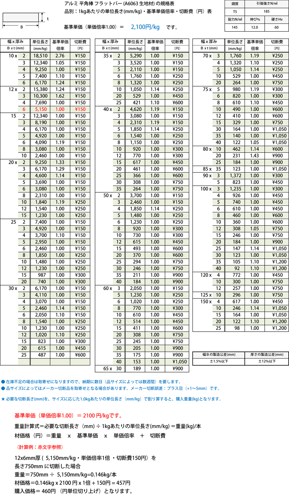 ★ また他品種形状材で任意寸法の切り売り価格や重量・送料等を求めたい場合は