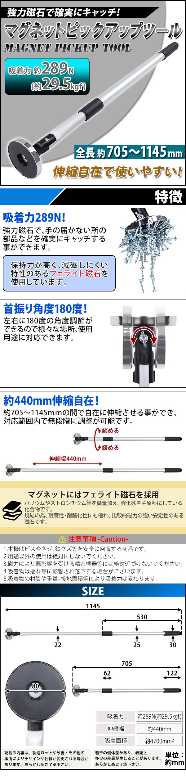 | 商品名 | 送料無料 マグネット ピックアップツール 伸縮自在 フェライト磁石 吸着力約289N 約29.5kgf Φ80mm 直径80mm 伸縮幅約440mm 全長約705~1145mm マグネットスイーパー ハンドマグネットキャッチャー 強力 大型 フェライトマグネット マグネットツール 磁石 magnetpick5065 |