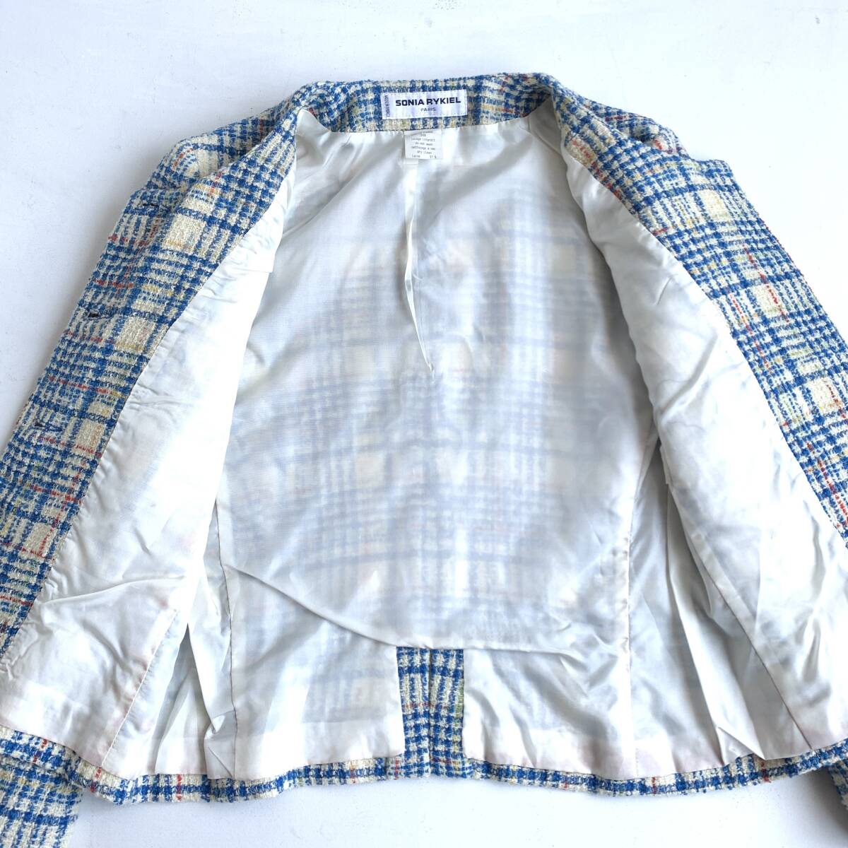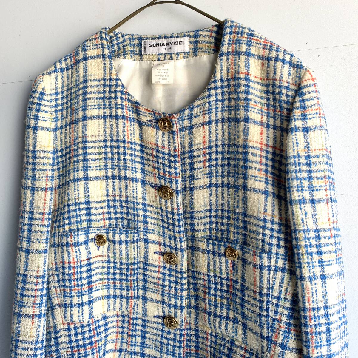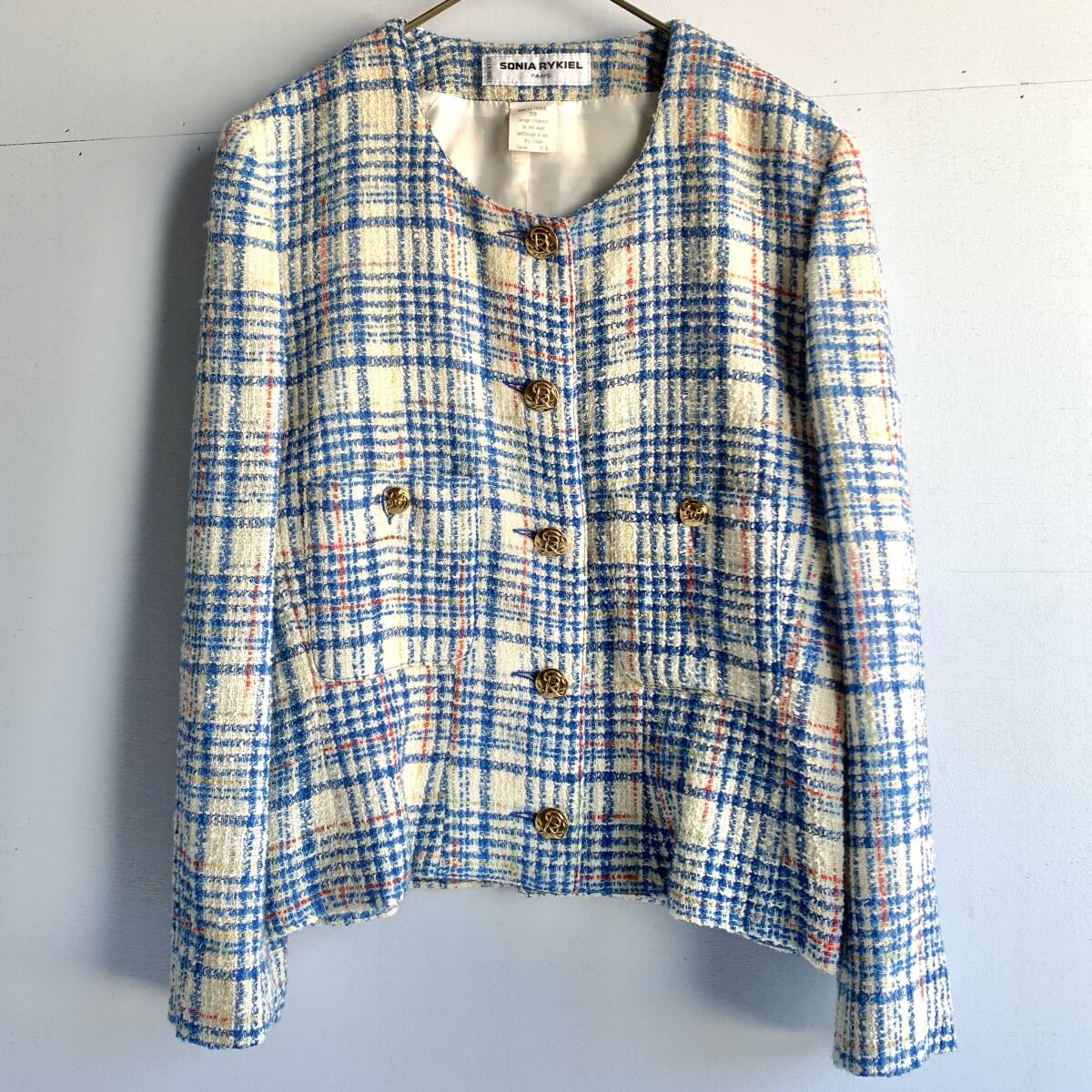 ☆希少 SONIA RYKIEL ソニアリキエル Vintage フランス製 チェック ツイードノーカラージャケット 金ボタン size38【送料一律/同梱可能】I